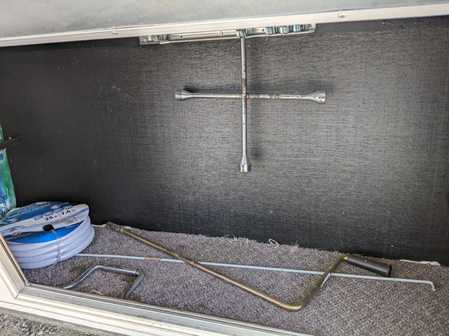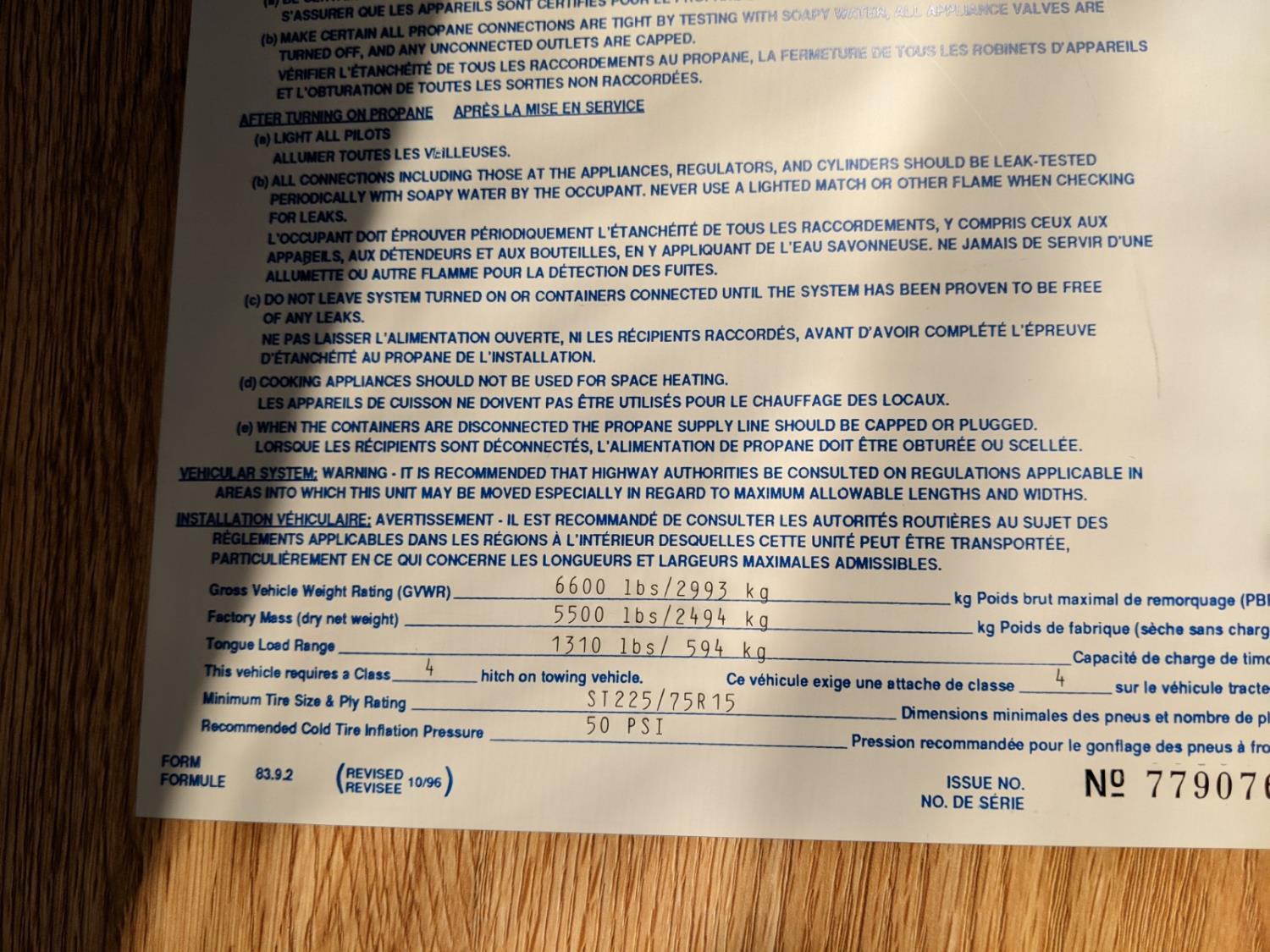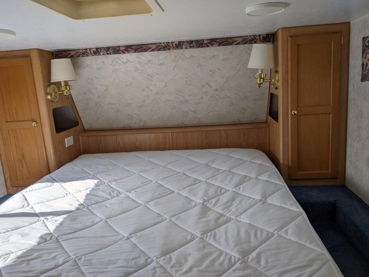 Sleeps 4, stove, fridge, microwave, full bath, master bedroom, A/C, manual awning, power levelling jacks, spring suspension, electric brakes, 225/75R15 tires