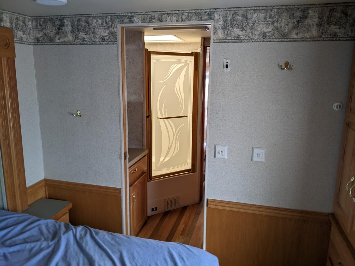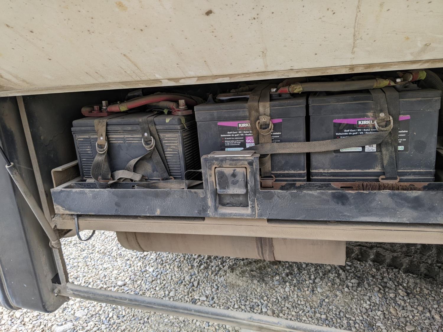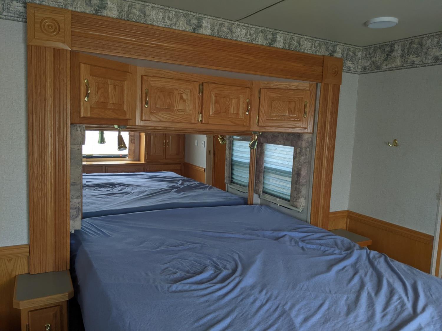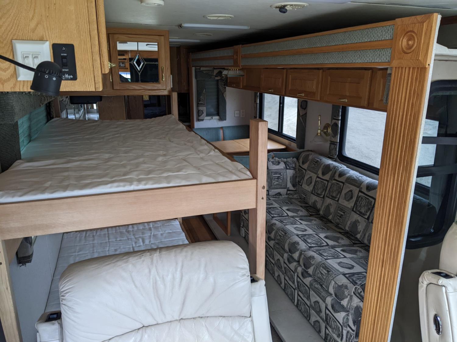 CAT 330 engine, 12,000 lb front, 19,000 lb rear axles, hydraulic stabilization legs, 2 slides, Suburban gas furnace, Suburban gas HWH, Atwood gas range, Domtec fridge, Generac generator, AC, Microwave, washer/dryer, custom built bunk beds, queen bed, 3 piece bathroom, front tires 275/70R22.5, rear dually