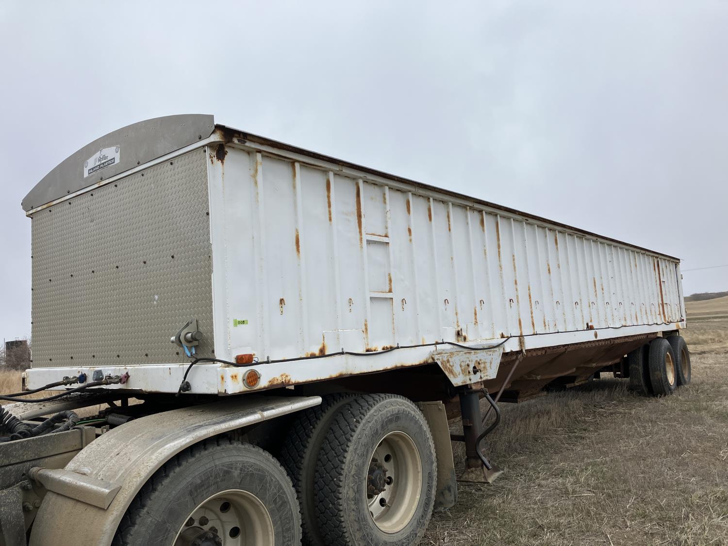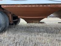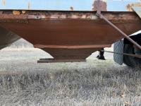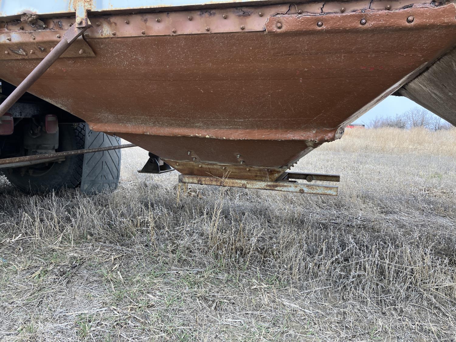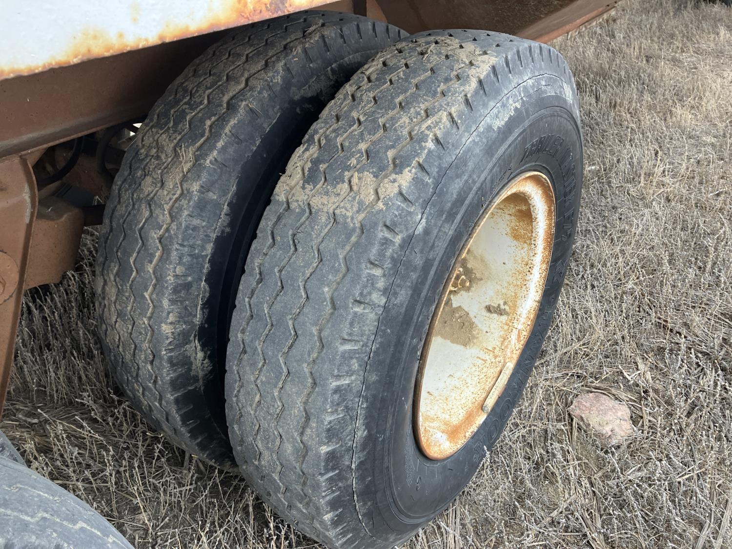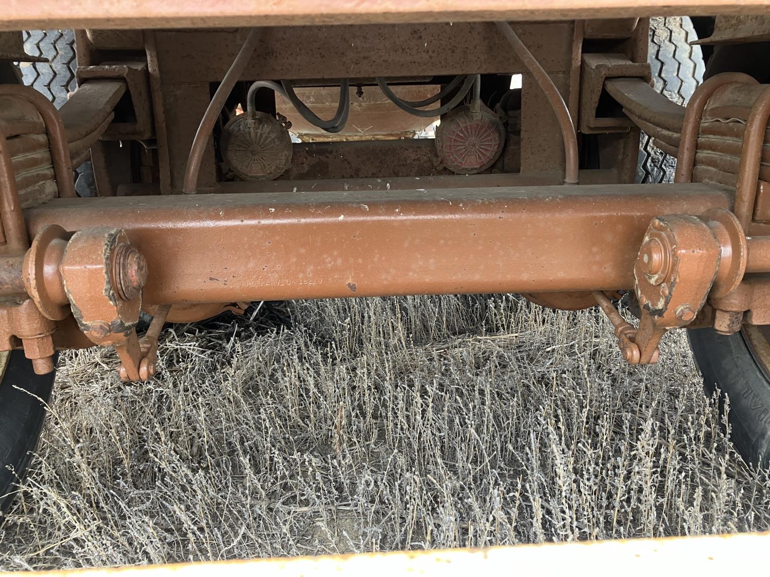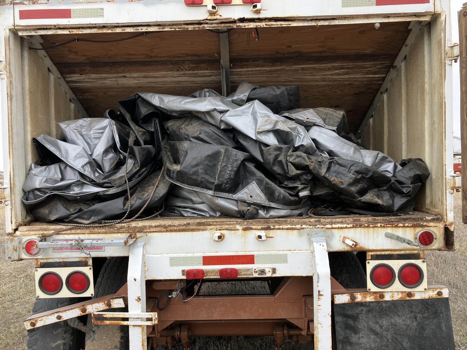 Steel sides, fiberglass hoppers, rear barn door storage compartment, tarp, spring suspension, single acting brake pots, 10.00-20 tires