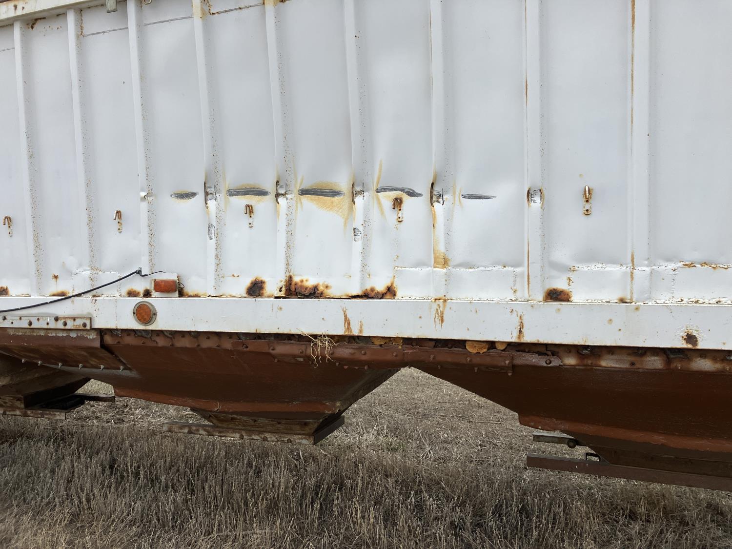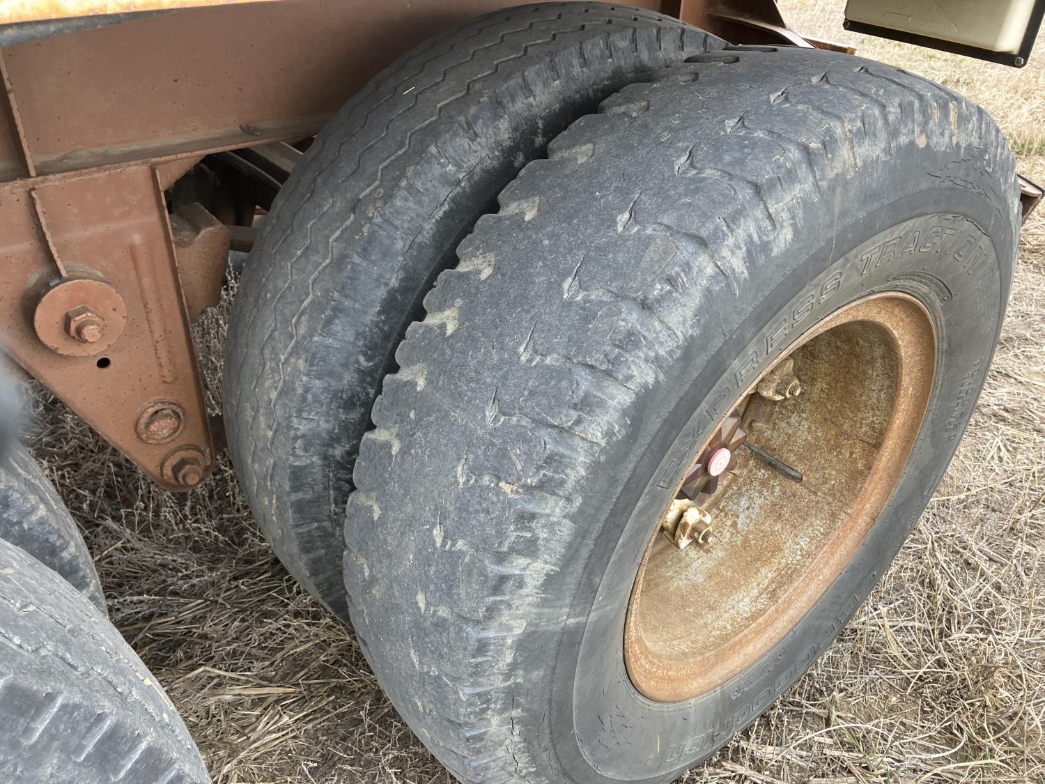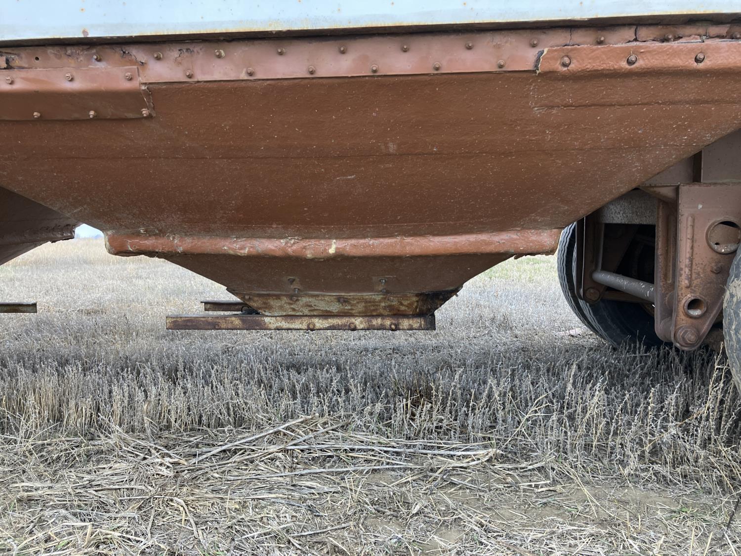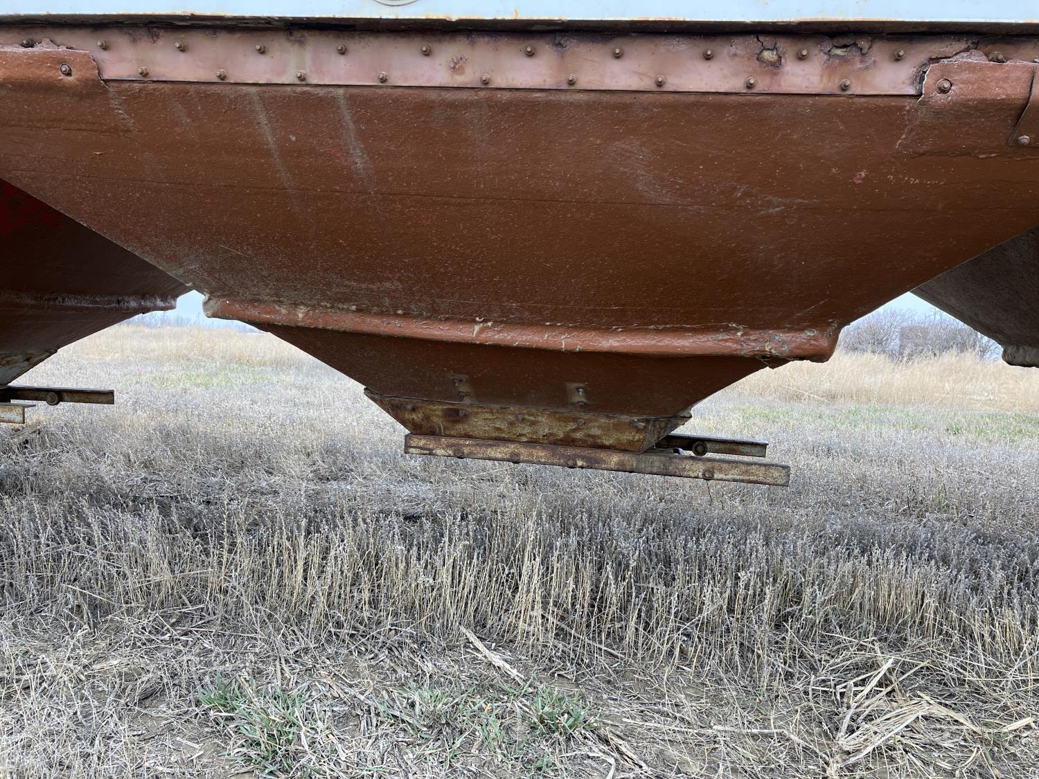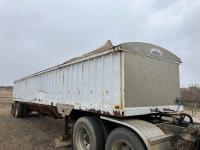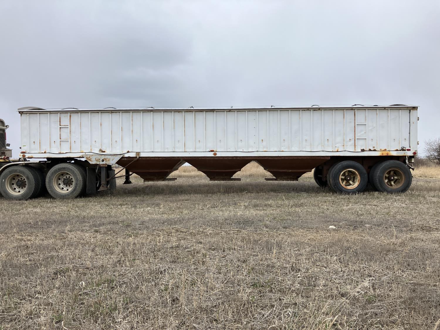 Steel sides, fiberglass hoppers, rear barn door storage compartment, tarp, spring suspension, single acting brake pots, 10.00-20 tires
