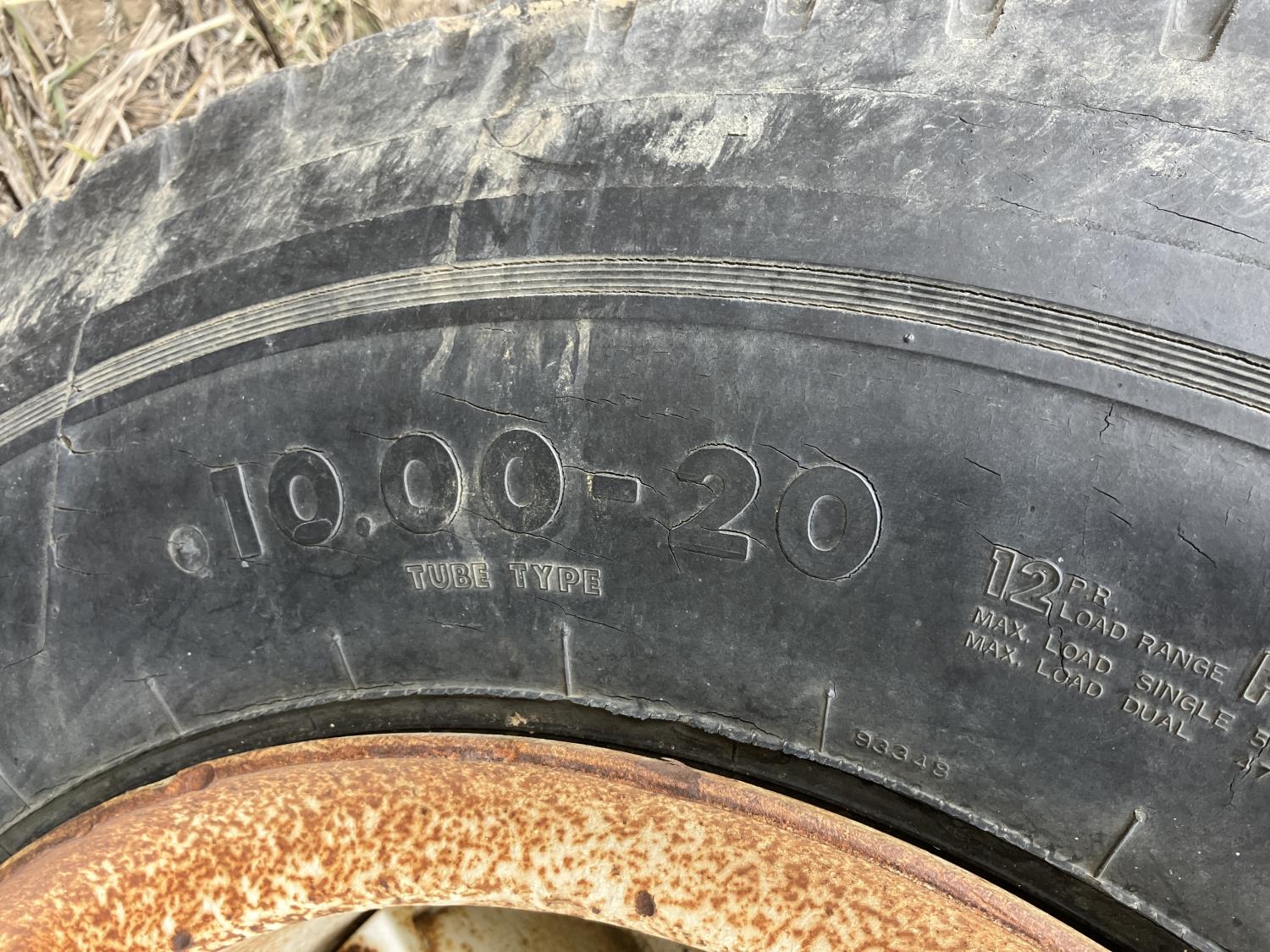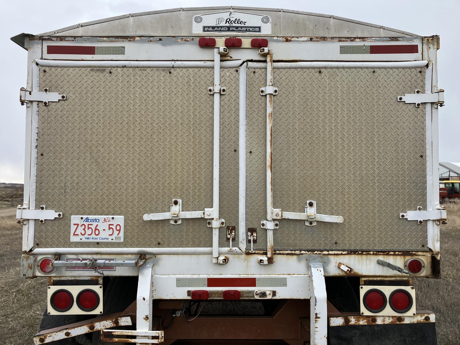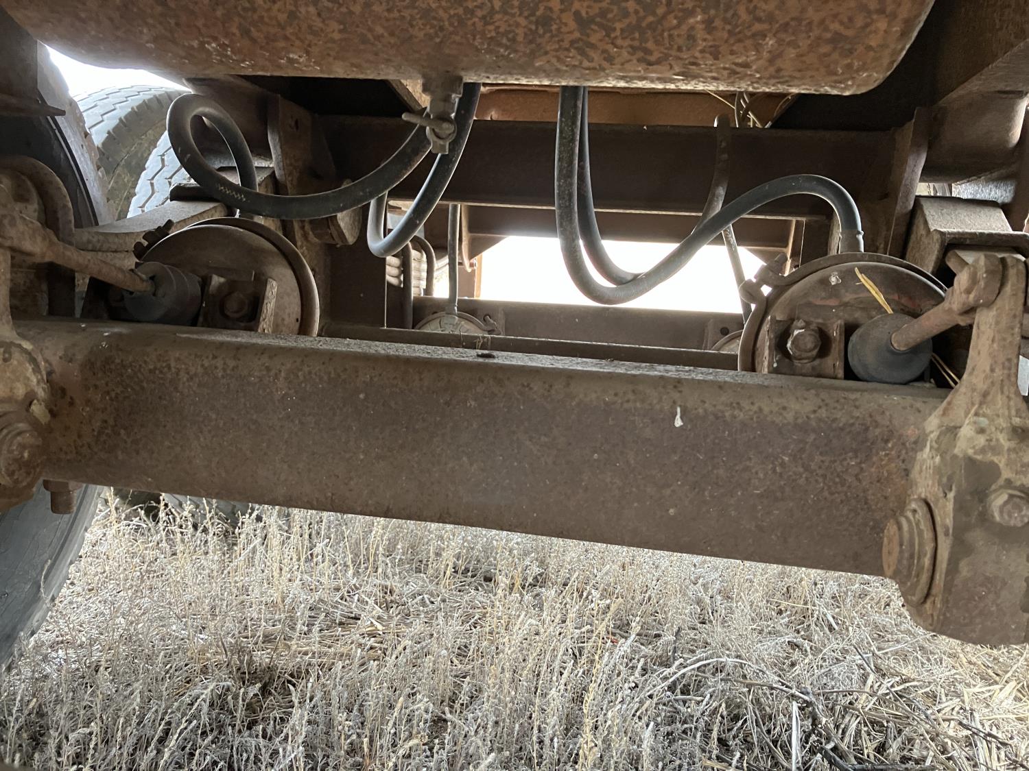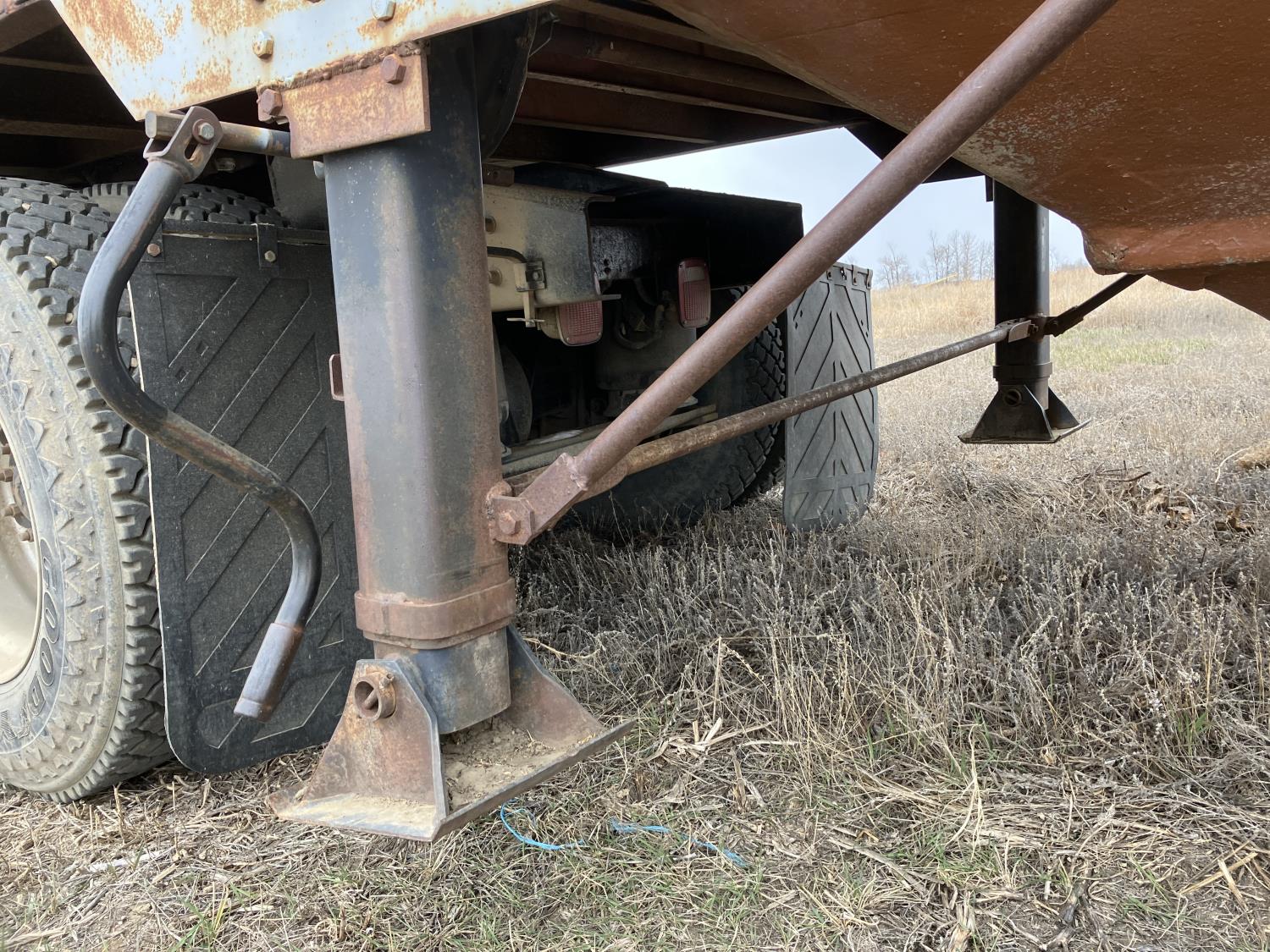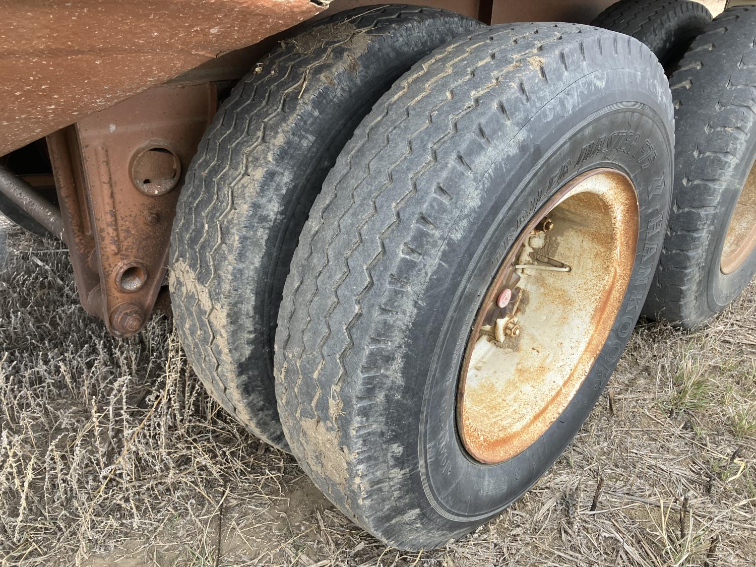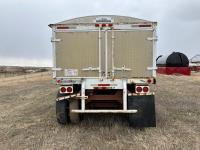 Steel sides, fiberglass hoppers, rear barn door storage compartment, tarp, spring suspension, single acting brake pots, 10.00-20 tires