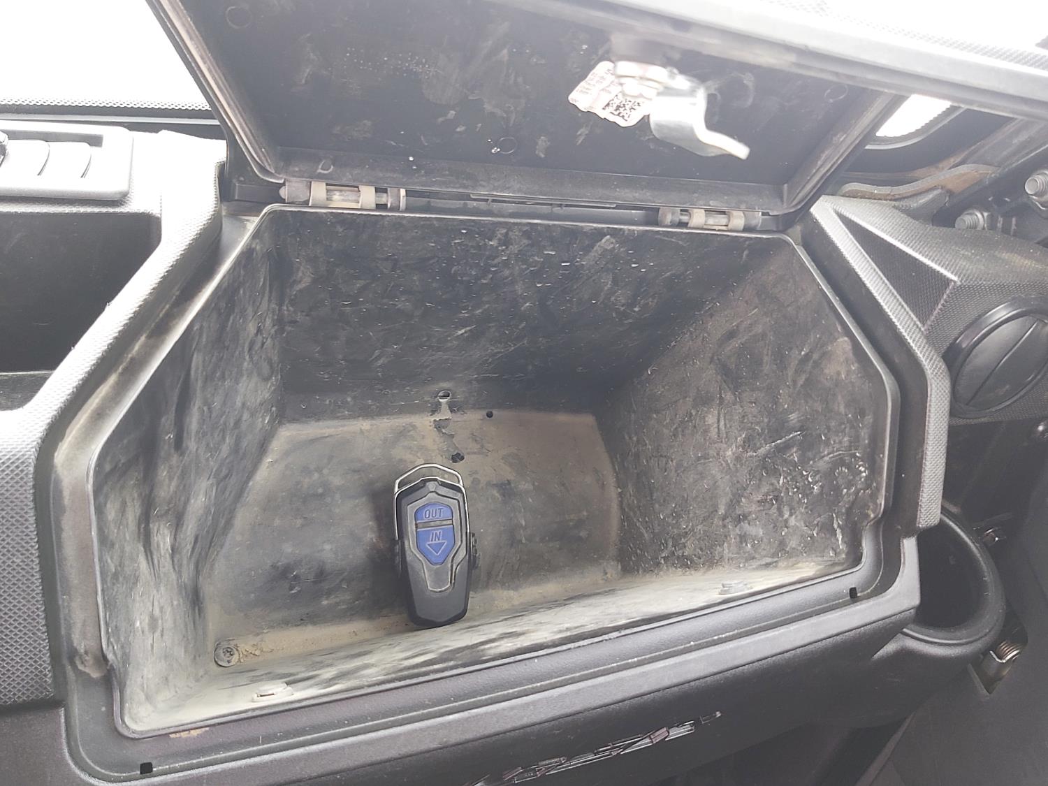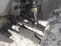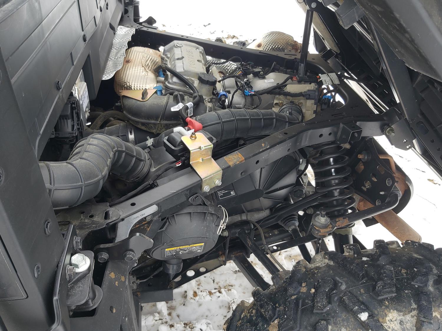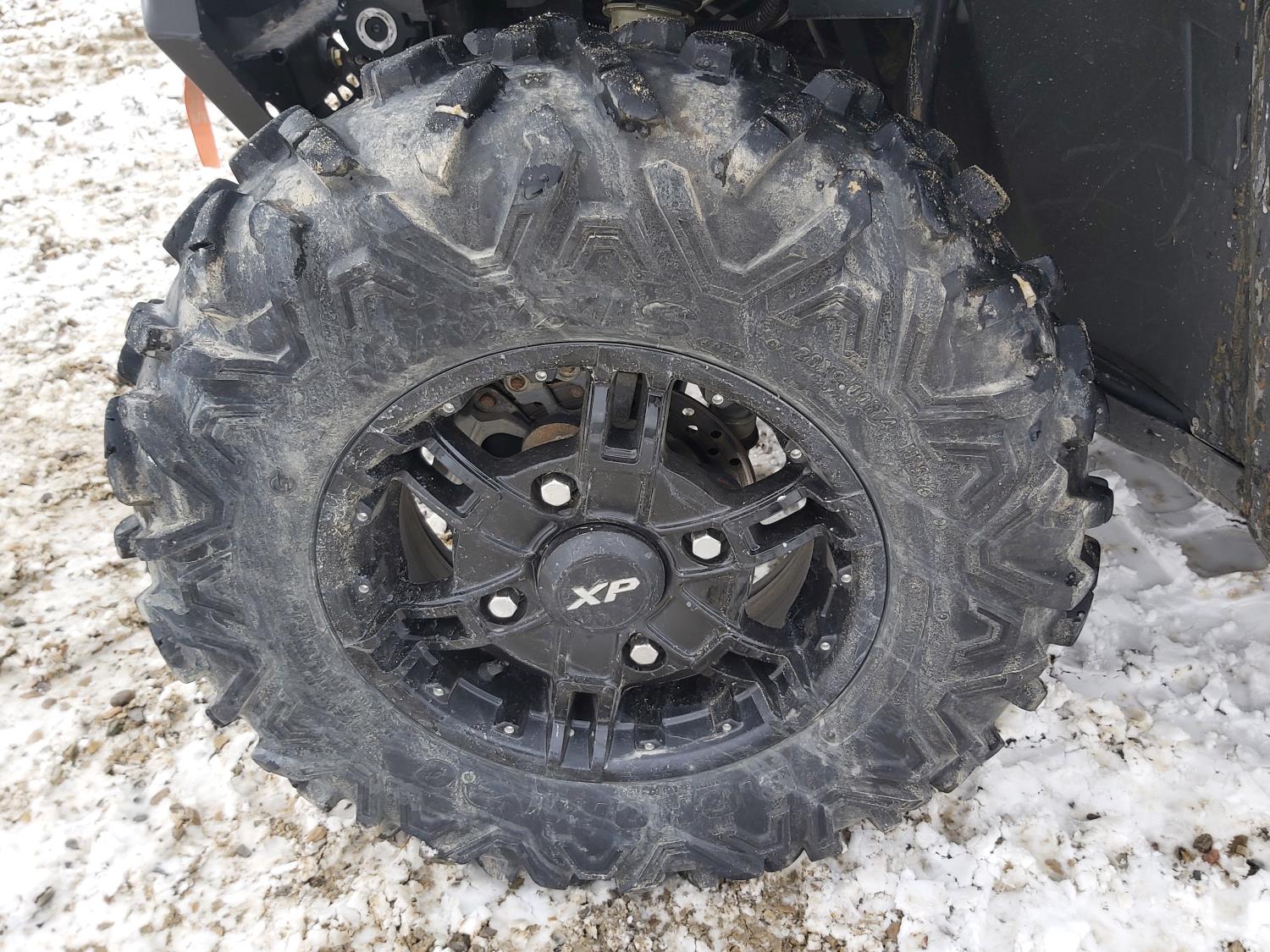 1000 cc fuel injected water cooled engine, automatic transmission, Hi/Lo range, reverse, enclosed cab, heater, windshield, power steering, front winch, front brush guard, manual dump box, receiver hitch, independent suspension, rear screen, 28X9.00R14 front tires, 28X11.00R14 rear tires