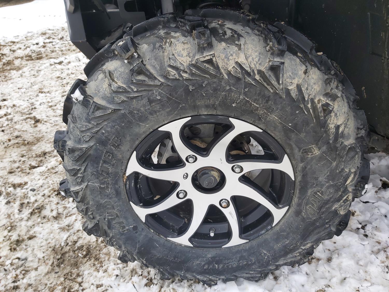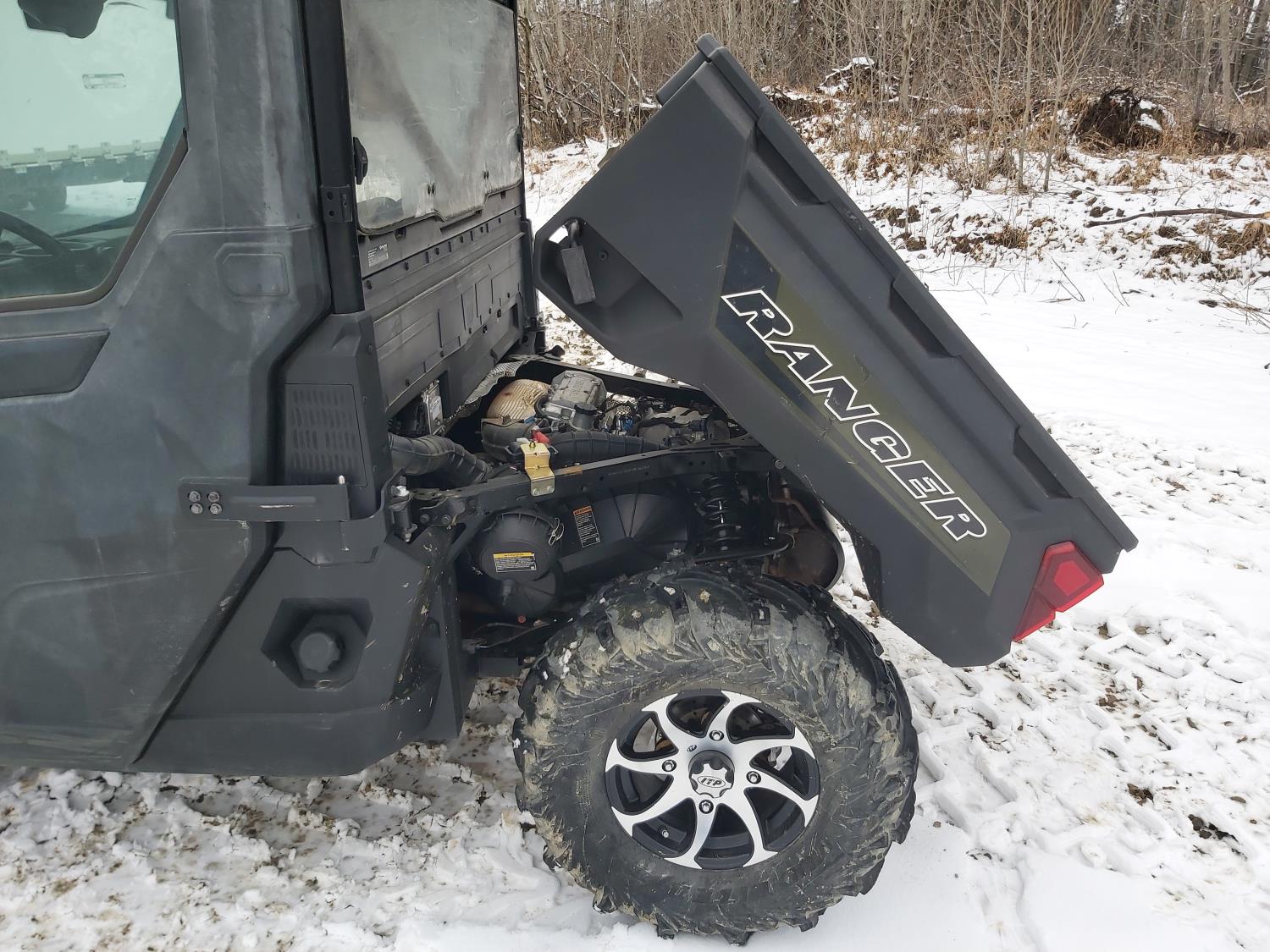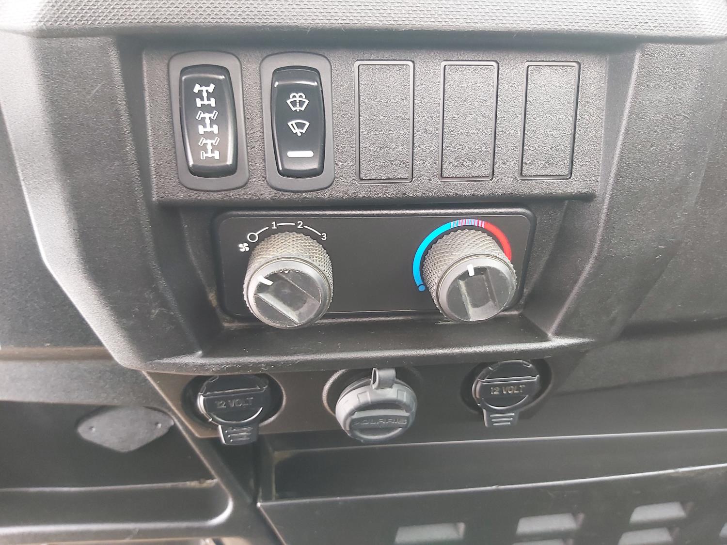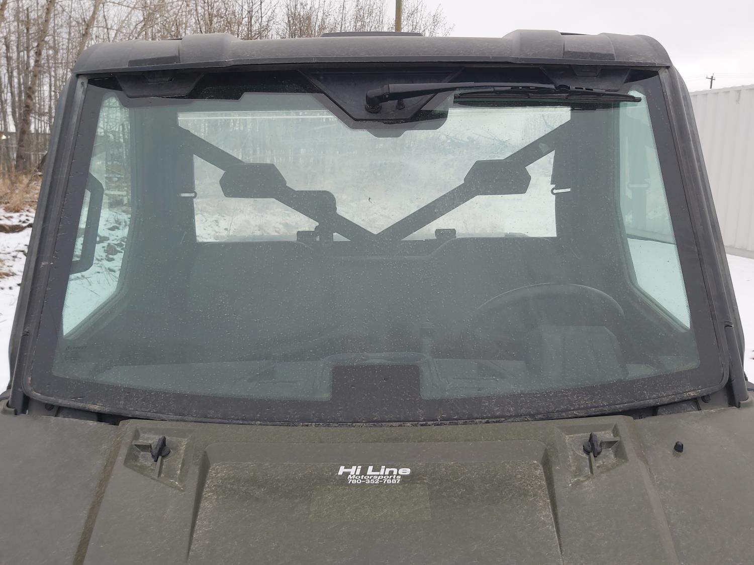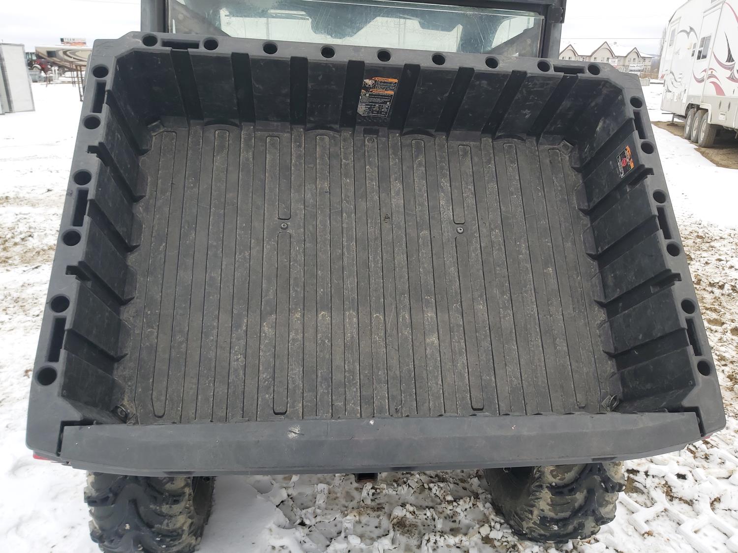 1000 cc fuel injected water cooled engine, automatic transmission, Hi/Lo range, reverse, enclosed cab, heater, windshield, power steering, front winch, front brush guard, manual dump box, receiver hitch, independent suspension, rear screen, 30X9.00-14 front tires, 30X11.00-14 rear tires