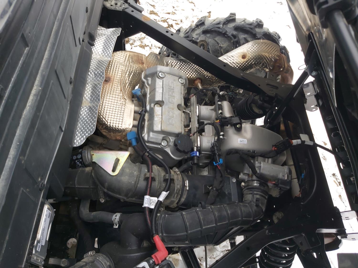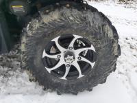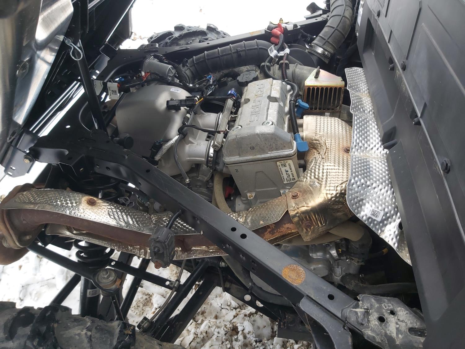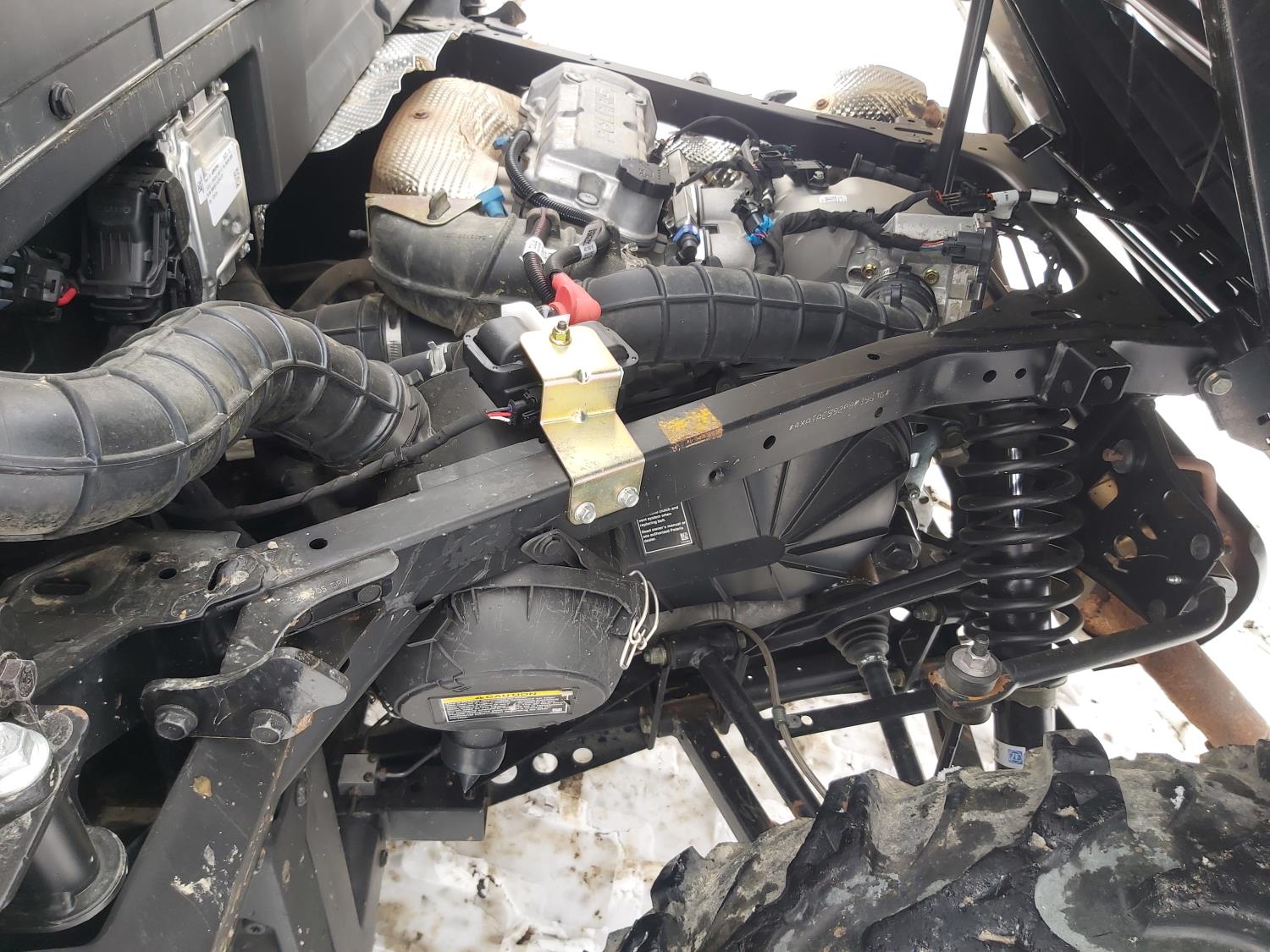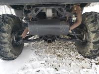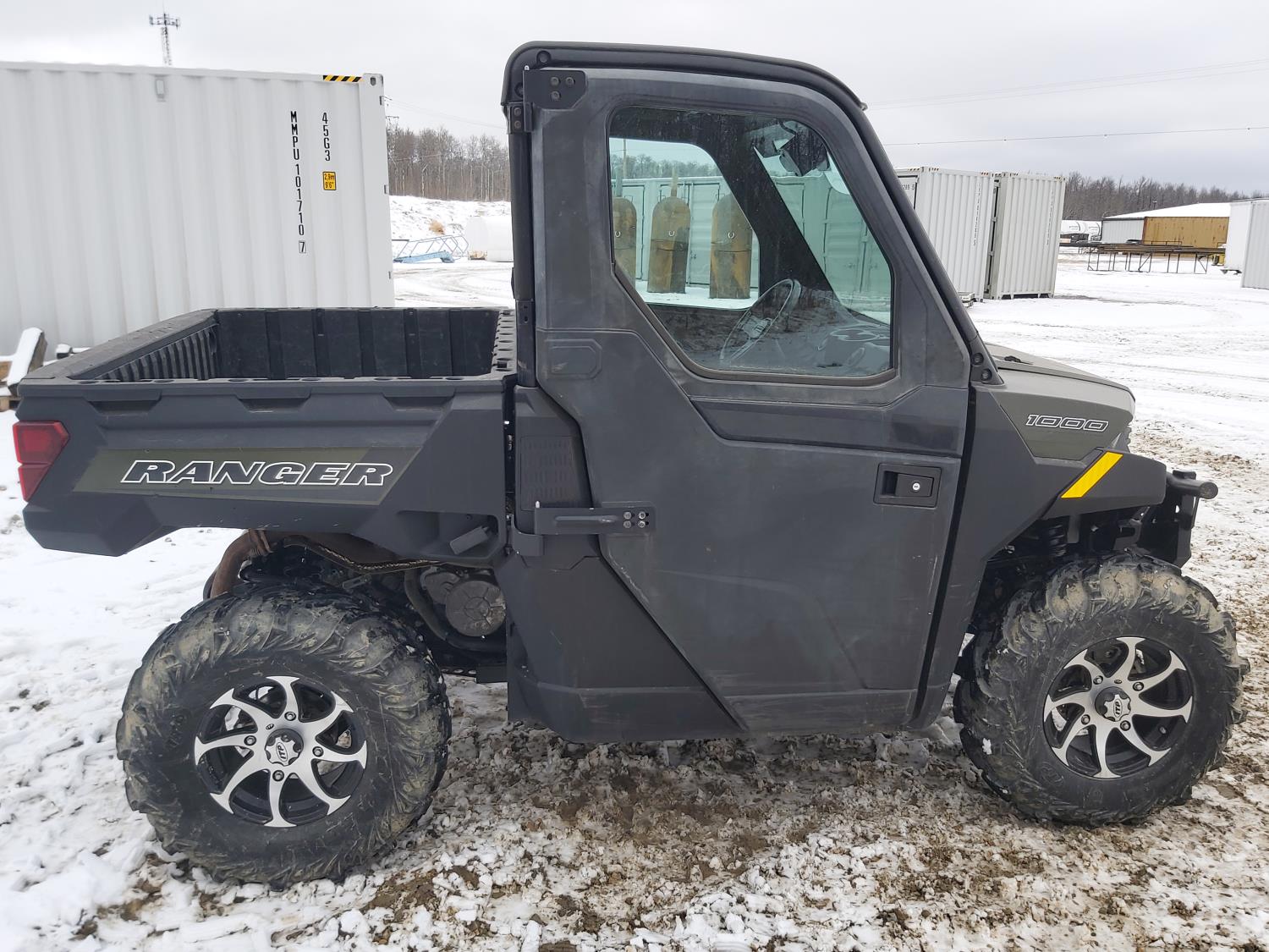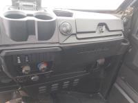 1000 cc fuel injected water cooled engine, automatic transmission, Hi/Lo range, reverse, enclosed cab, heater, windshield, power steering, front winch, front brush guard, manual dump box, receiver hitch, independent suspension, rear screen, 30X9.00-14 front tires, 30X11.00-14 rear tires