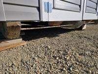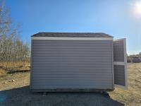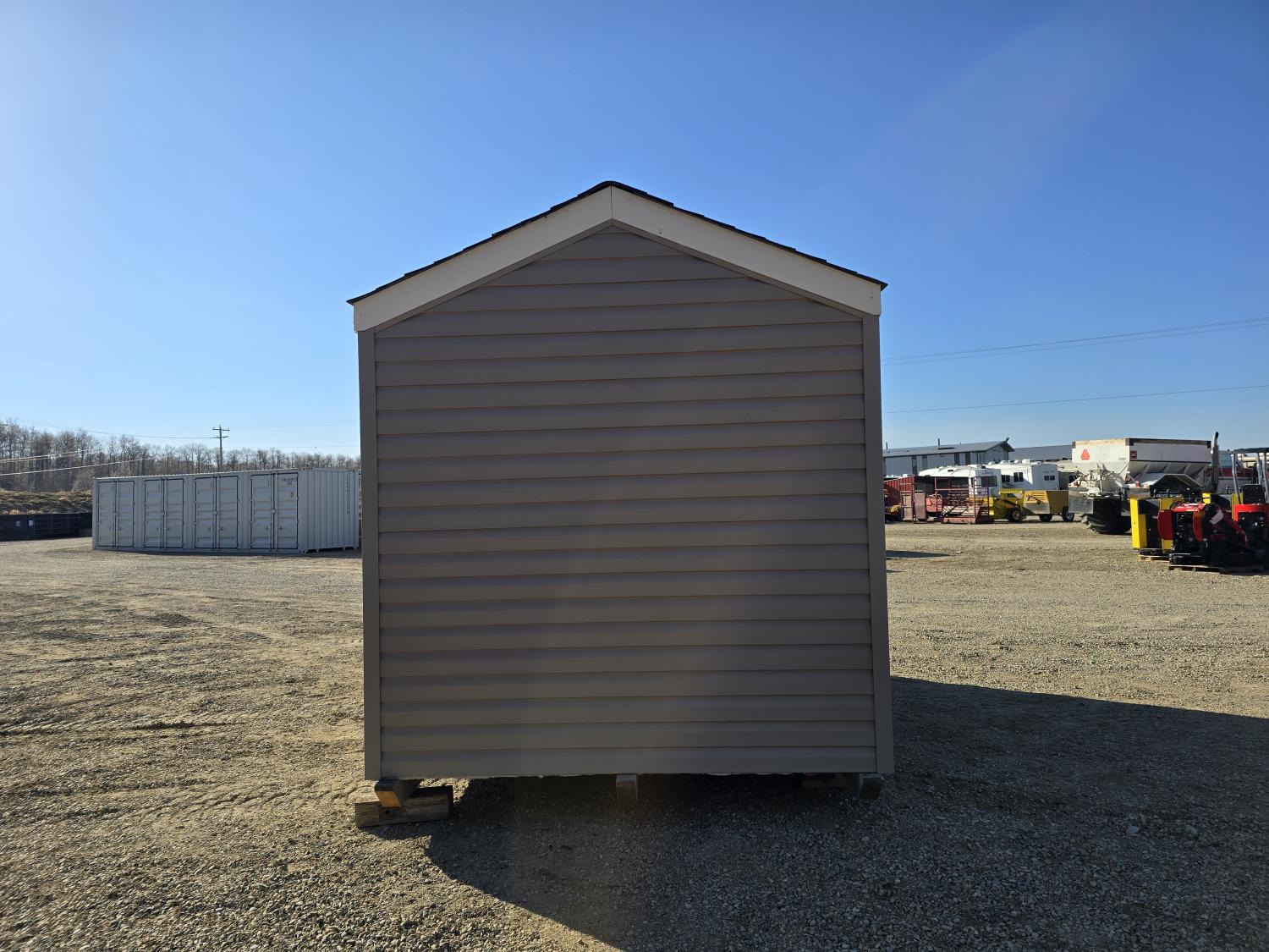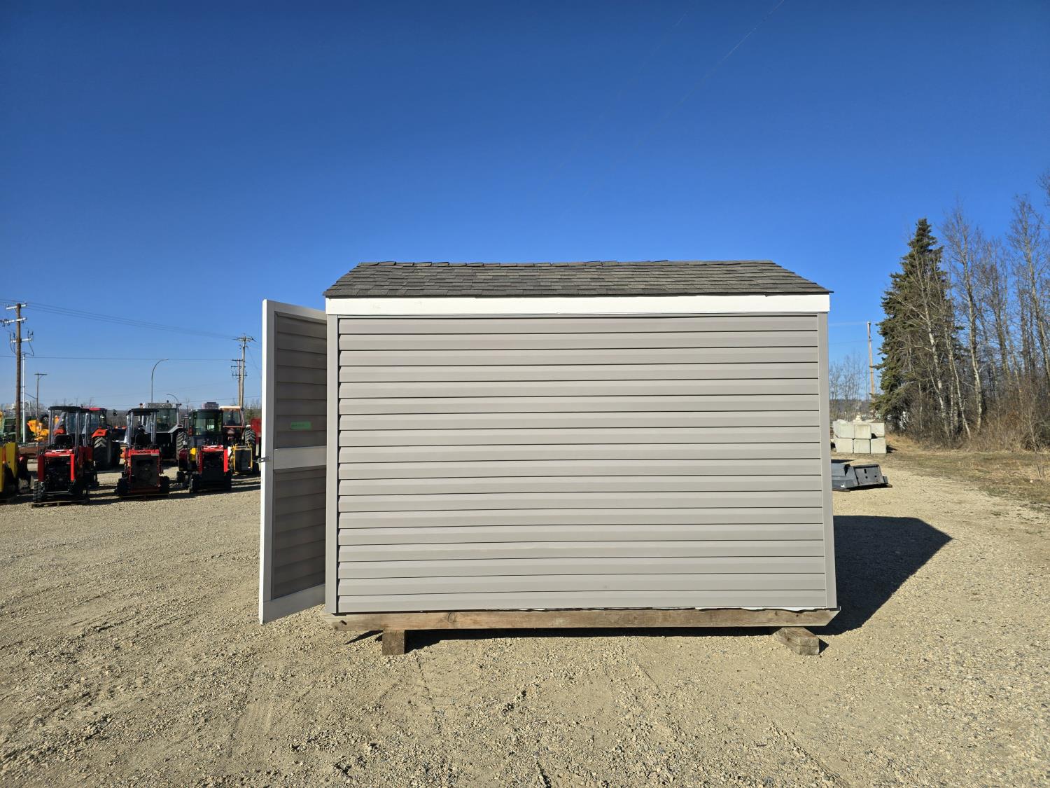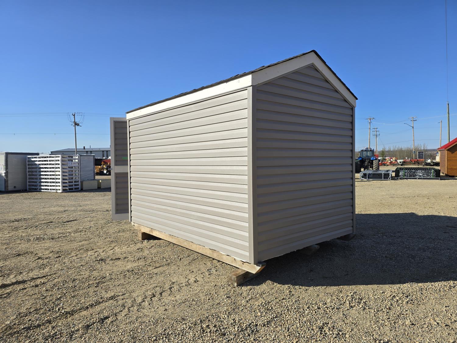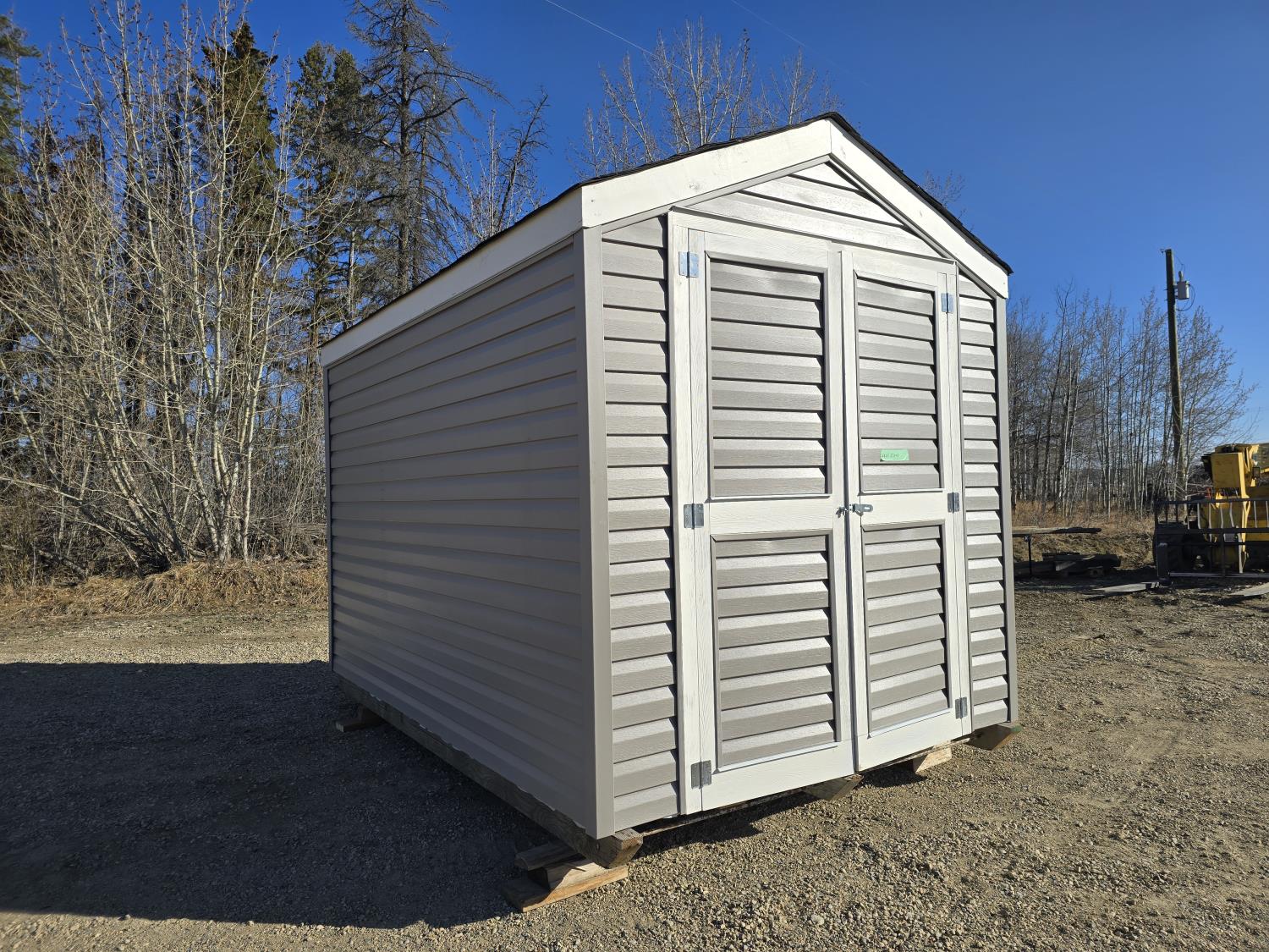 4 inch x 6 inch douglas fir skids, 5 ft x 7 ft double doors, 3/4 inch fir plywood walls & floor, interior has 1 coat of primer & 1 finishing coat, rhino roof membrane and tyvec walls, 30 year shingles, vinyl siding,
