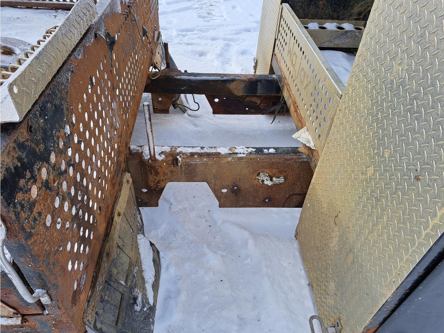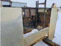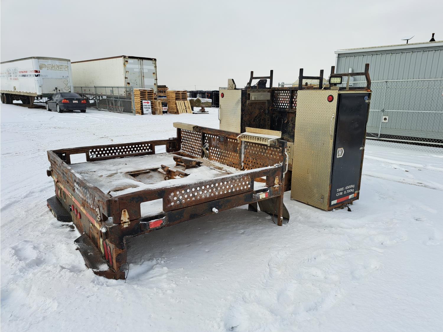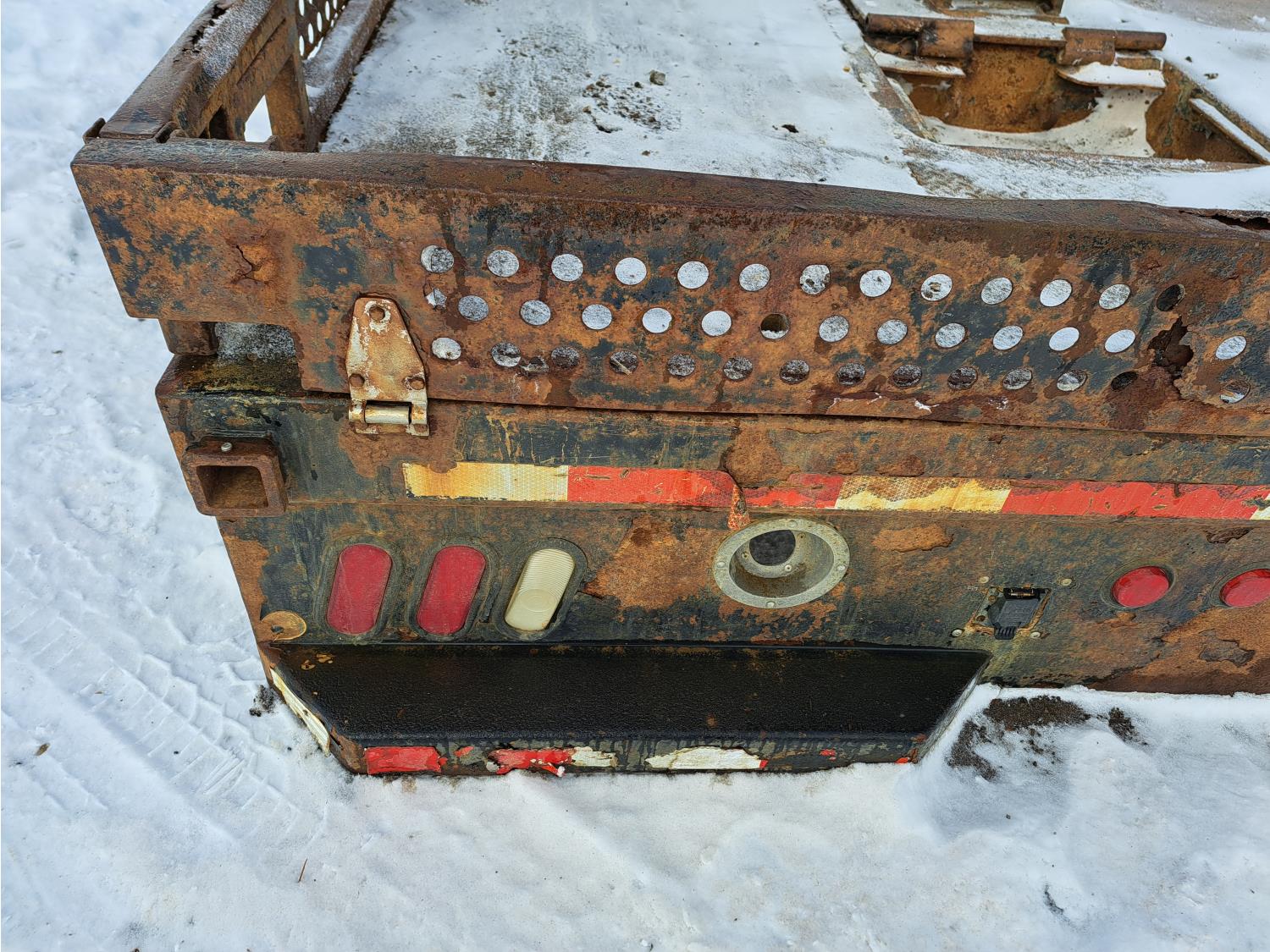 Headache rack, side toolboxes, hinged fold down sides, taillights, (2) work lights, wood deck is 76 long X 94 inch wide, no wood where picker was mounted, flip over 5TH wheel hitch, (2) 24-inch- deep x 27- inch- wide x 60-inch- high toolboxes, fire extinguisher holder