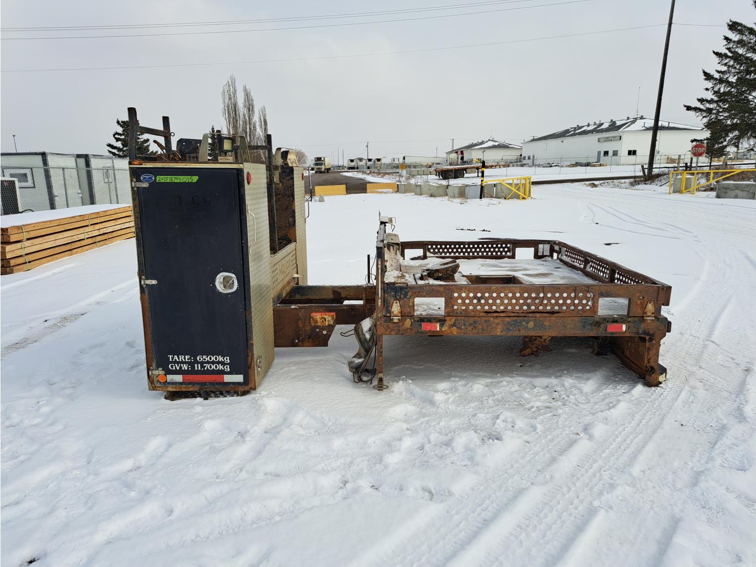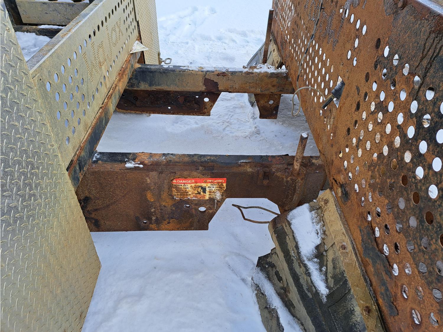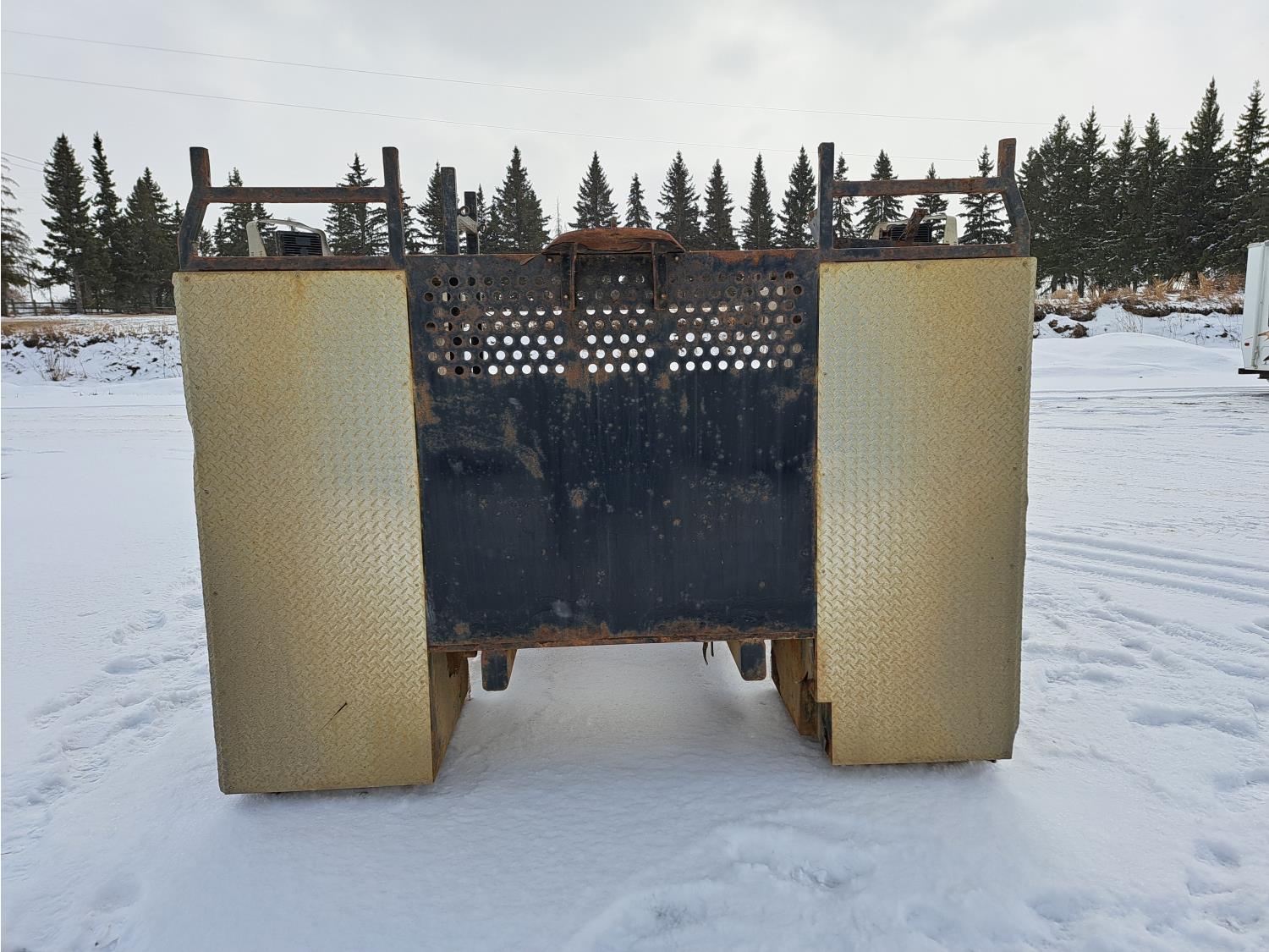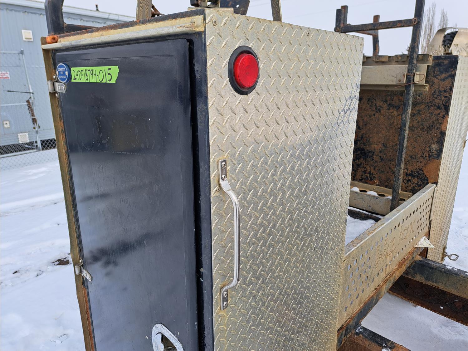 Headache rack, side toolboxes, hinged fold down sides, taillights, (2) work lights, wood deck is 76 long X 94 inch wide, no wood where picker was mounted, flip over 5TH wheel hitch, (2) 24-inch- deep x 27- inch- wide x 60-inch- high toolboxes, fire extinguisher holder