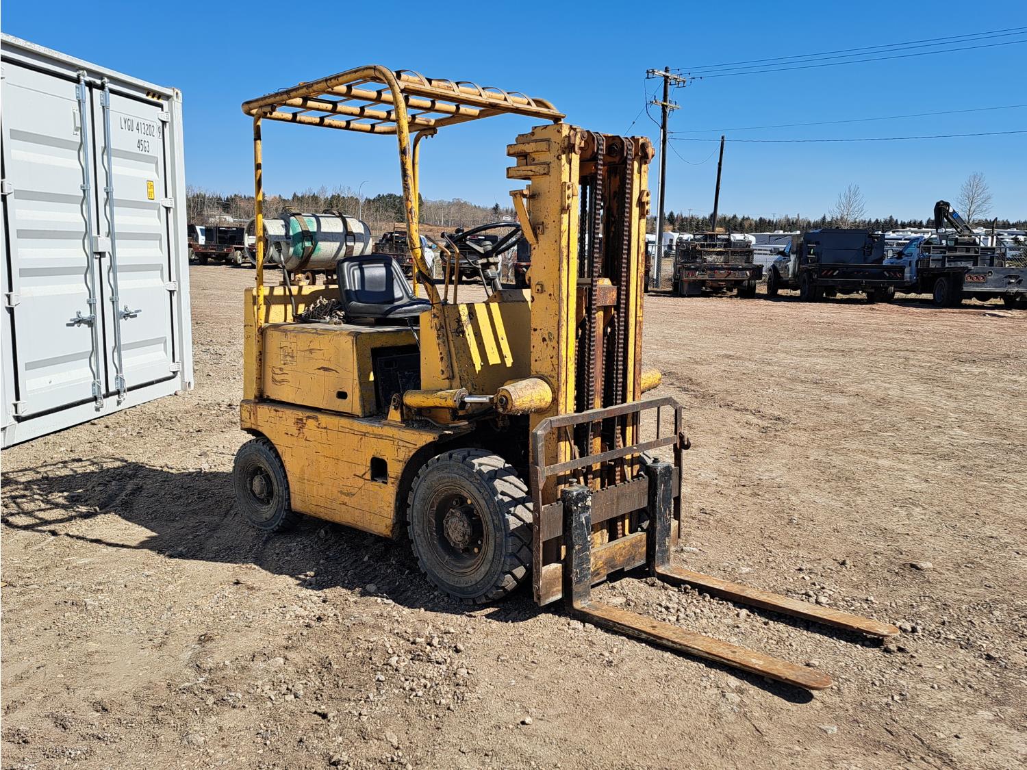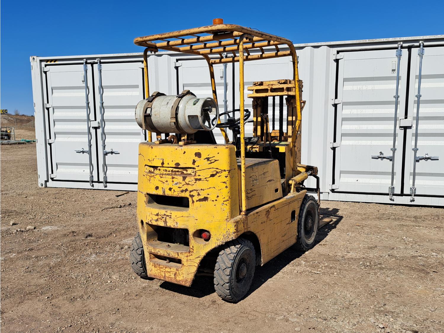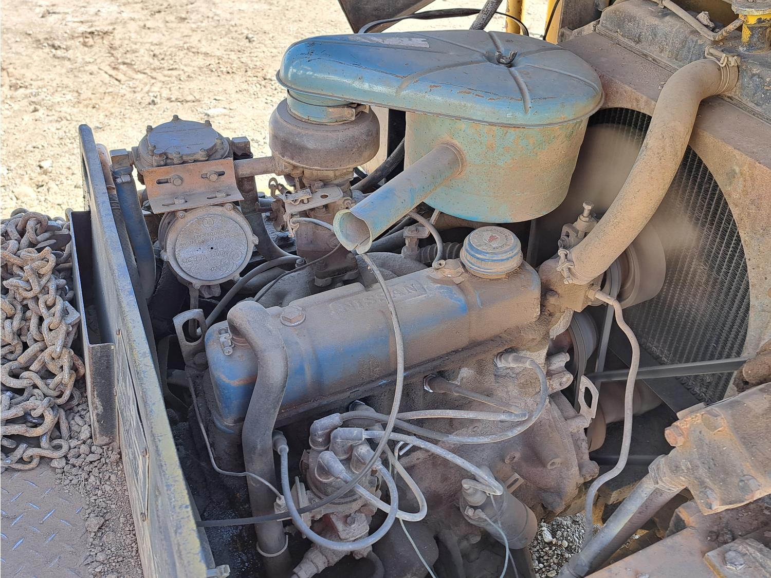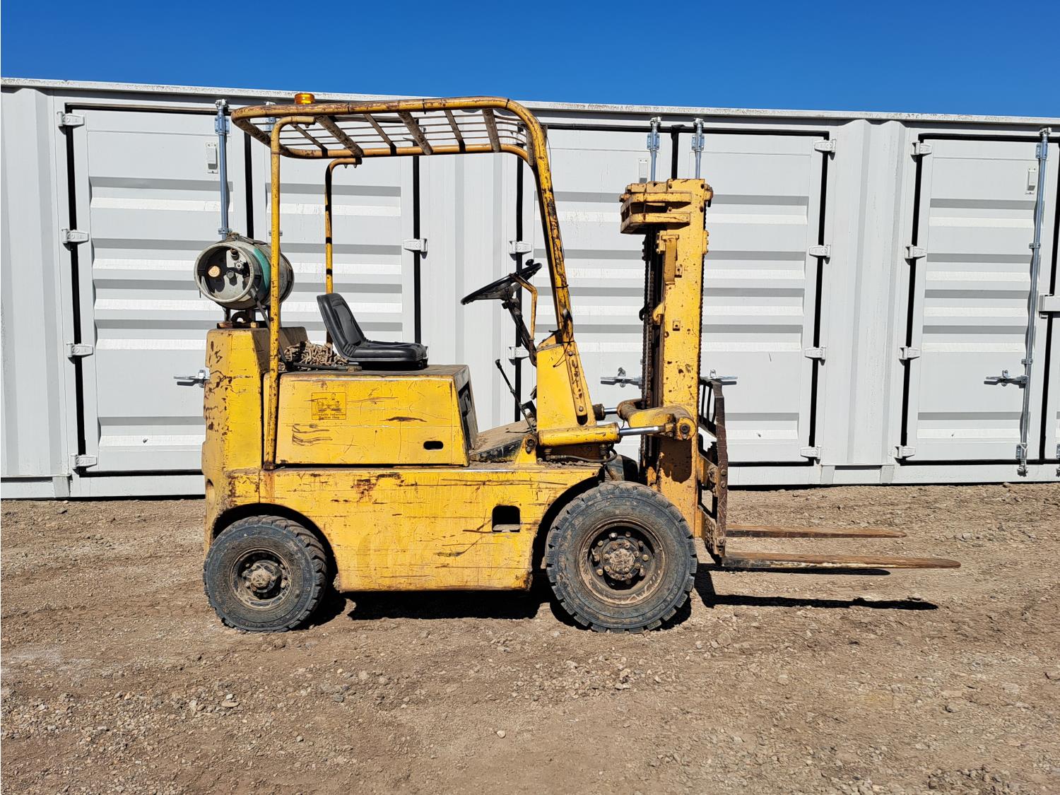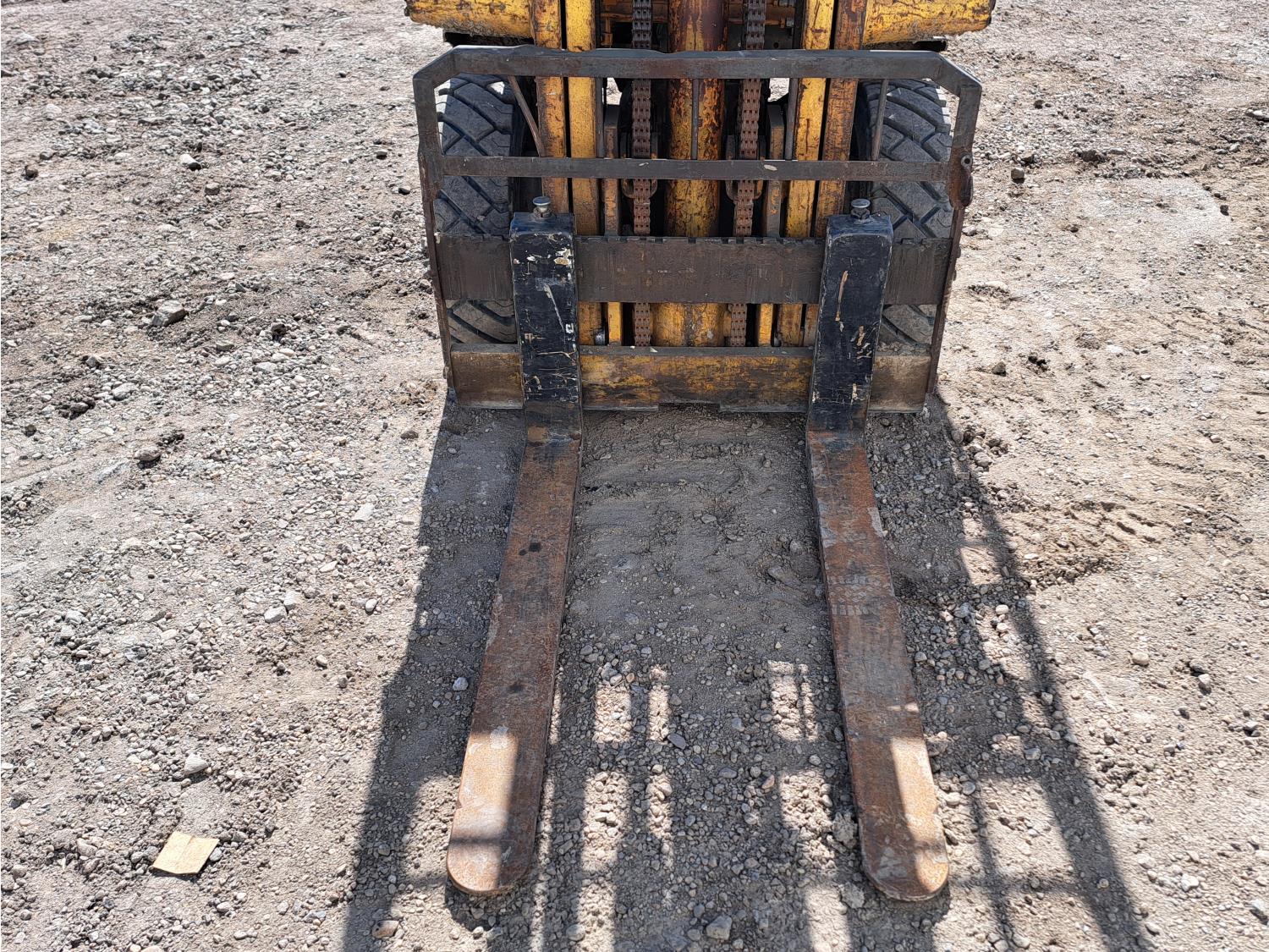 Propane powered Nissan motor, two stage tilting mast, 42 inch pallet forks, 7.00 - 12 front tires, 6.00 - 9 rear tires, front tire chains, 132 inch ± mast fully extended.