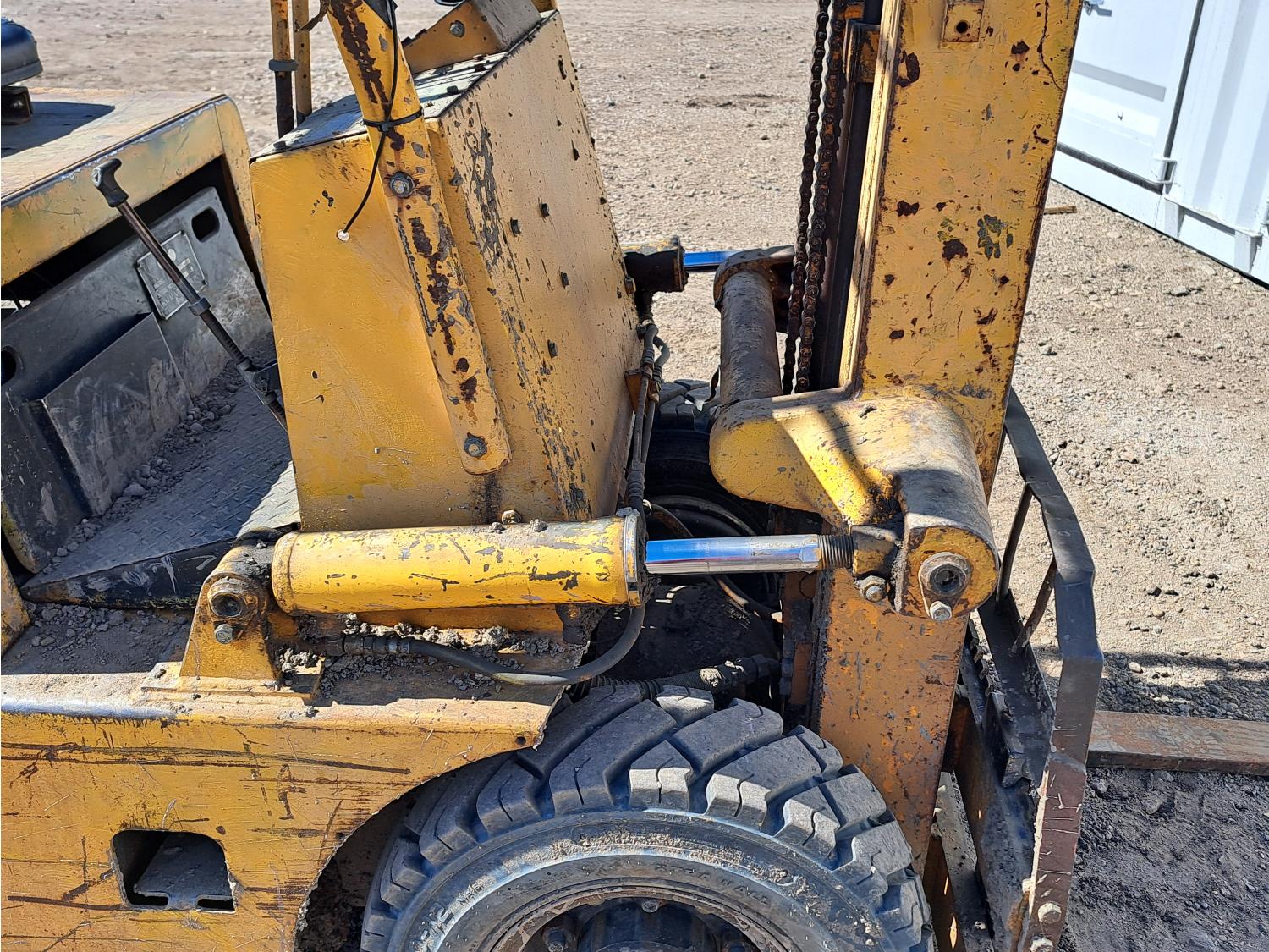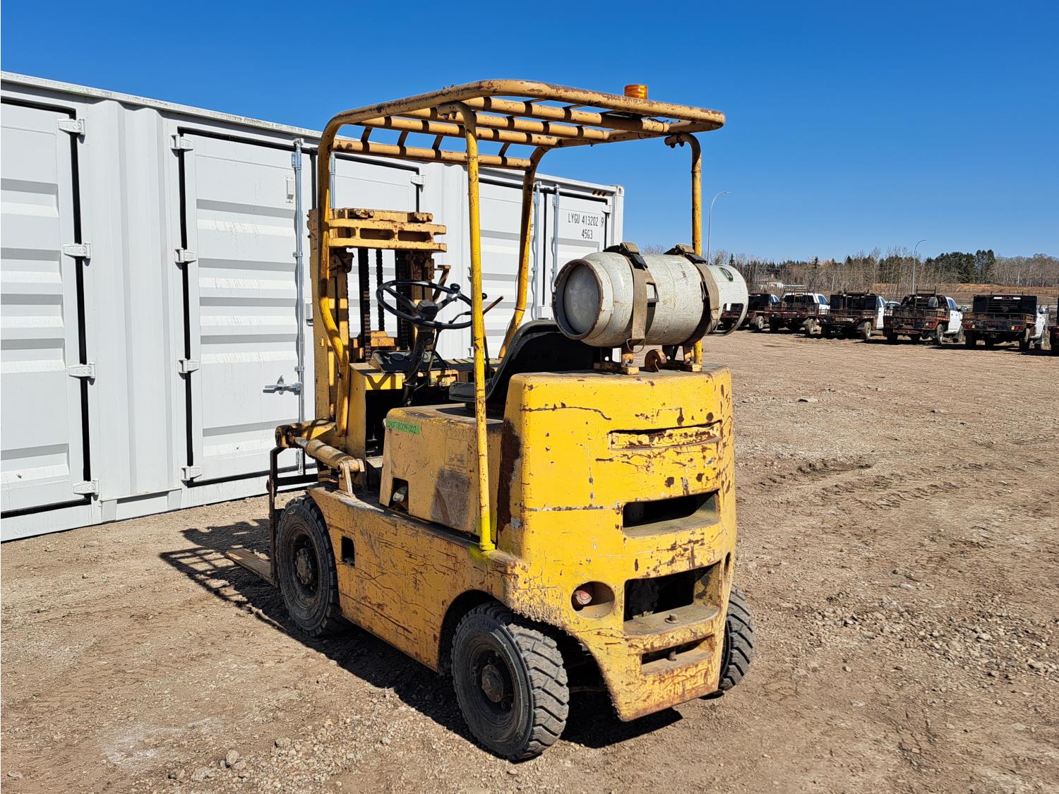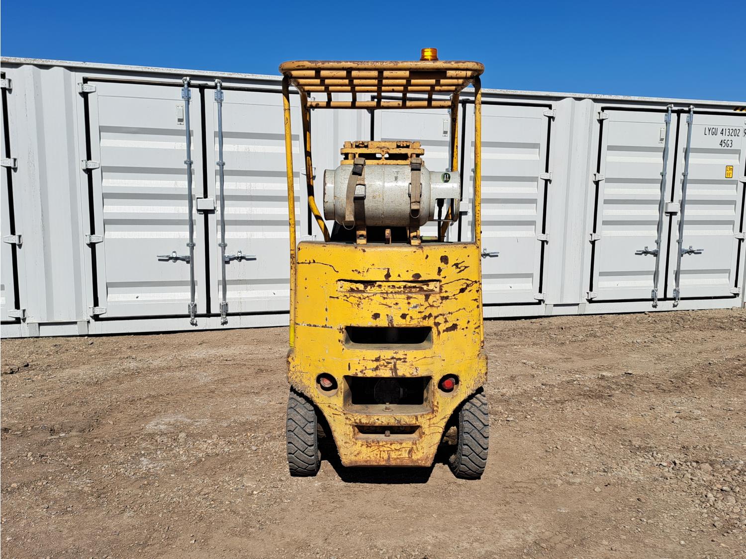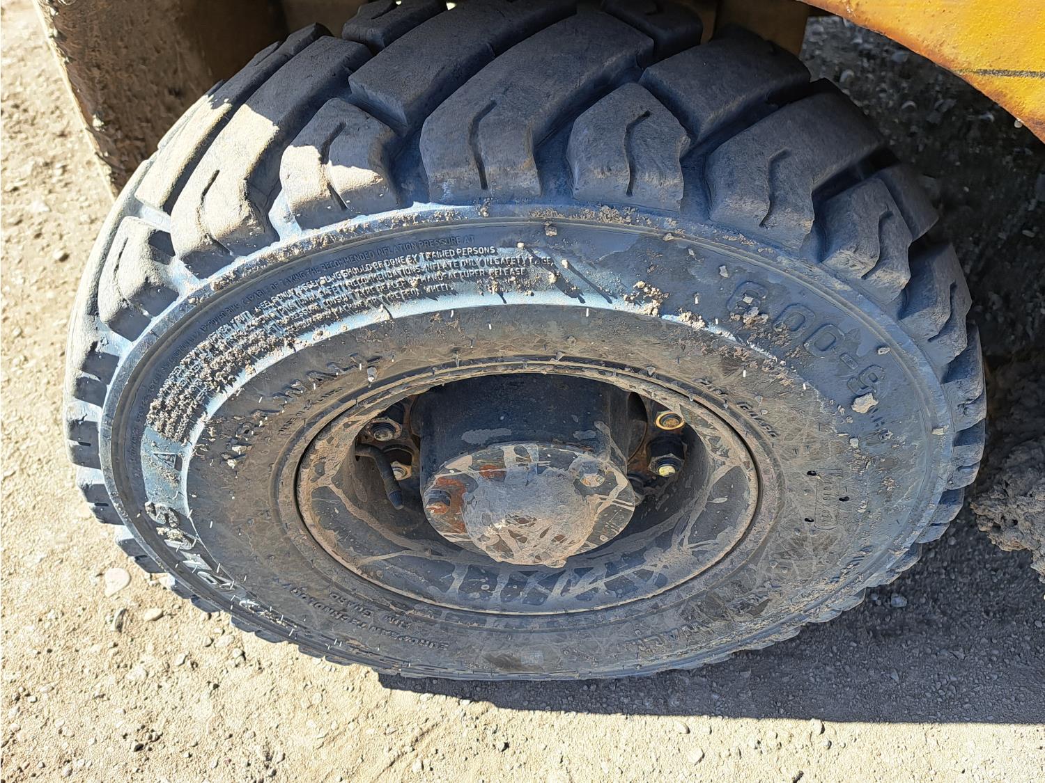 Propane powered Nissan motor, two stage tilting mast, 42 inch pallet forks, 7.00 - 12 front tires, 6.00 - 9 rear tires, front tire chains, 132 inch ± mast fully extended.