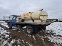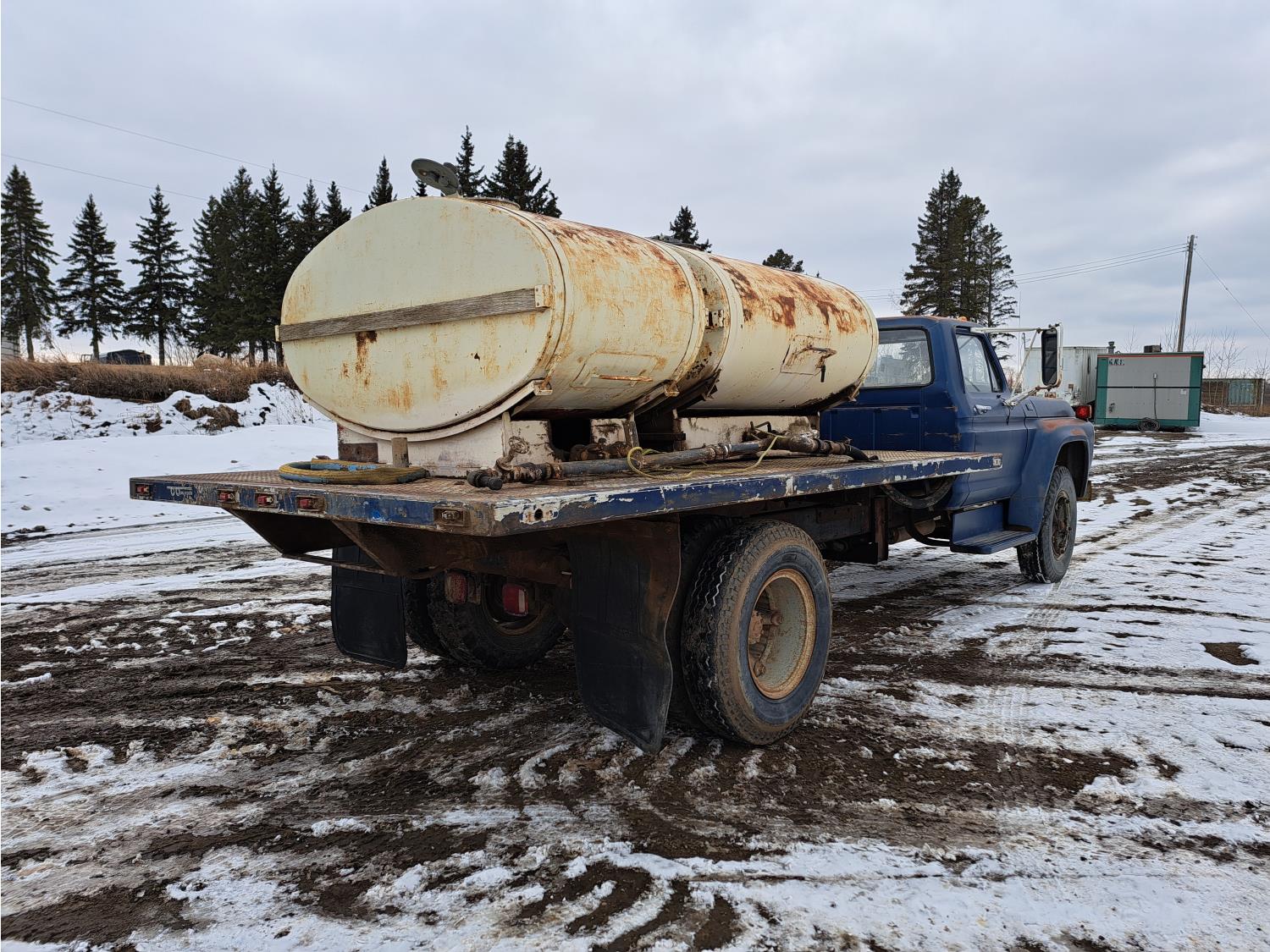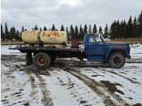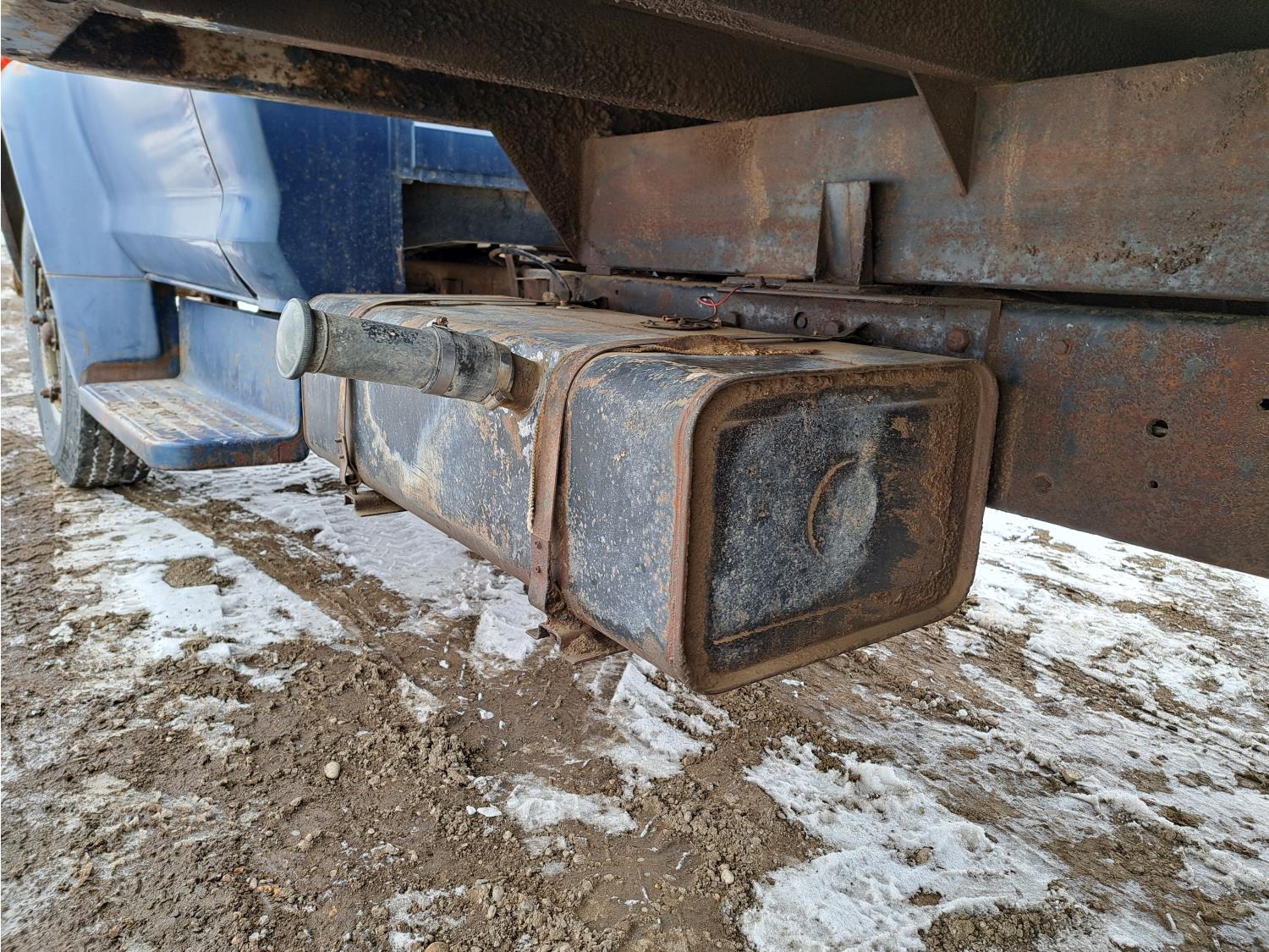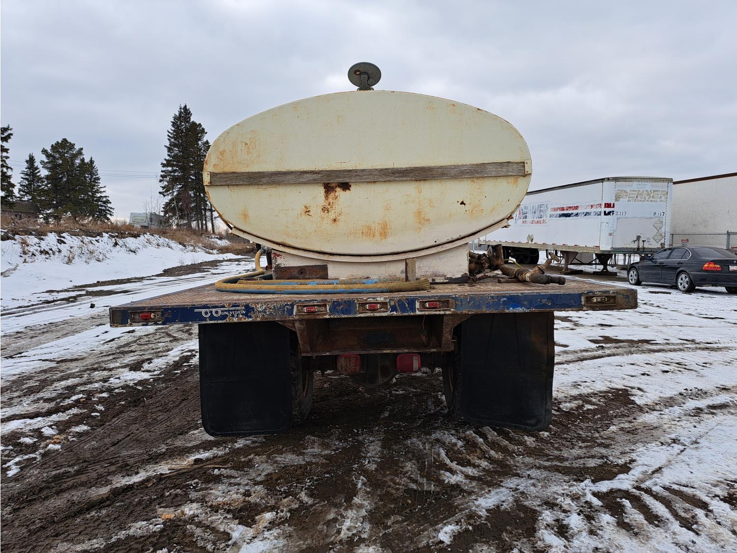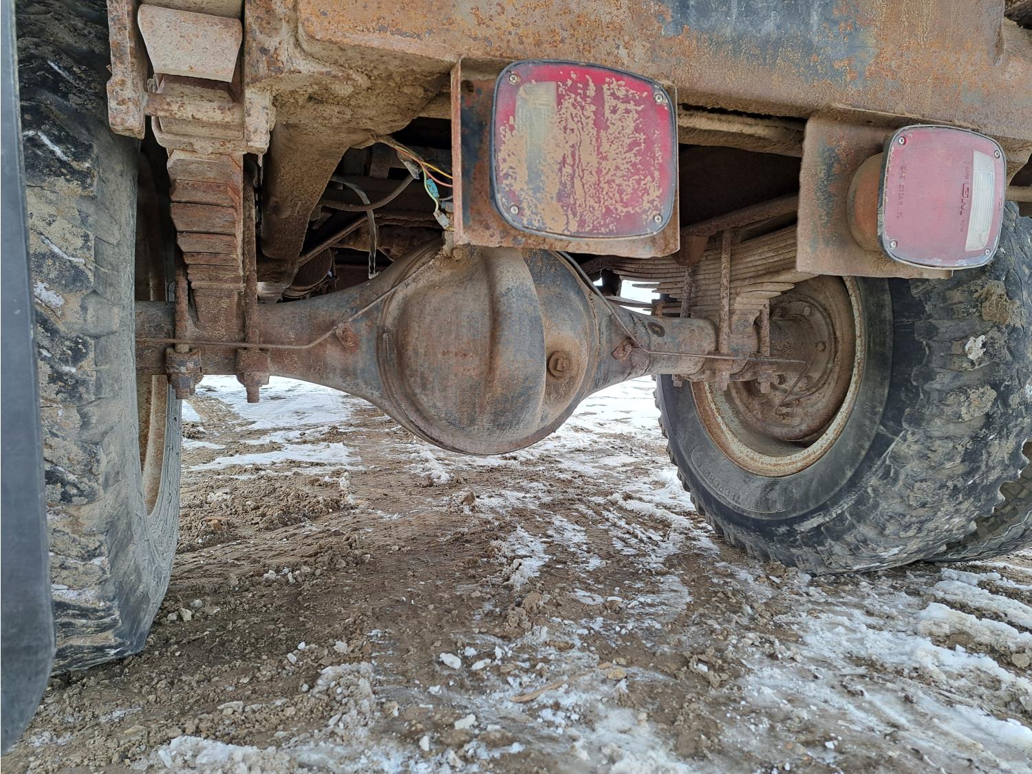 Ford 330 cu in V8 gas engine, 4 speed manual transmission, 8 ft 6 inch x 14 ft deck, 300 & 500 gallon fuel tanks, fuel pump with meter, hose with nozzle, spring suspension, 176 inch WB, 2 speed axle, 9.00-20 tires