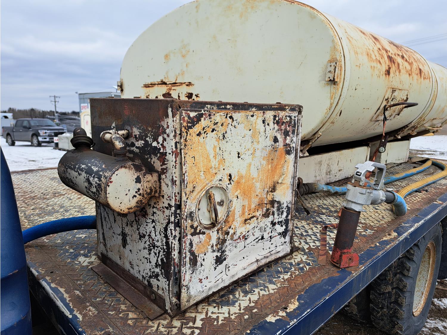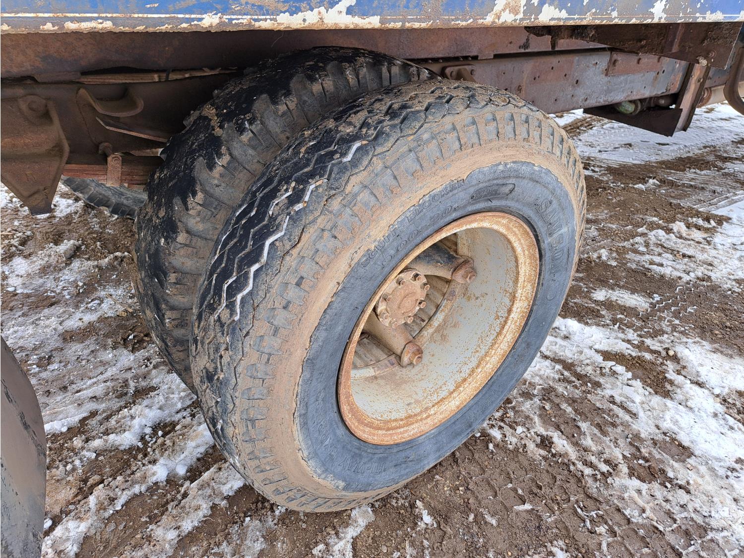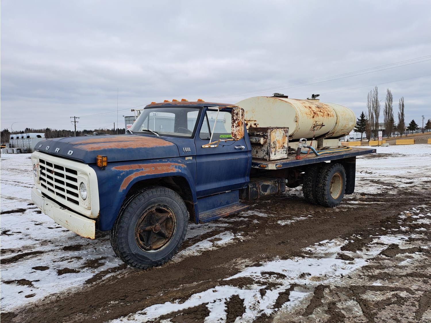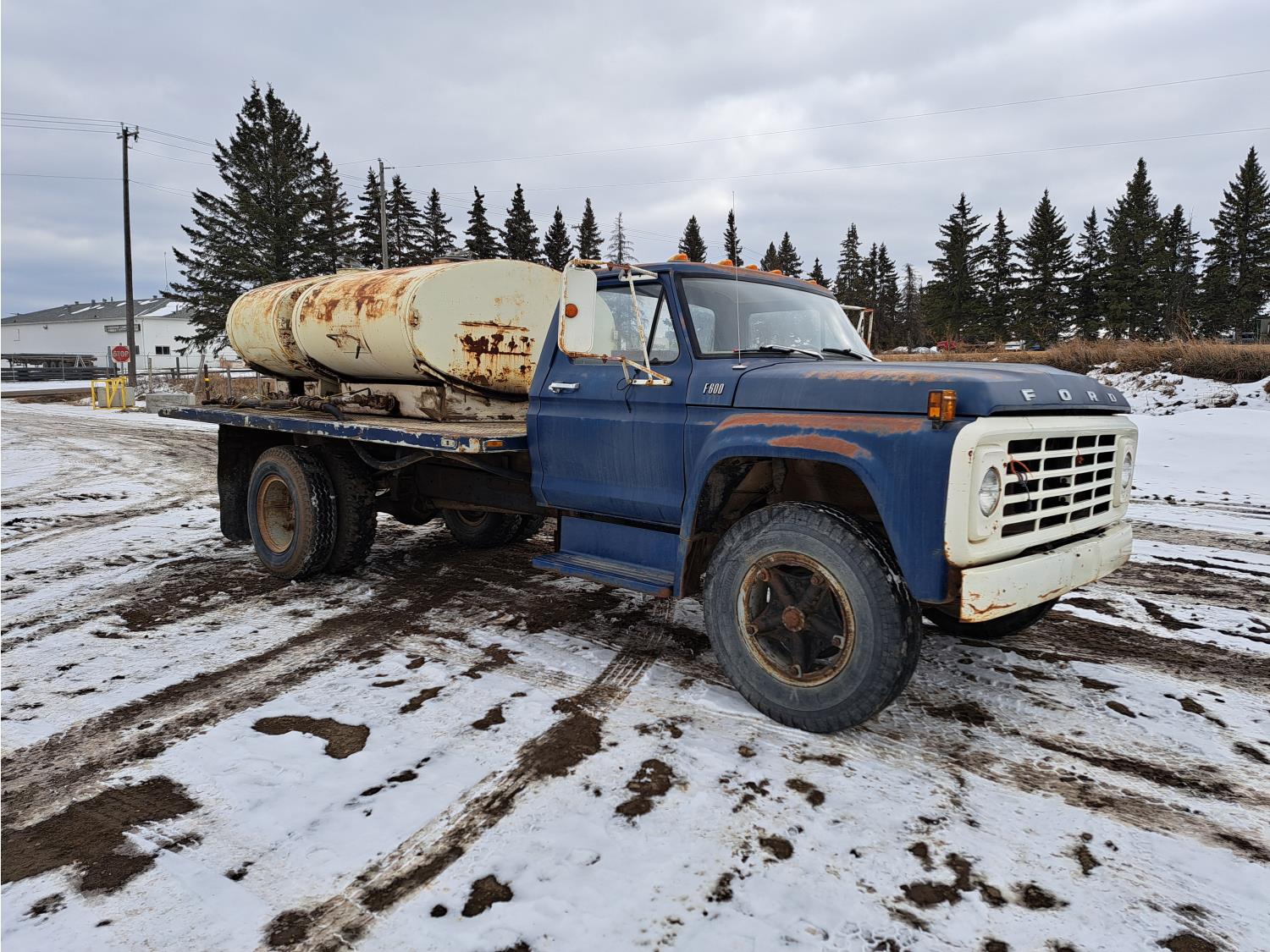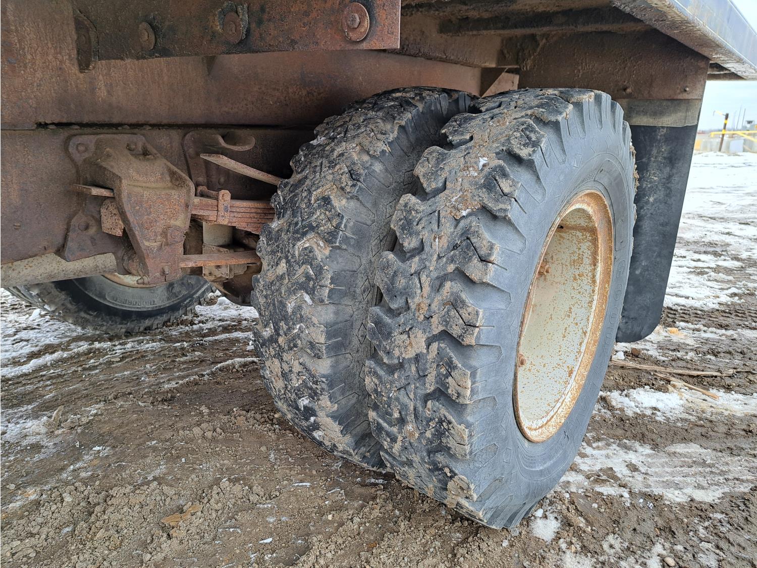 Ford 330 cu in V8 gas engine, 4 speed manual transmission, 8 ft 6 inch x 14 ft deck, 300 & 500 gallon fuel tanks, fuel pump with meter, hose with nozzle, spring suspension, 176 inch WB, 2 speed axle, 9.00-20 tires
