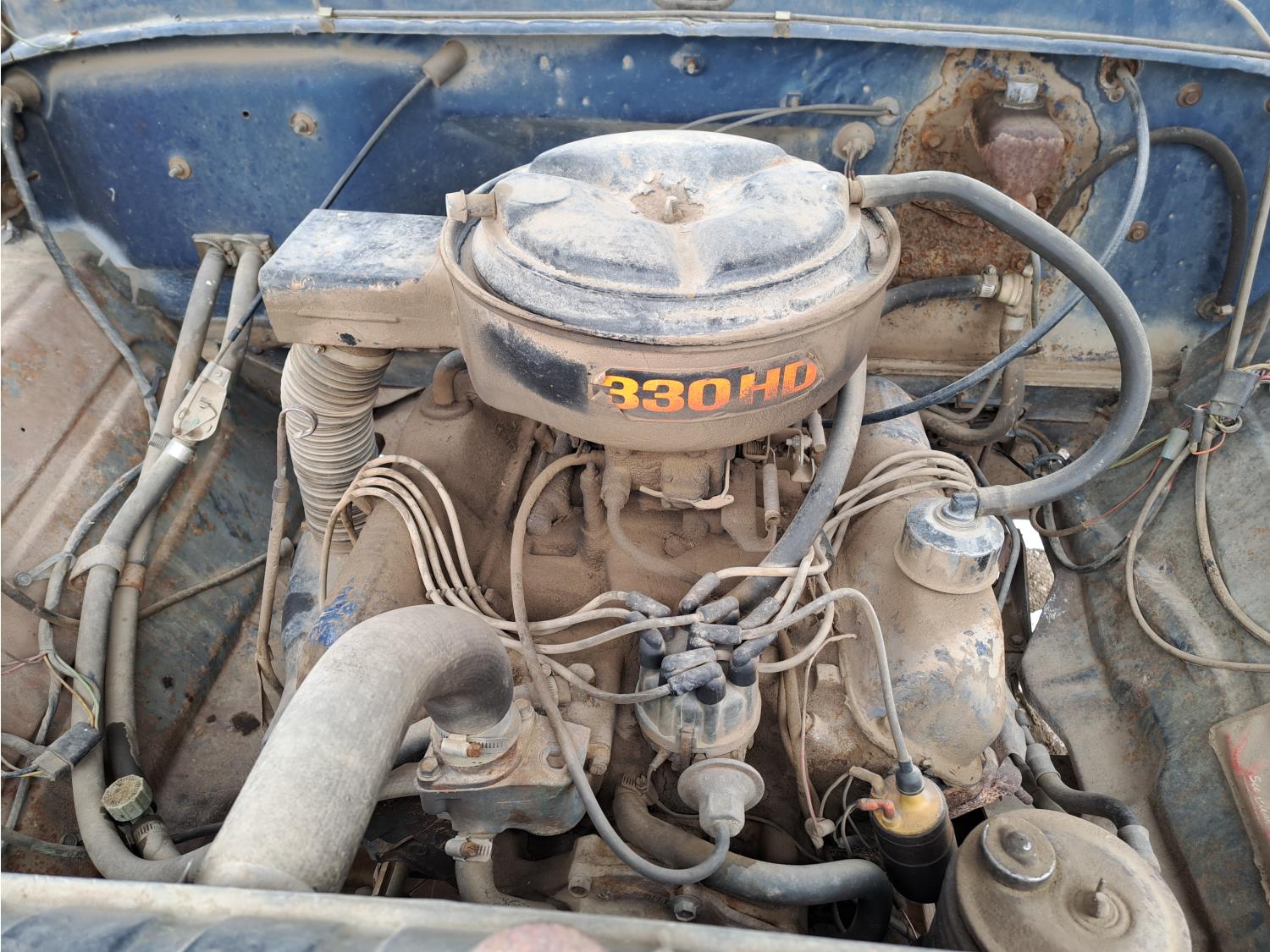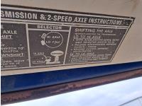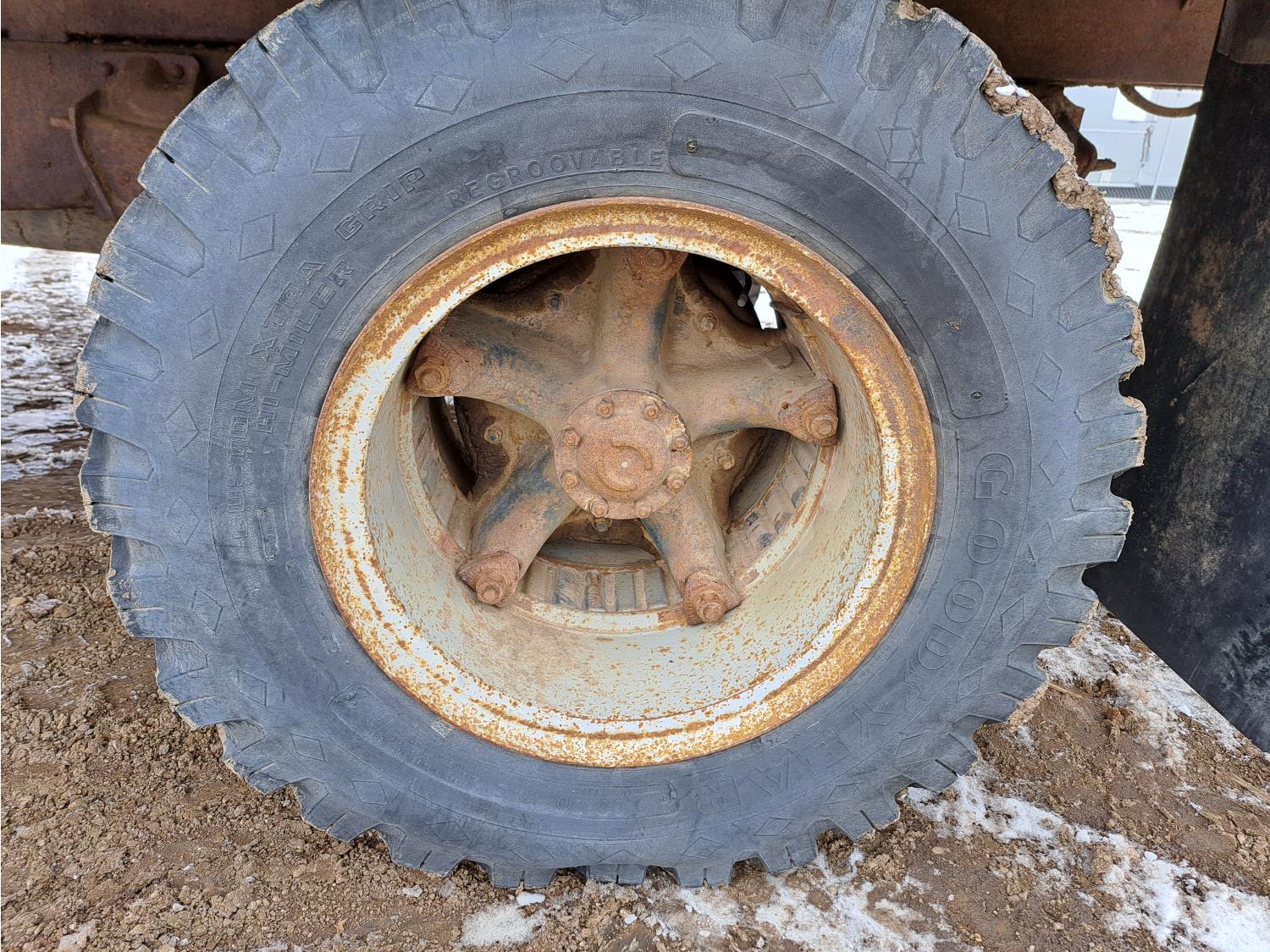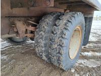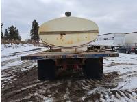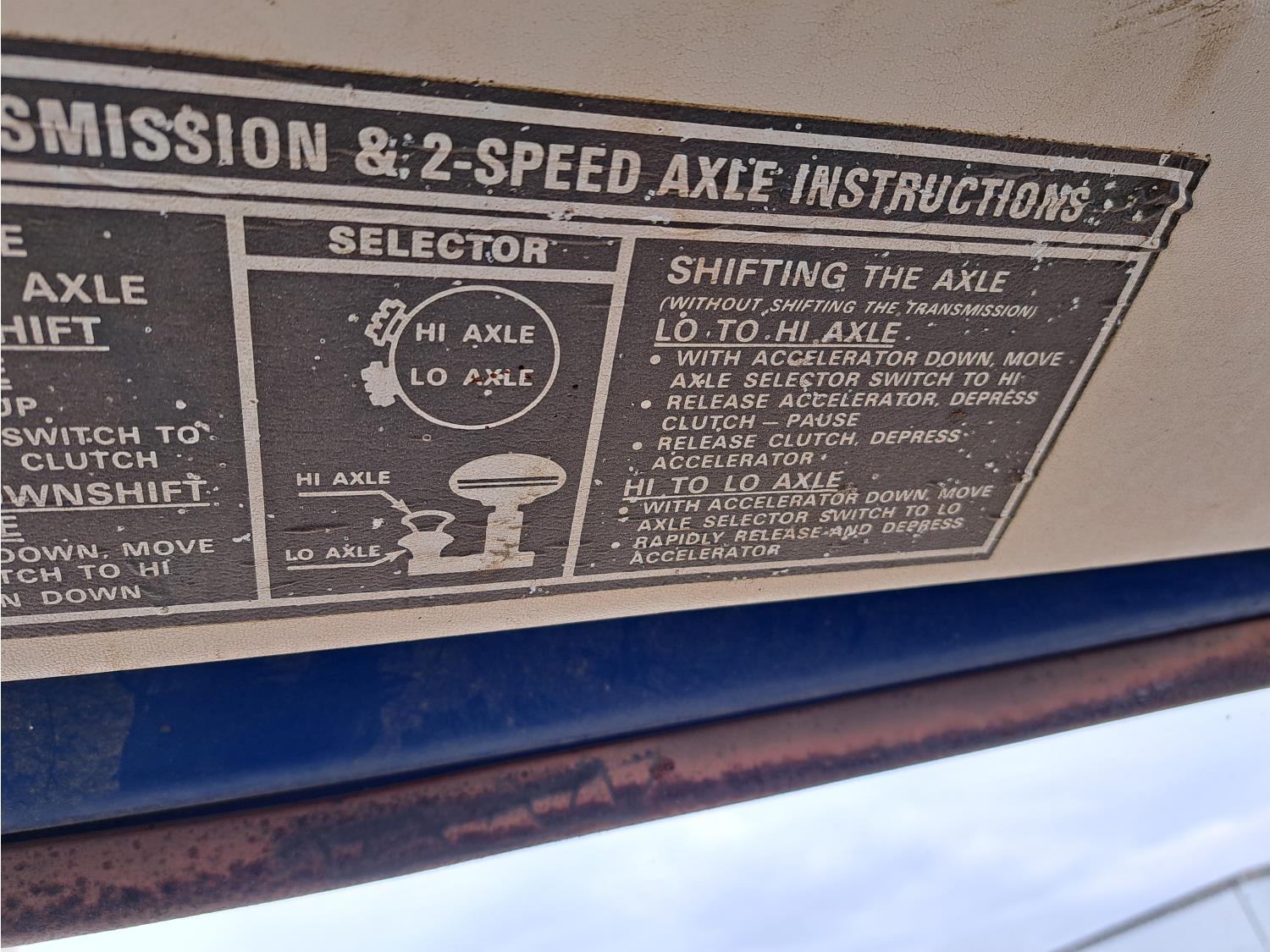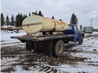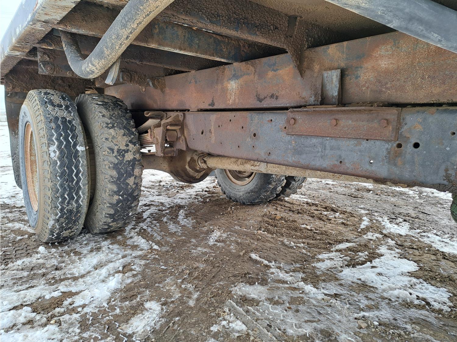 Ford 330 cu in V8 gas engine, 4 speed manual transmission, 8 ft 6 inch x 14 ft deck, 300 & 500 gallon fuel tanks, fuel pump with meter, hose with nozzle, spring suspension, 176 inch WB, 2 speed axle, 9.00-20 tires