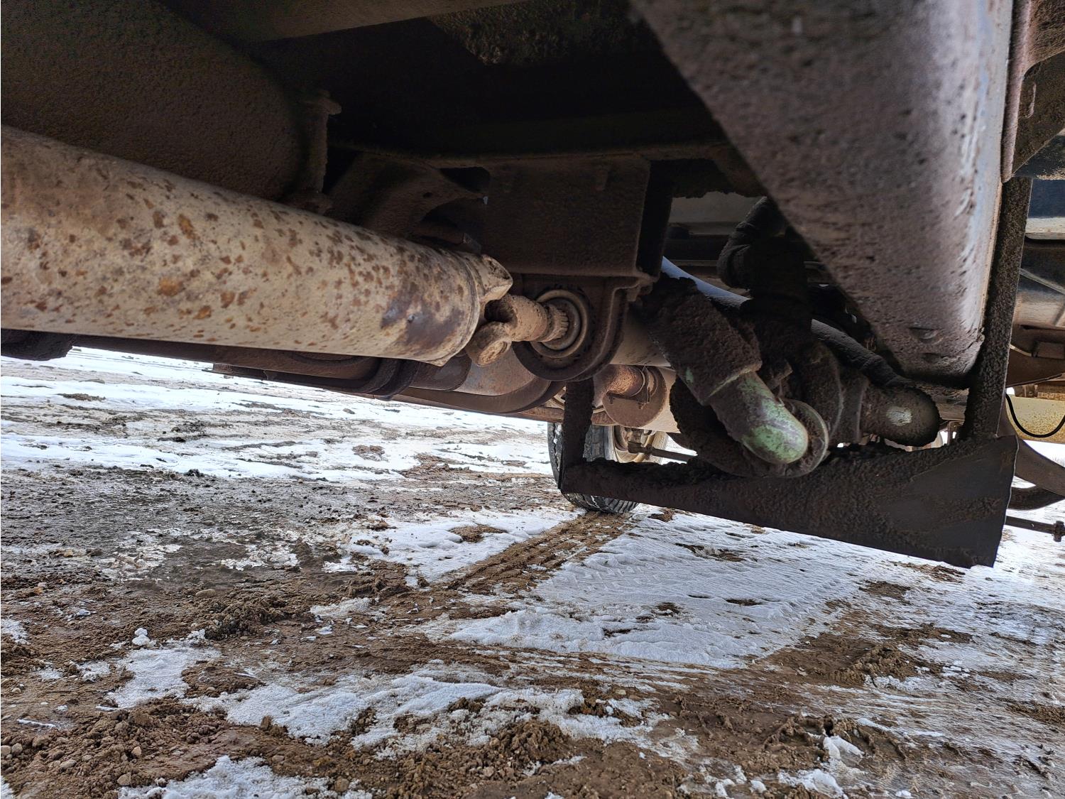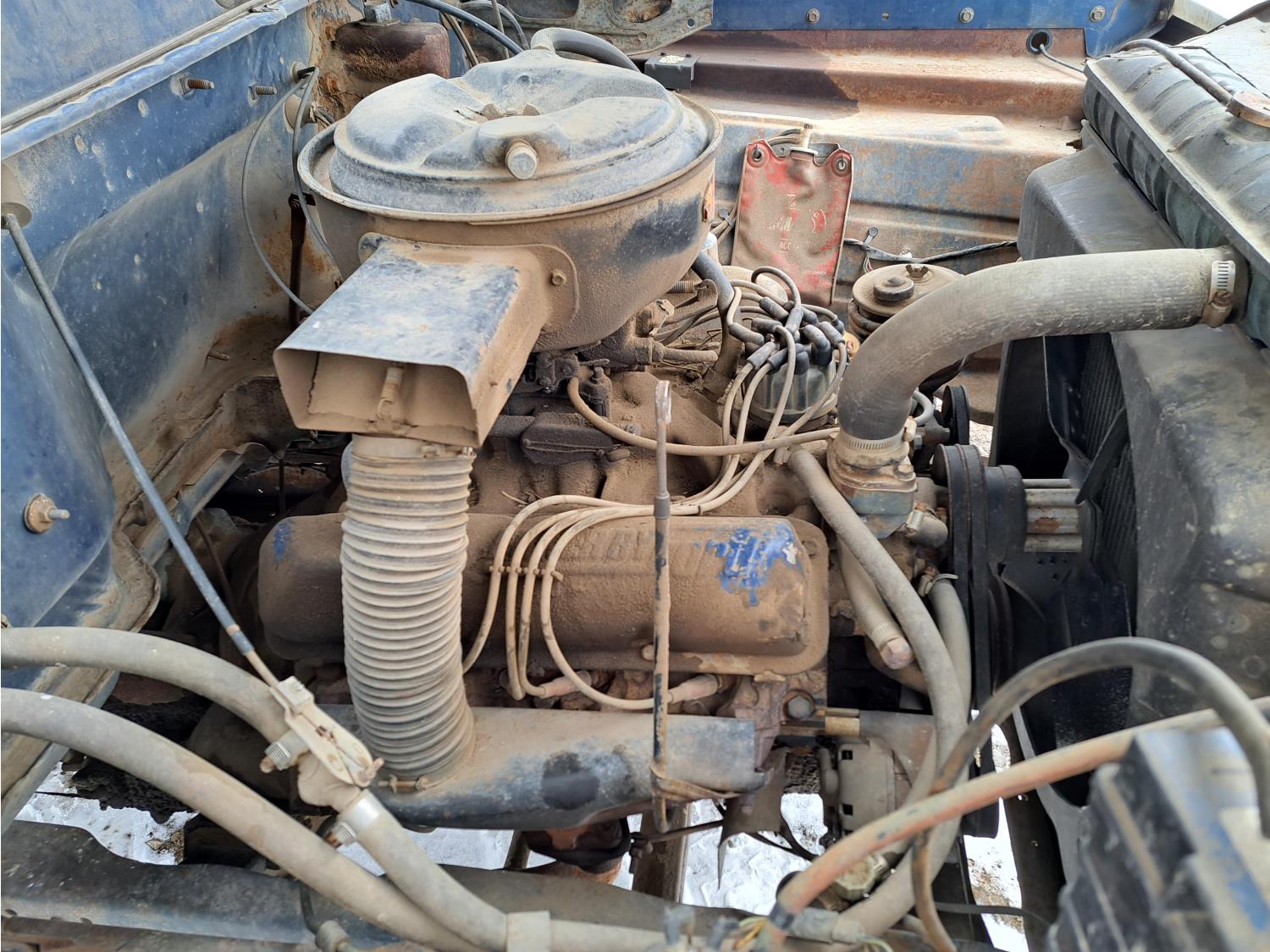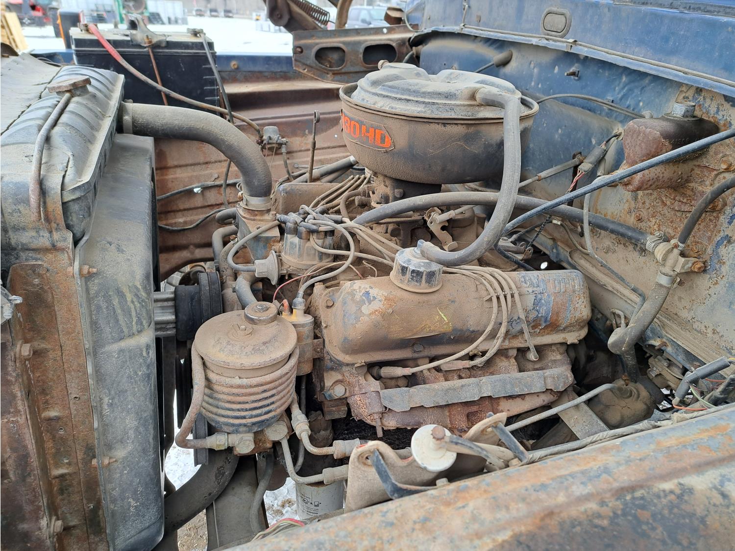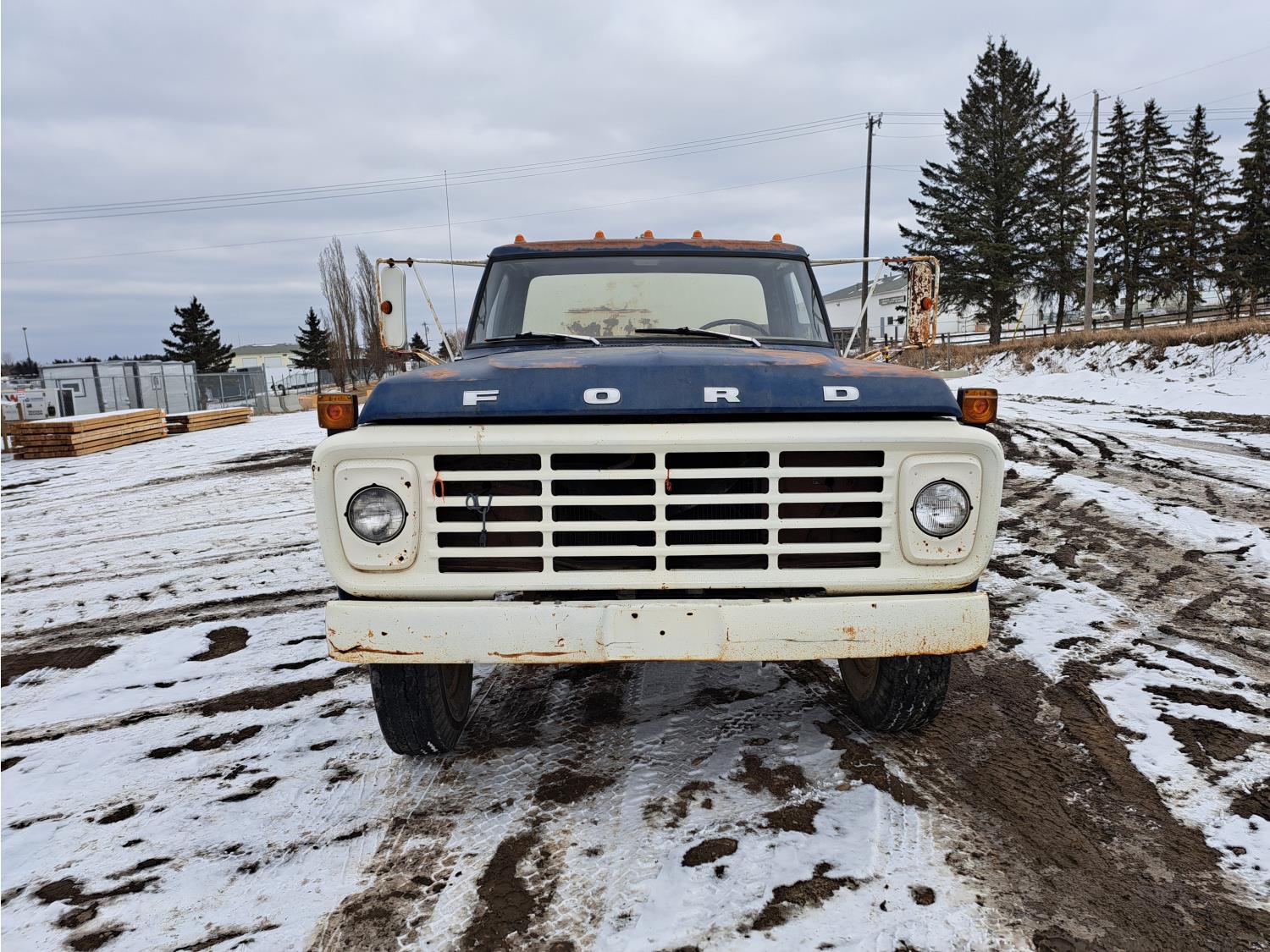 Ford 330 cu in V8 gas engine, 4 speed manual transmission, 8 ft 6 inch x 14 ft deck, 300 & 500 gallon fuel tanks, fuel pump with meter, hose with nozzle, spring suspension, 176 inch WB, 2 speed axle, 9.00-20 tires