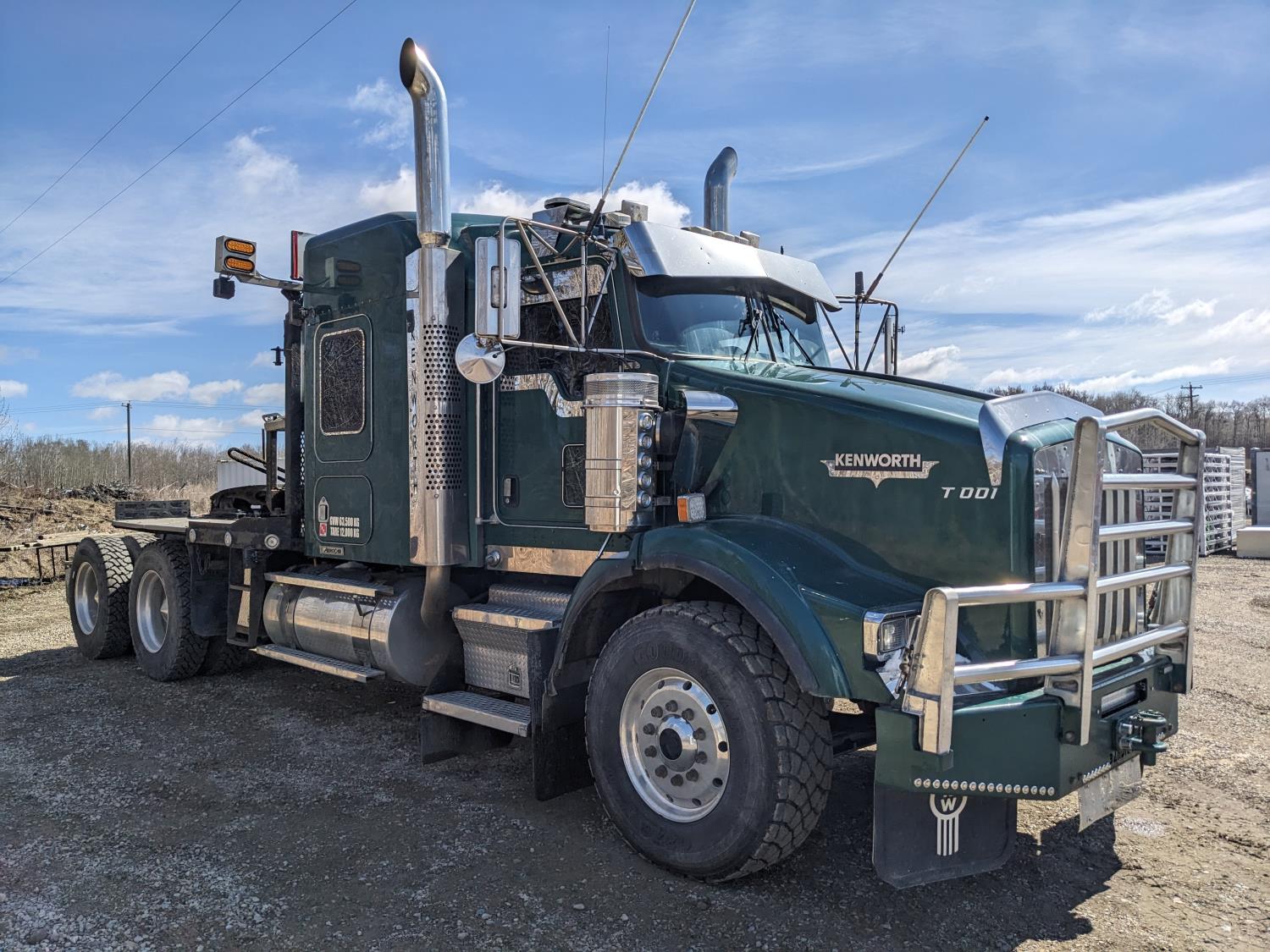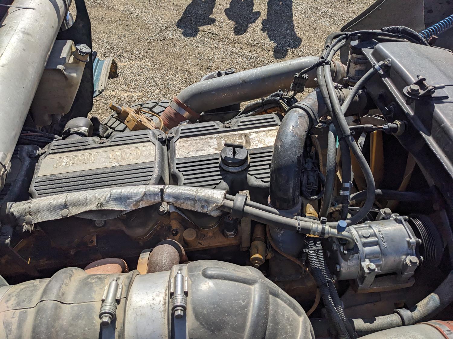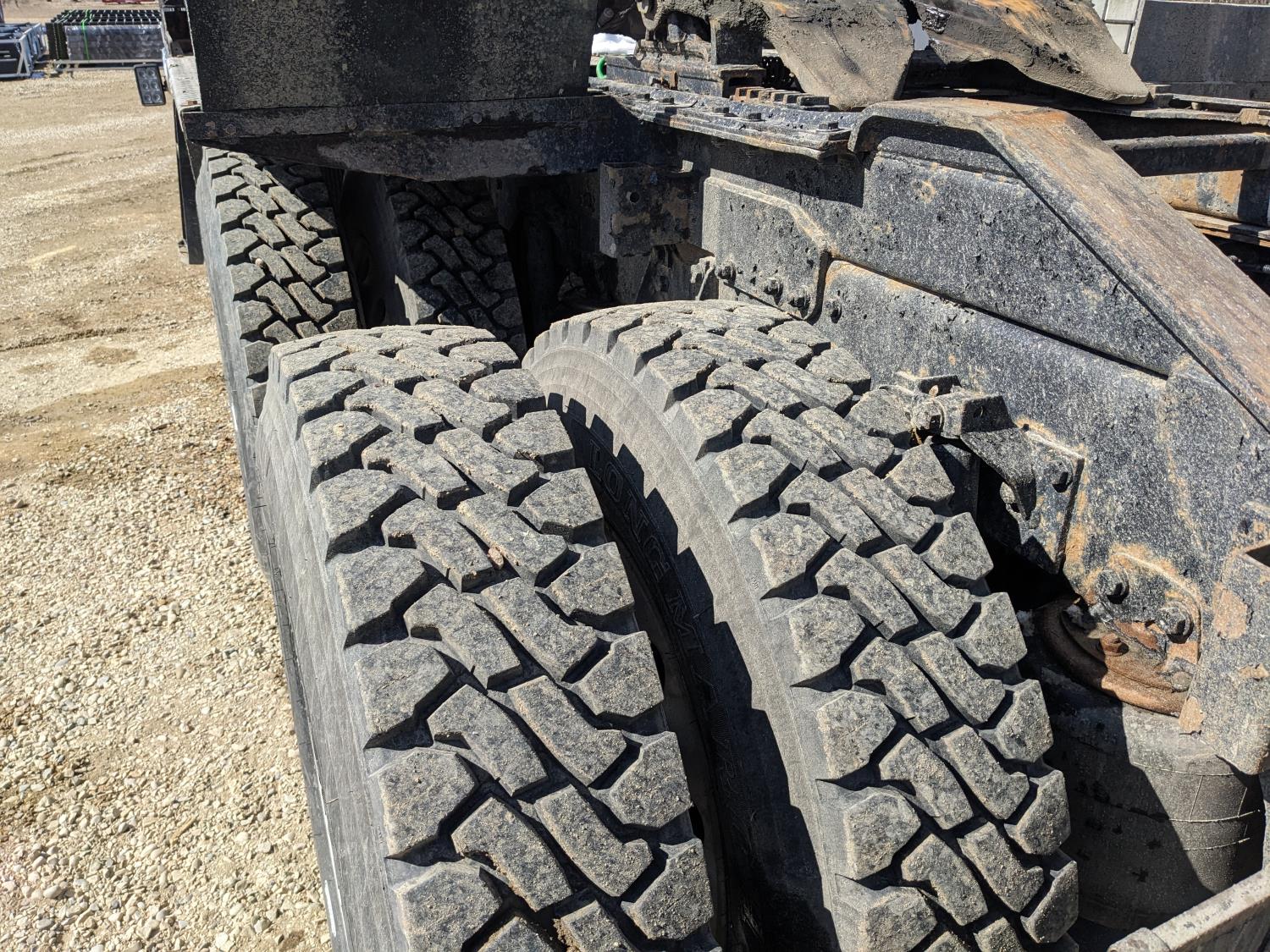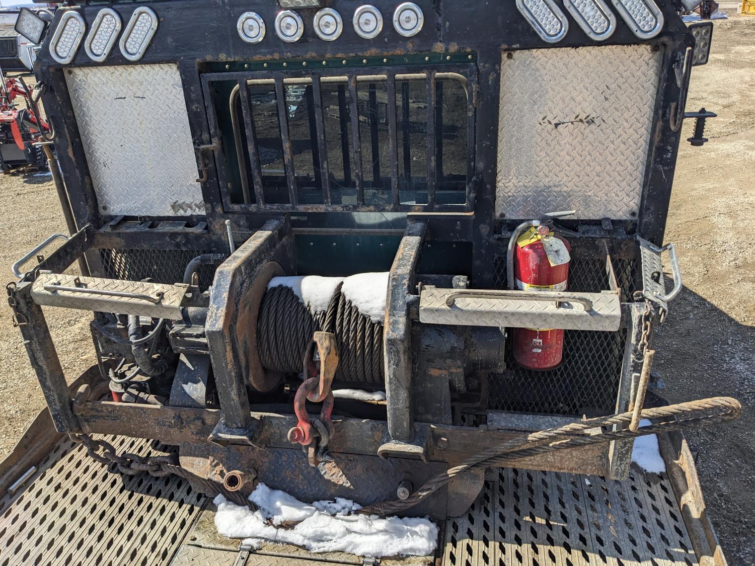 Caterpillar C15 diesel engine, Wabasto engine heater, engine brake, positive air shutoff, Eaton Fuller 18 speed manual transmission, mid rise 61 inch sleeper, A/C, cruise control, air ride seats, radio, cell booster, 2 Way hydraulic wet kit, Bandit Bar aluminum moose bumper, headache rack, tool boxes, chain holders, full deck w/ fenders, Rufnek 30 T hydraulic winch, air slide wide load sign, wide load lights, strobe lights, rear live roll, Neway air ride suspension, 16,000 lb front axle, 46,000 lb rear axles, full lockers, 4:10 ratio, 244 inch WB, all aluminum wheels, 385/65R22.5 front tires, 11R24.5 rear tires
