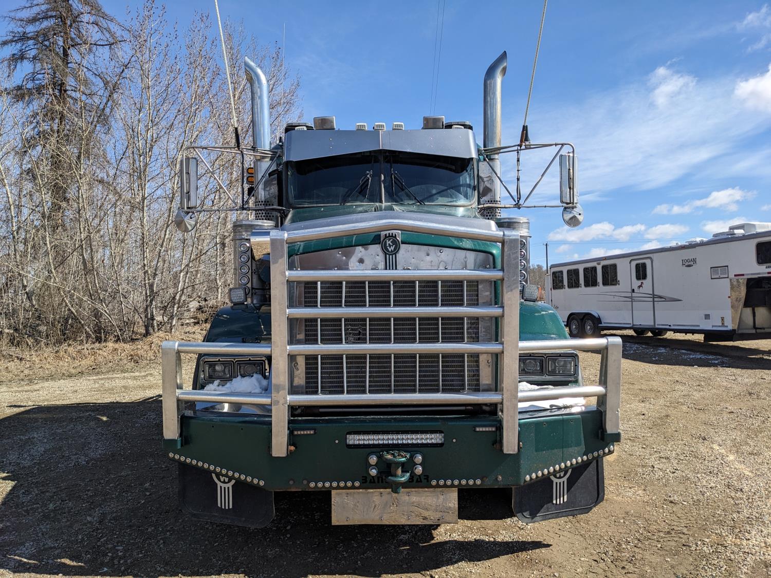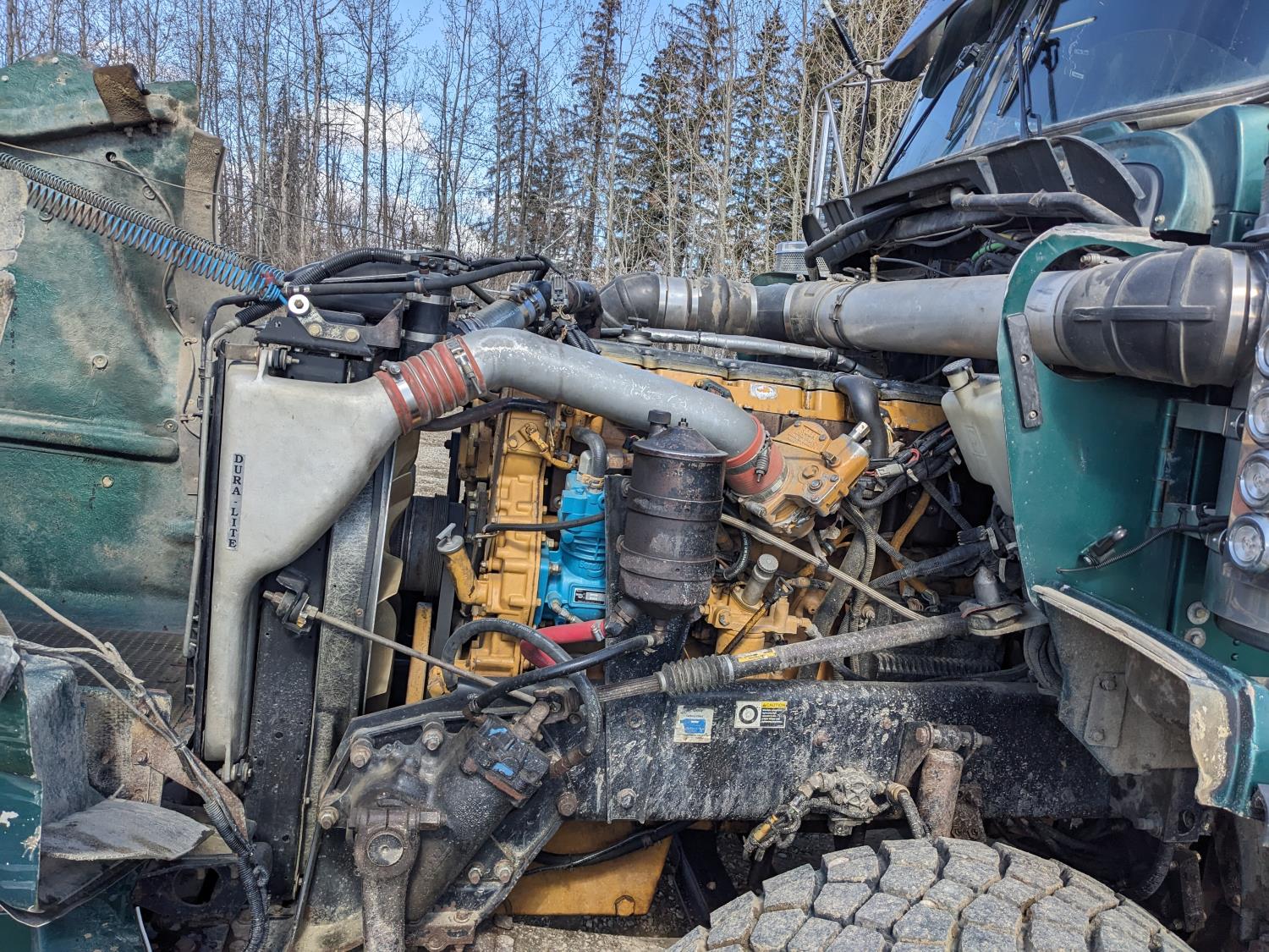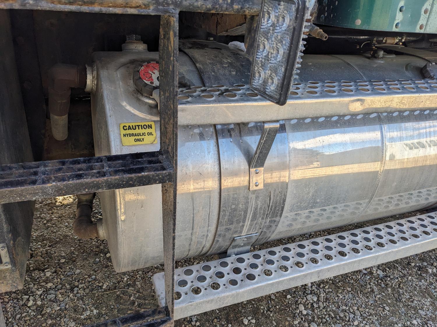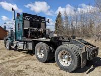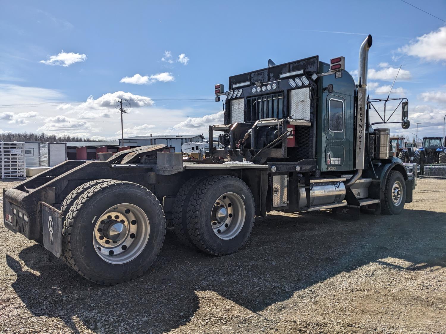 Caterpillar C15 diesel engine, Wabasto engine heater, engine brake, positive air shutoff, Eaton Fuller 18 speed manual transmission, mid rise 61 inch sleeper, A/C, cruise control, air ride seats, radio, cell booster, 2 Way hydraulic wet kit, Bandit Bar aluminum moose bumper, headache rack, tool boxes, chain holders, full deck w/ fenders, Rufnek 30 T hydraulic winch, air slide wide load sign, wide load lights, strobe lights, rear live roll, Neway air ride suspension, 16,000 lb front axle, 46,000 lb rear axles, full lockers, 4:10 ratio, 244 inch WB, all aluminum wheels, 385/65R22.5 front tires, 11R24.5 rear tires