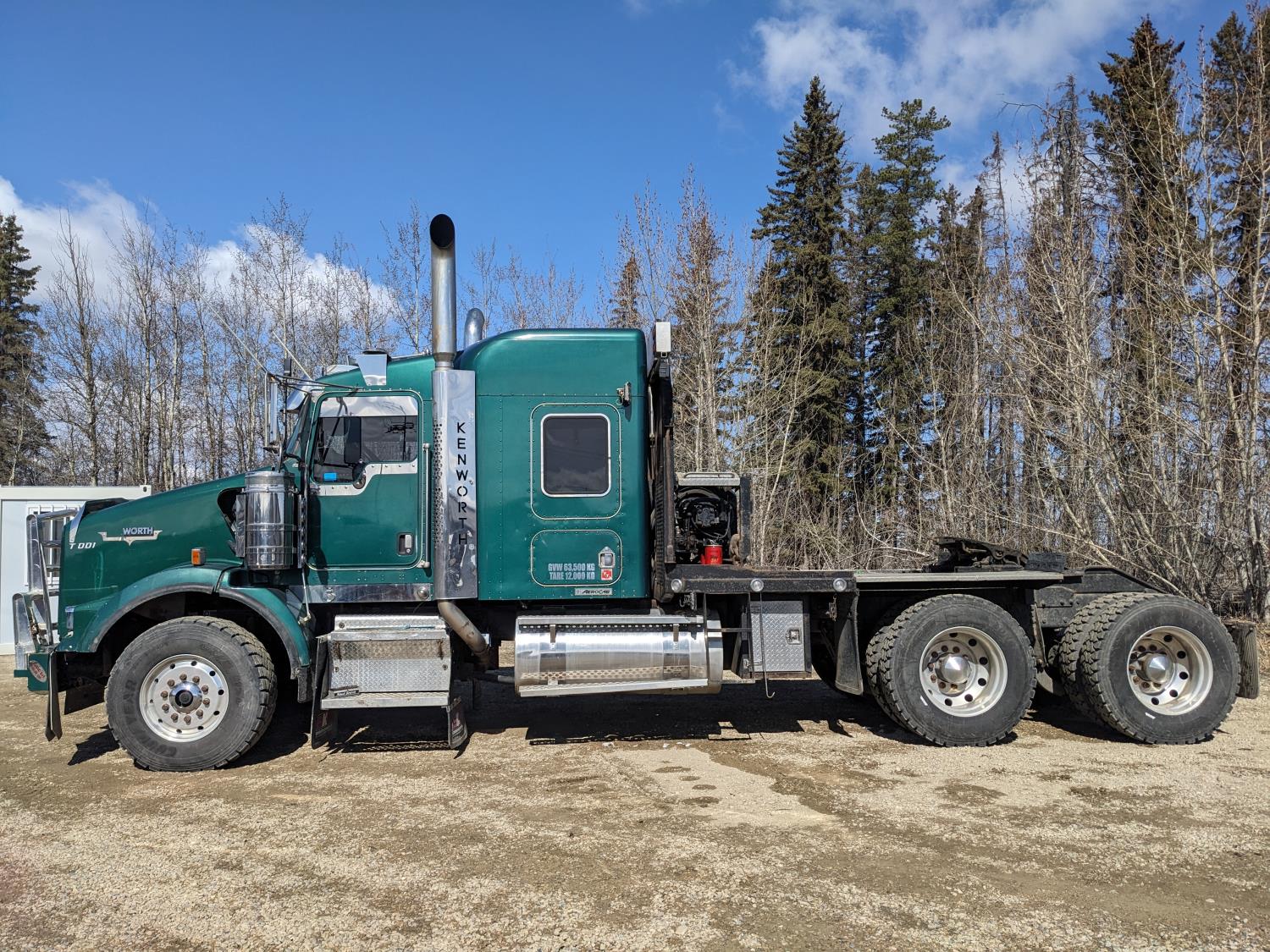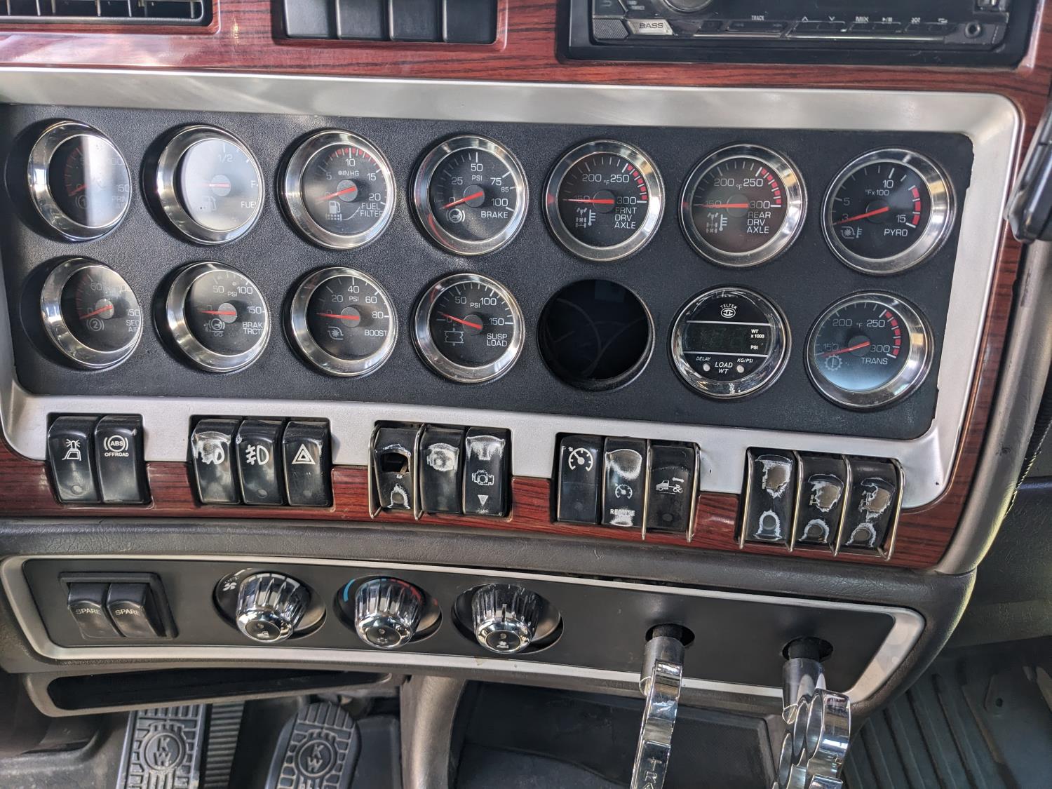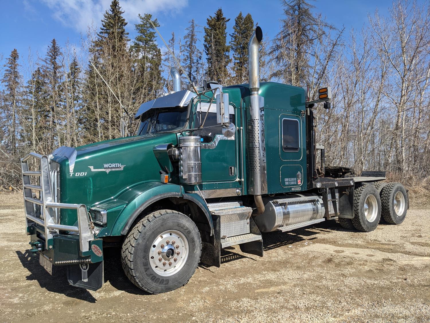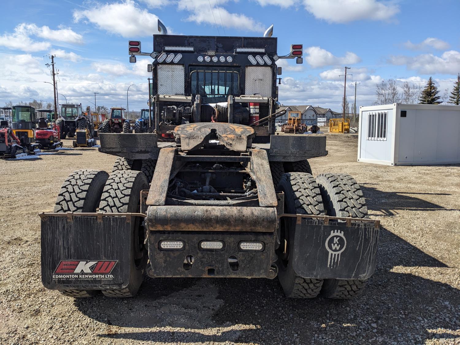 Caterpillar C15 diesel engine, Wabasto engine heater, engine brake, positive air shutoff, Eaton Fuller 18 speed manual transmission, mid rise 61 inch sleeper, A/C, cruise control, air ride seats, radio, cell booster, 2 Way hydraulic wet kit, Bandit Bar aluminum moose bumper, headache rack, tool boxes, chain holders, full deck w/ fenders, Rufnek 30 T hydraulic winch, air slide wide load sign, wide load lights, strobe lights, rear live roll, Neway air ride suspension, 16,000 lb front axle, 46,000 lb rear axles, full lockers, 4:10 ratio, 244 inch WB, all aluminum wheels, 385/65R22.5 front tires, 11R24.5 rear tires