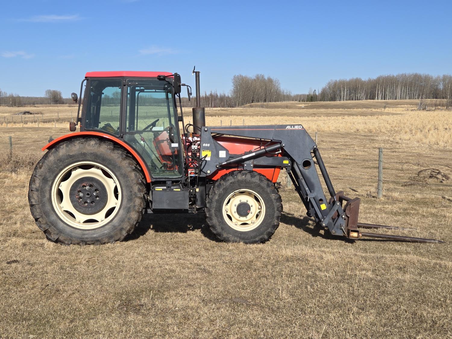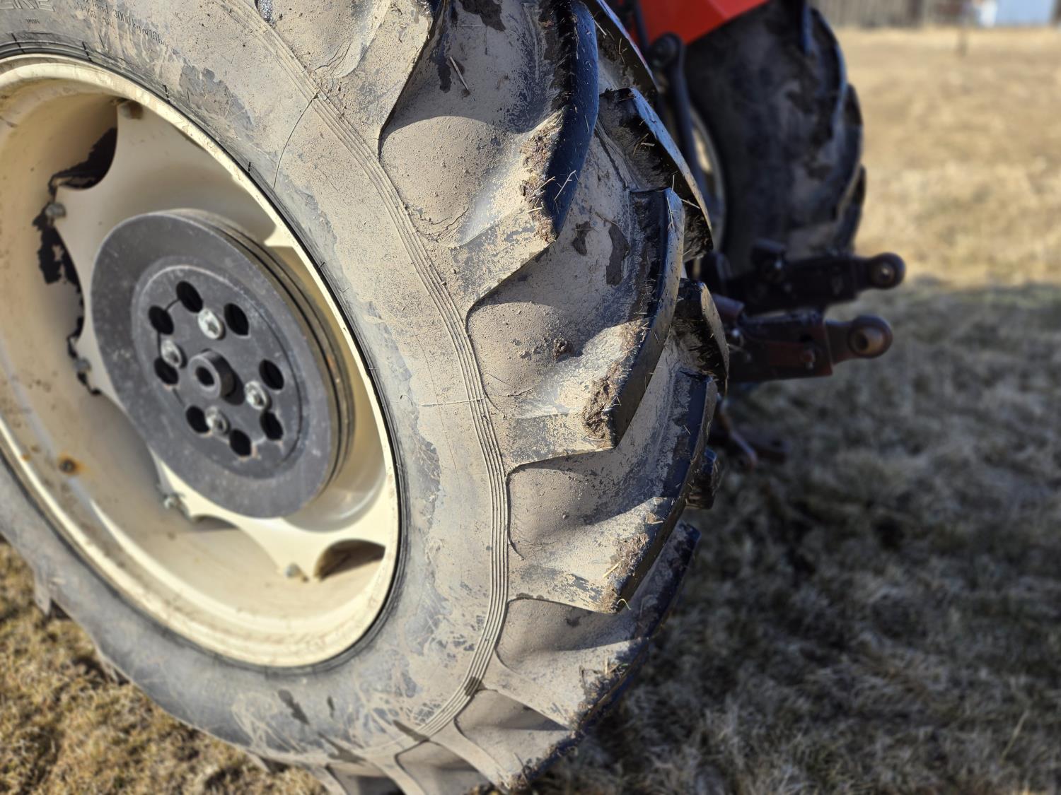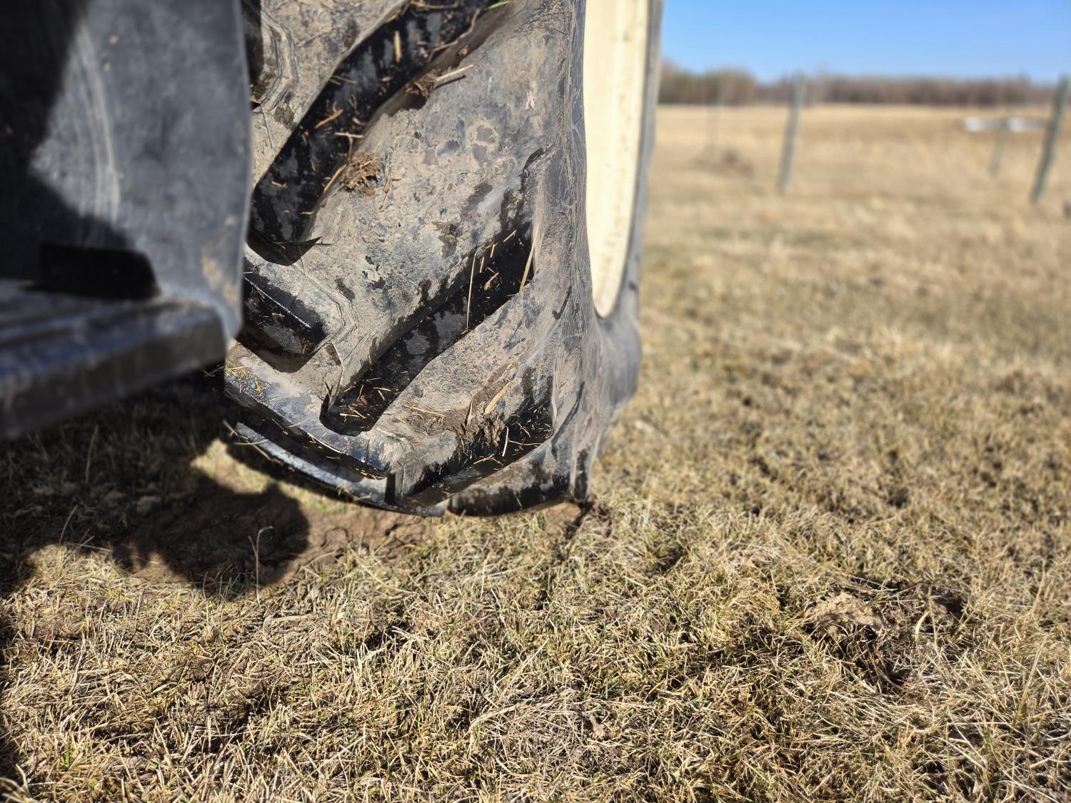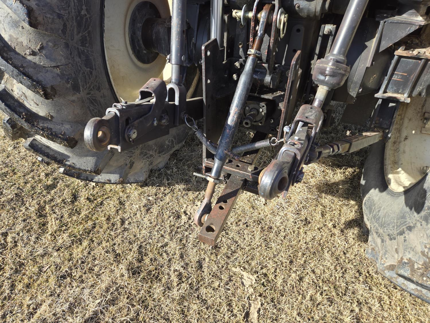 Allied 695 loader, bucket, grapple, bale forks, 4 cylinder diesel engine, 18 speed manual transmission, cab, rear differential lock, joystick, A/C, radio, 540 PTO, 3 point hitch, 2 rear hydraulic outlets, rear wheel weights, 13.6-24 front tires, 18.4R38 rear tires