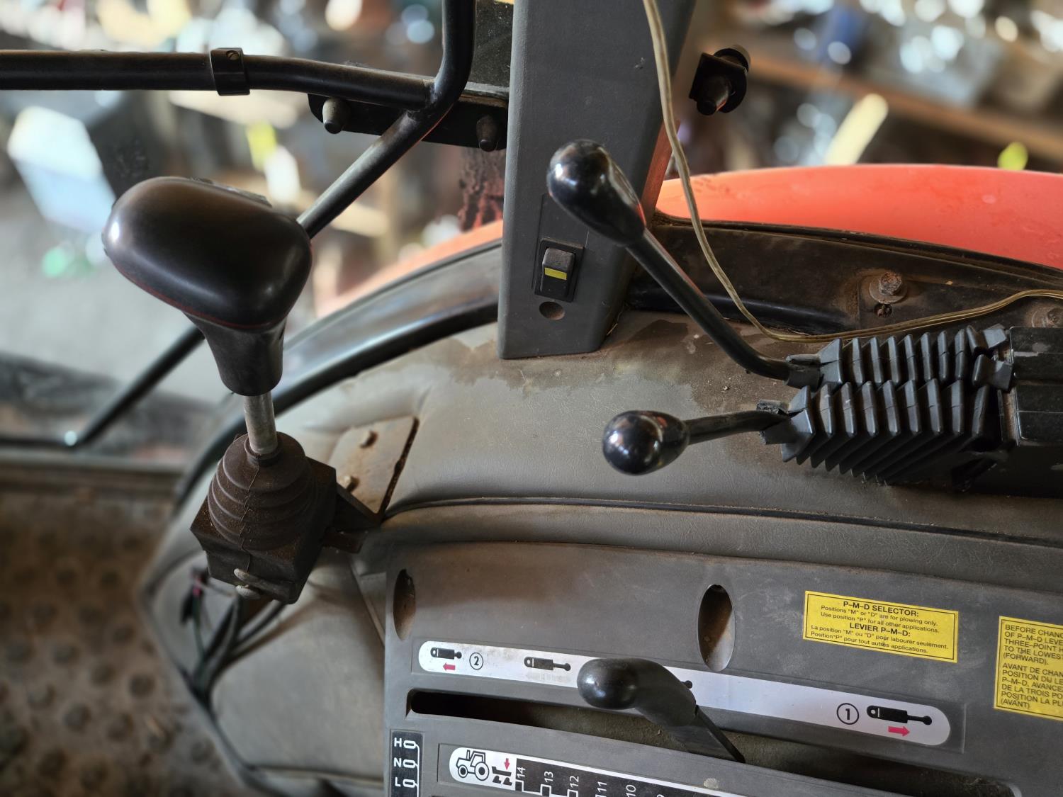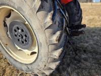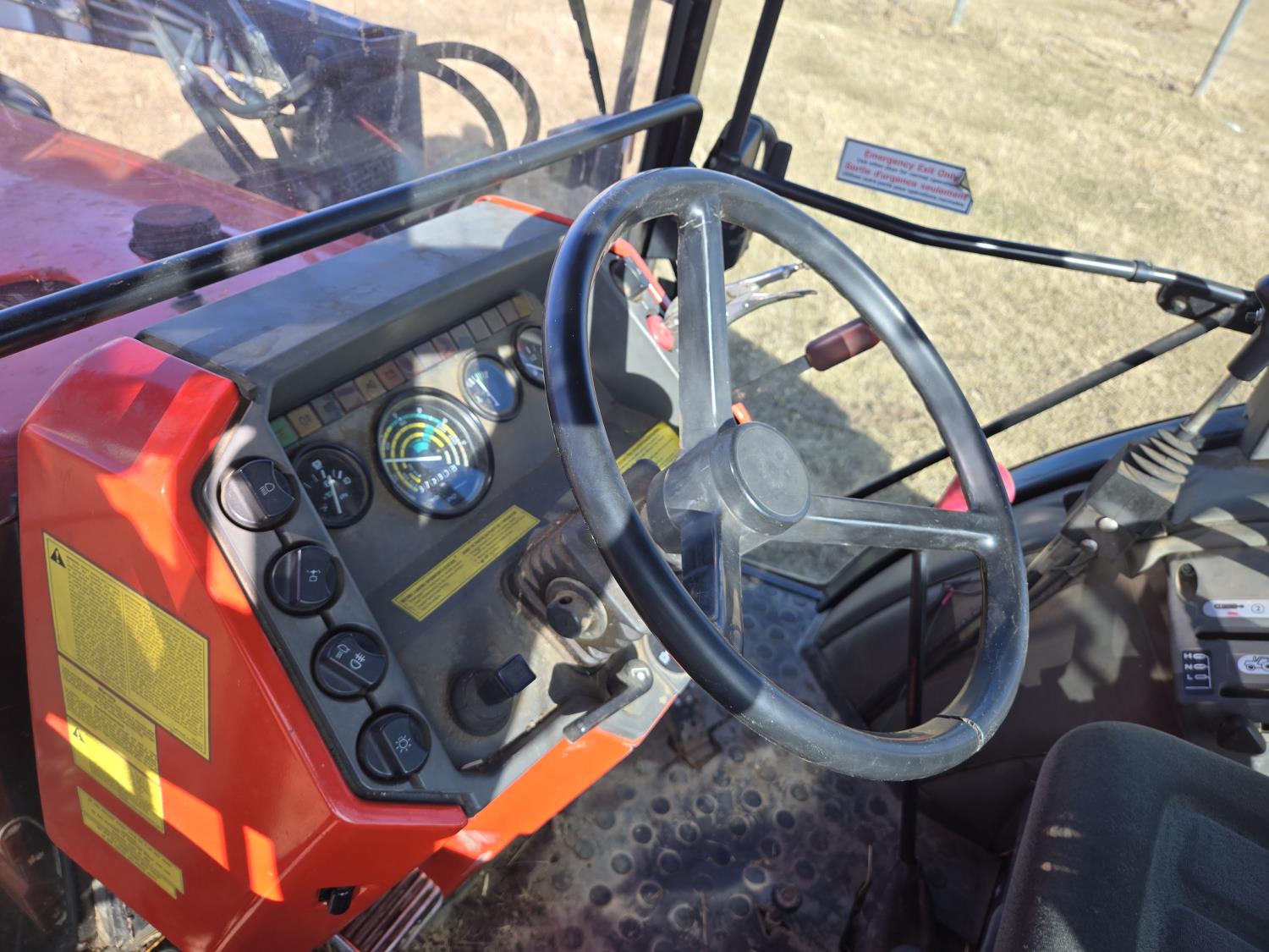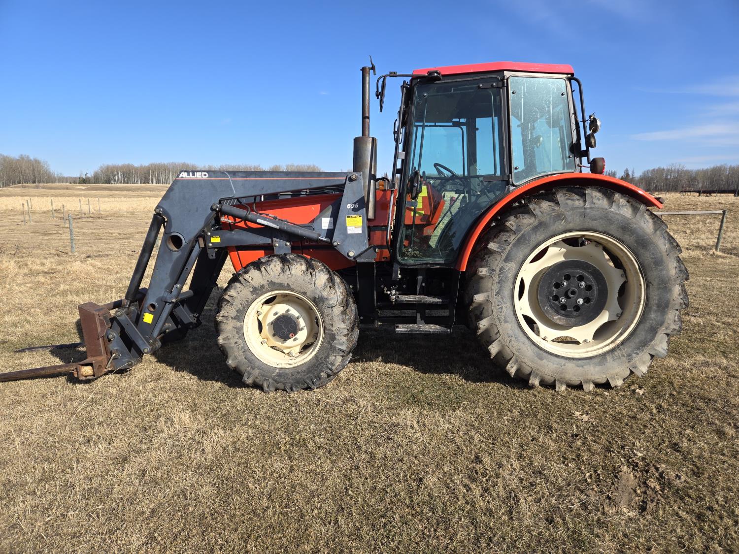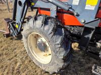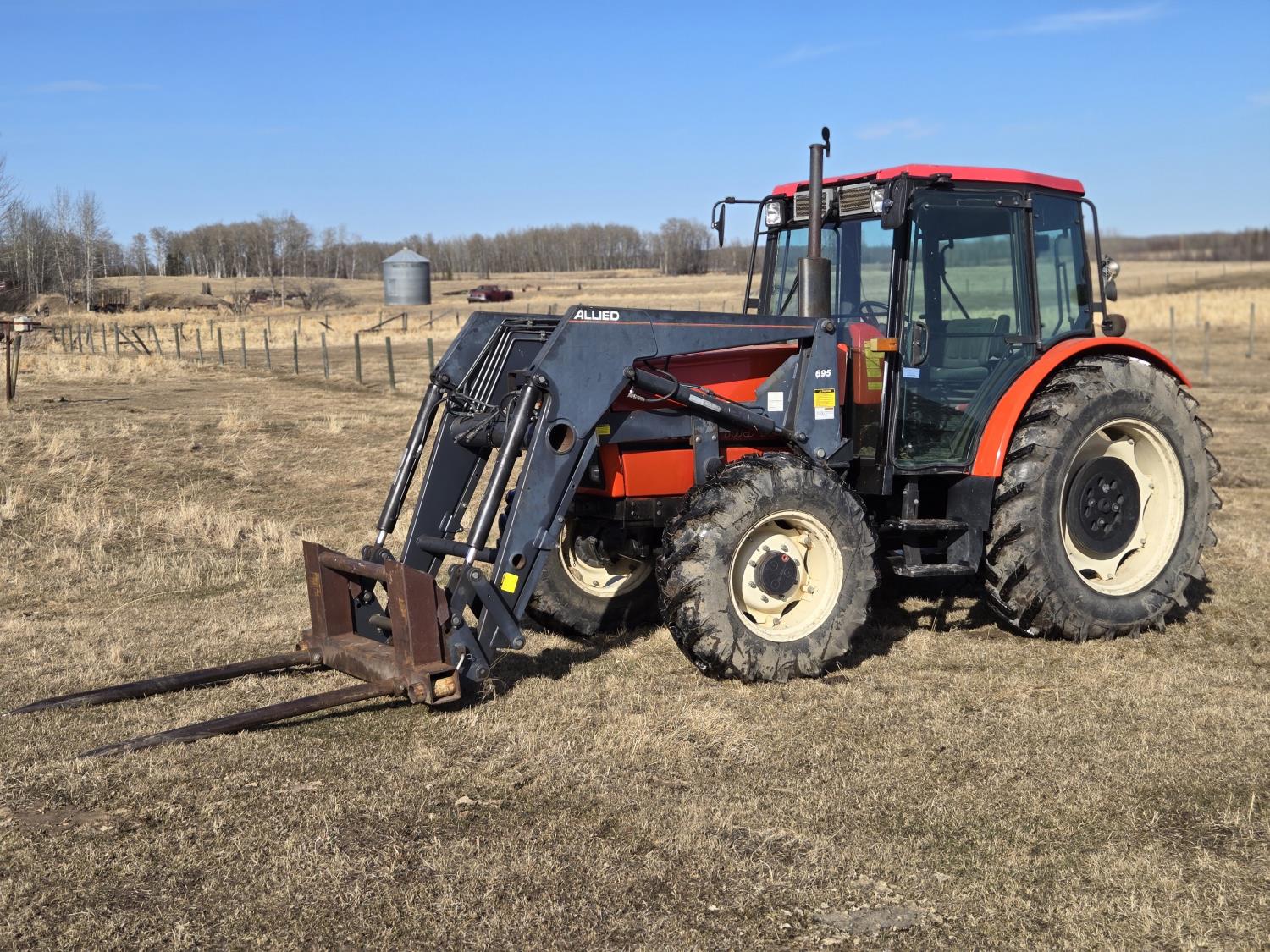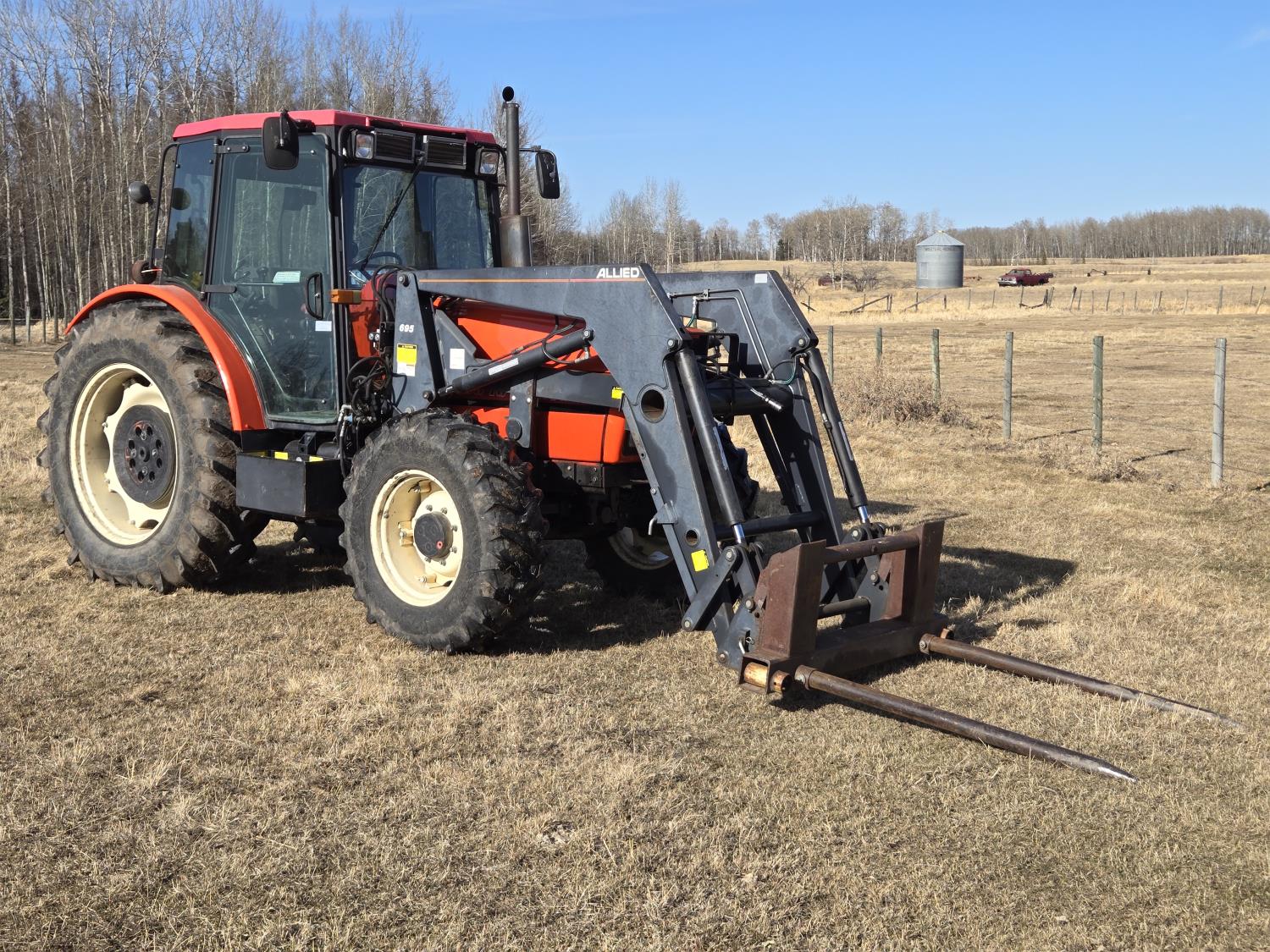 Allied 695 loader, bucket, grapple, bale forks, 4 cylinder diesel engine, 18 speed manual transmission, cab, rear differential lock, joystick, A/C, radio, 540 PTO, 3 point hitch, 2 rear hydraulic outlets, rear wheel weights, 13.6-24 front tires, 18.4R38 rear tires