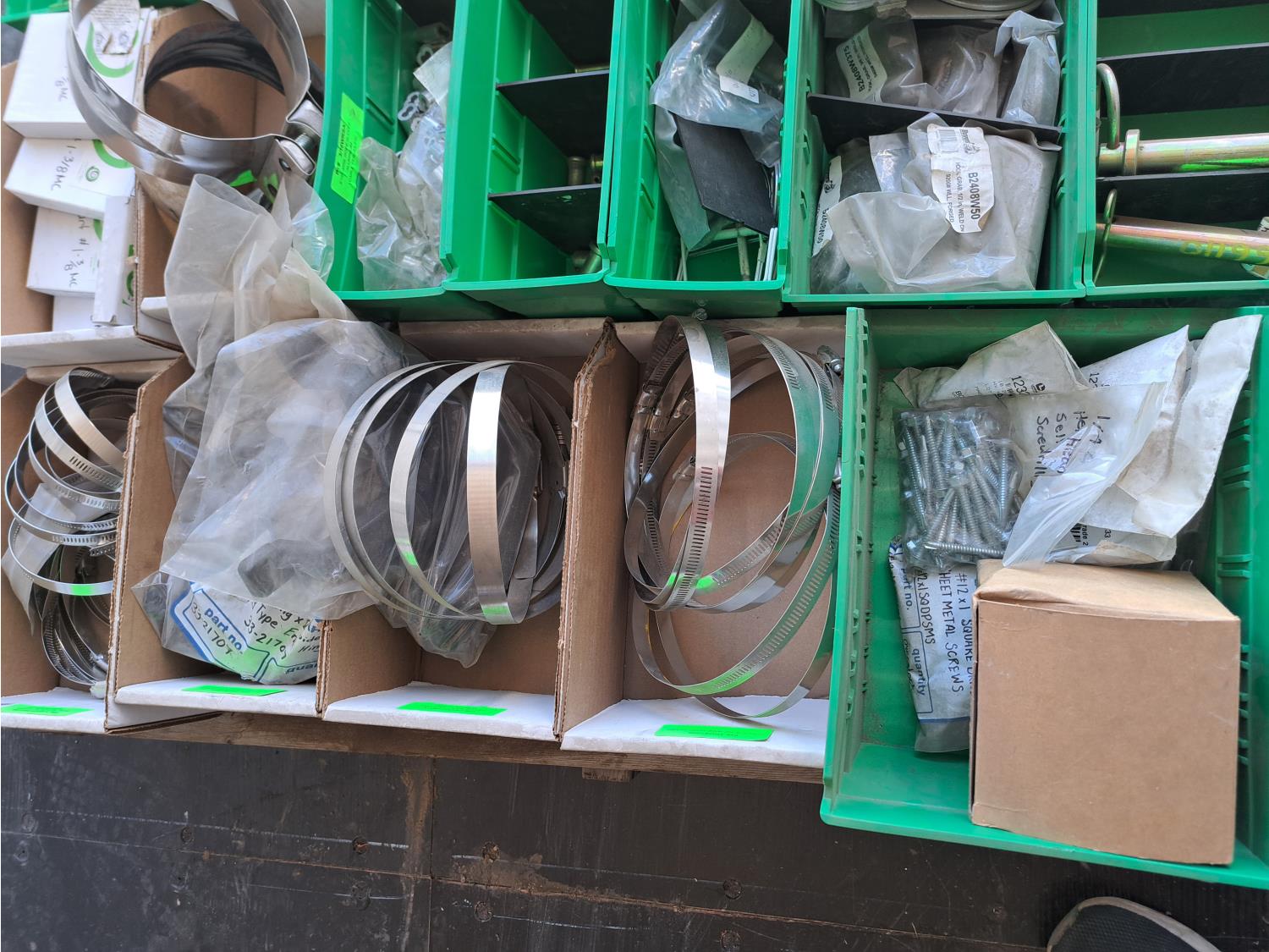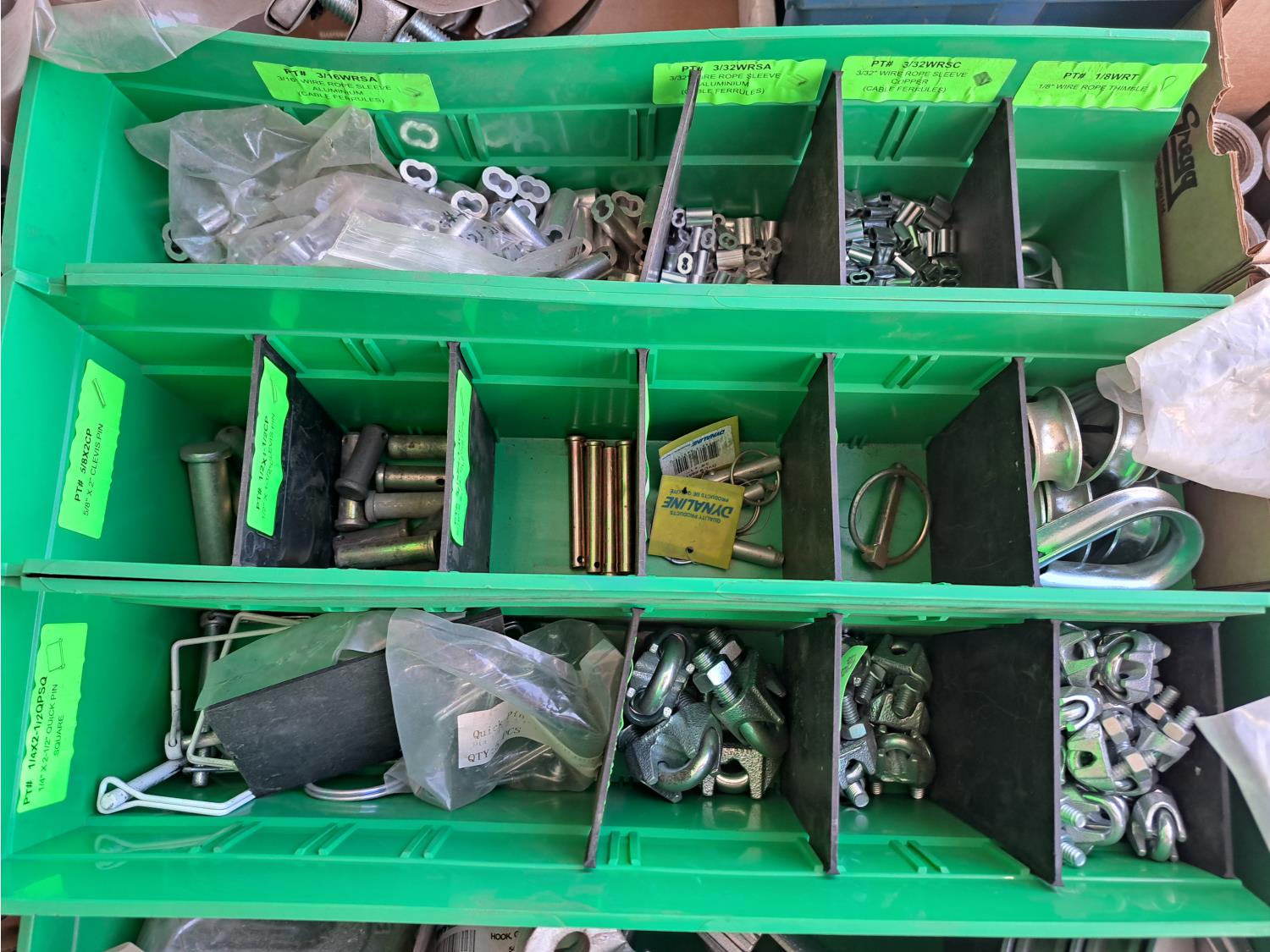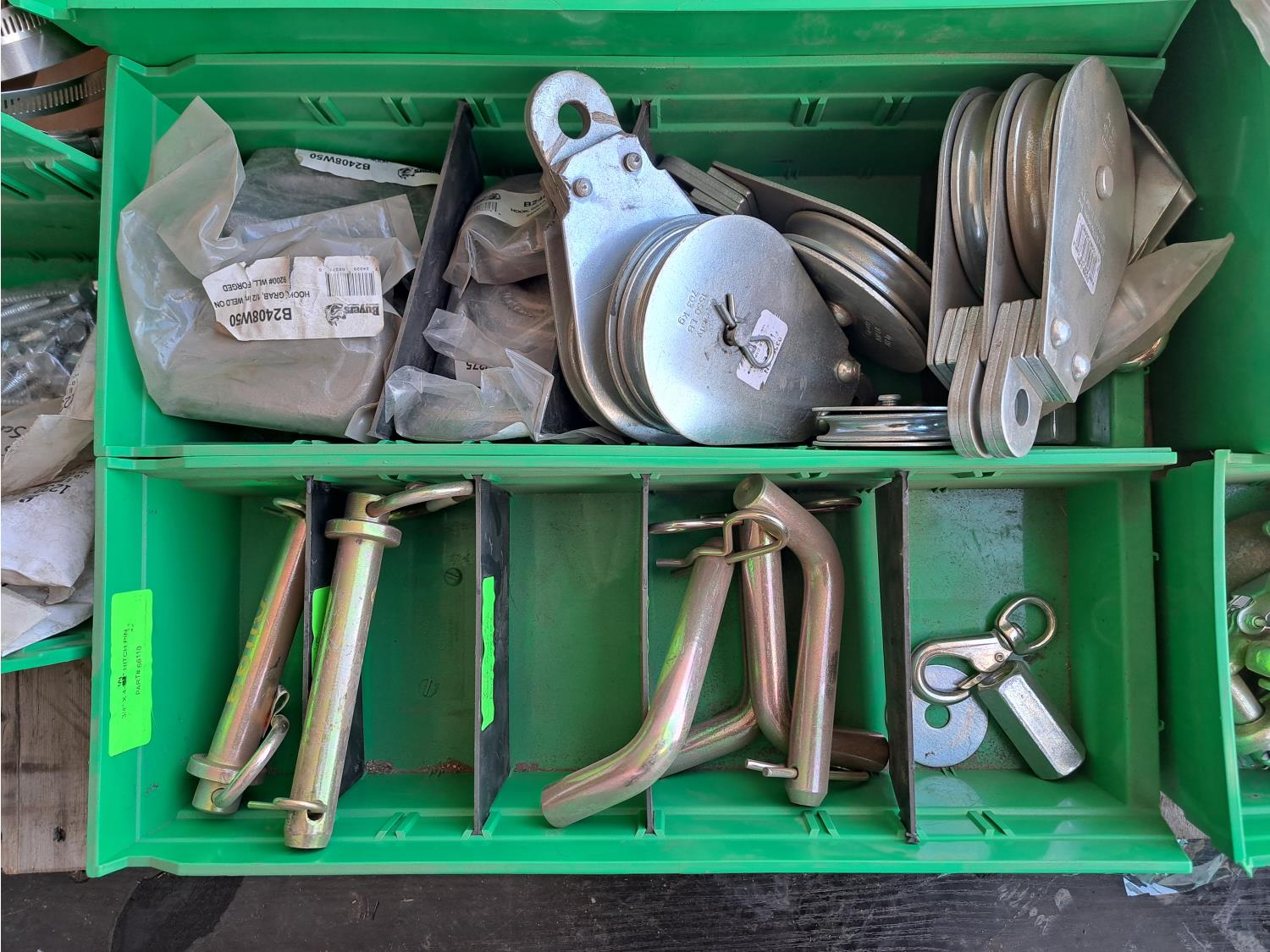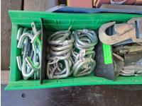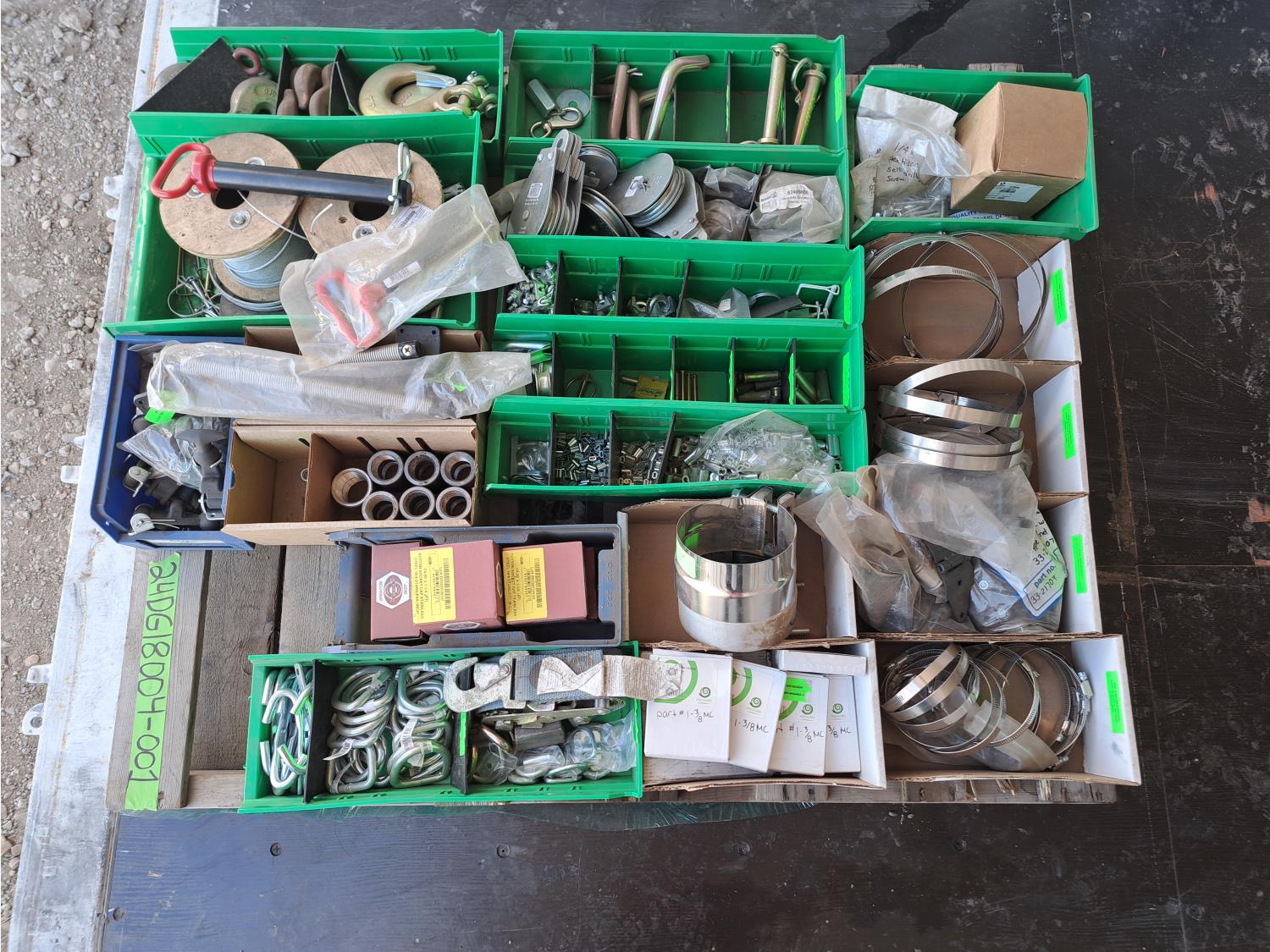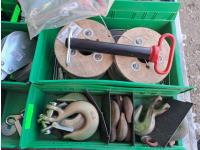 Various sizes of hitch pins, hose clamps, aircraft cable and clamps, small snatch blocks, chain hooks, D-rings, muffler clamps, hardware fasteners.