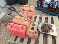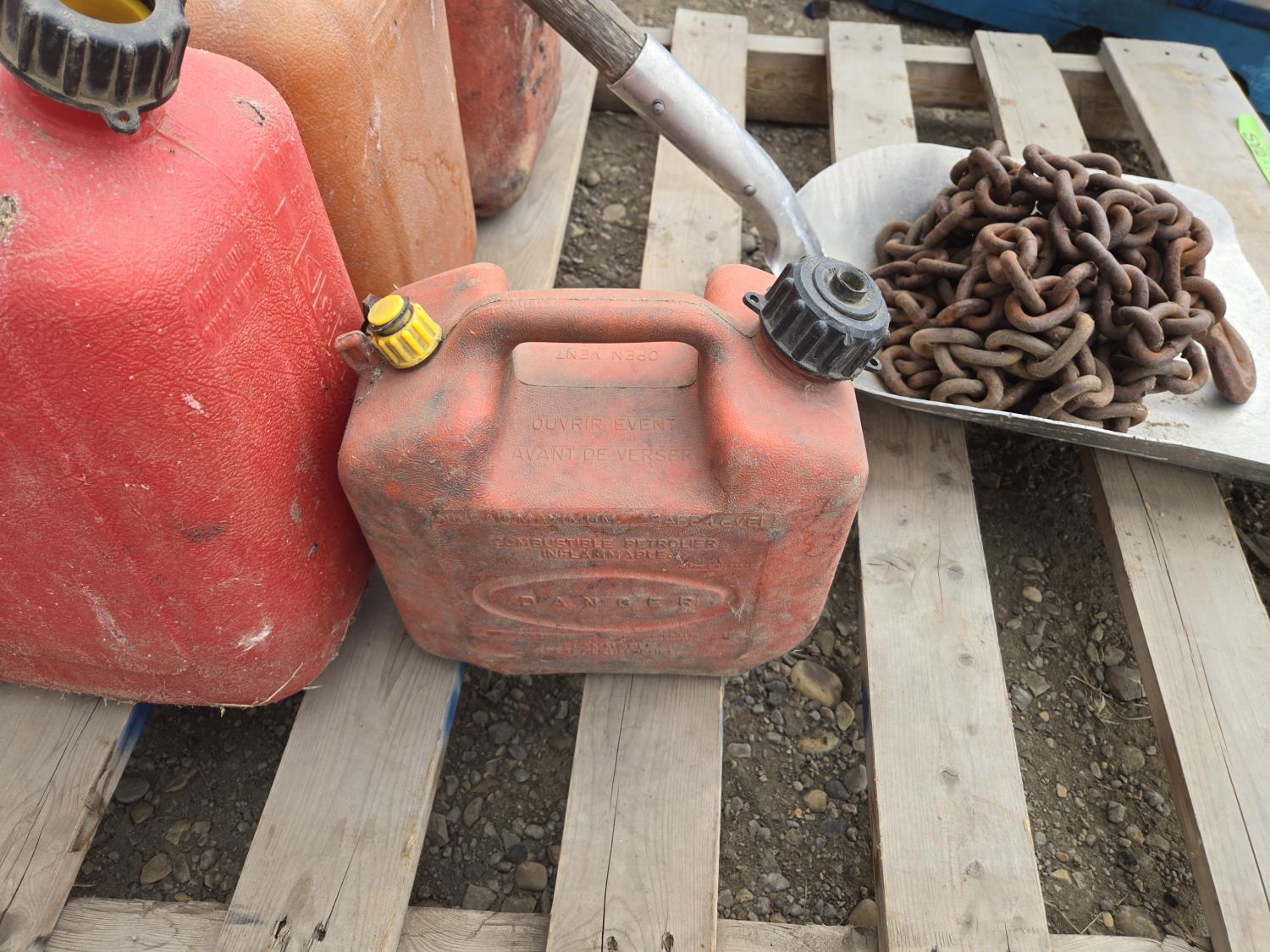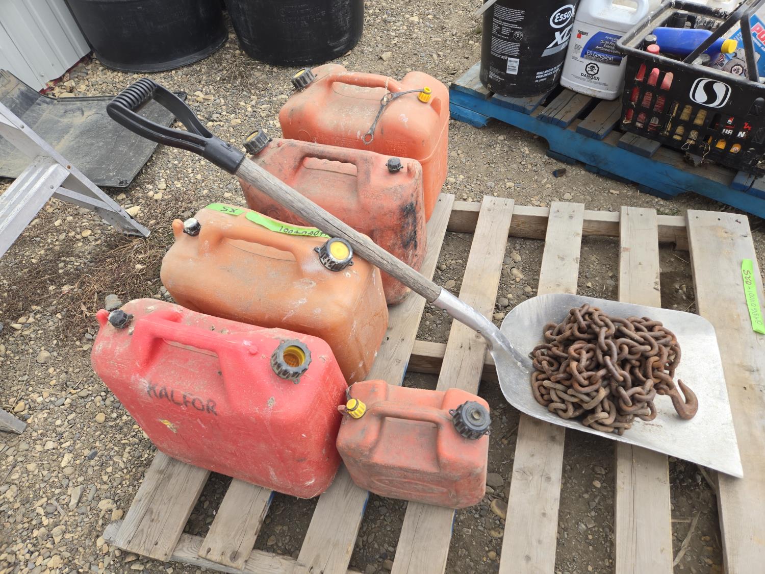 (4) 20 liter Jerry cans, (1) 4 liter Jerry can, aluminum scoop shovel, (1) chain