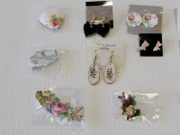 (6) earrings, (8) broches, cut china