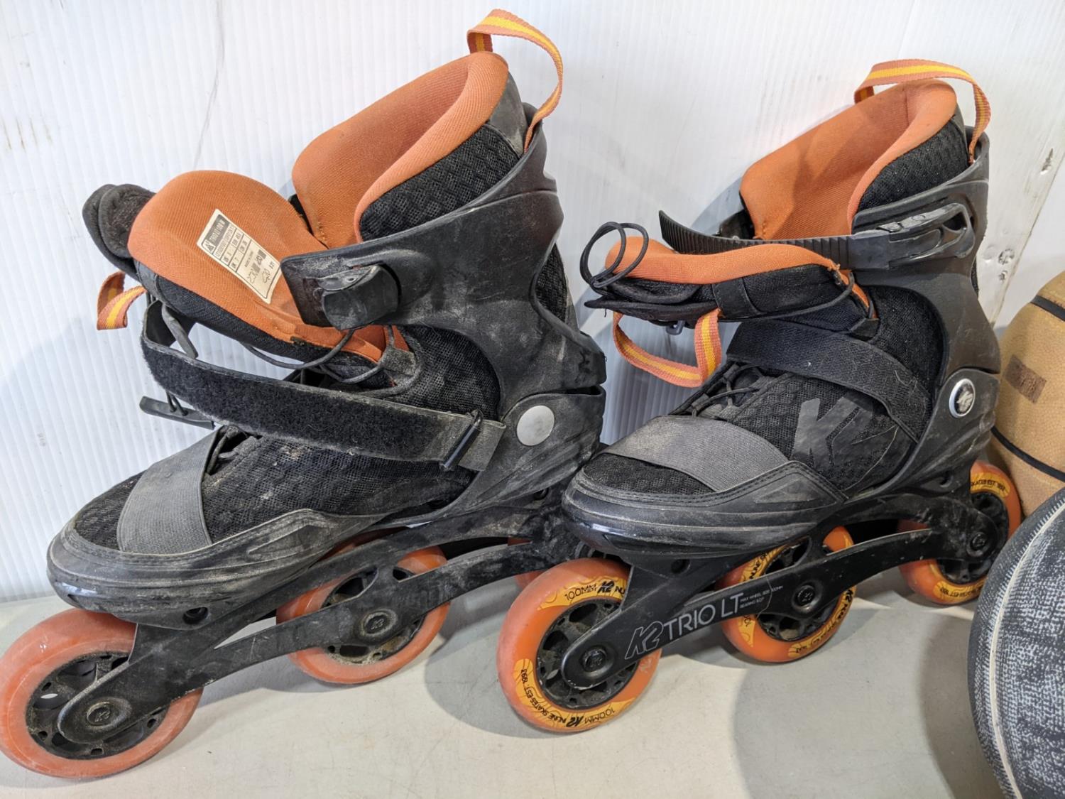 (3) pairs of rollerblades, (2) baseball gloves, football, (3) basketballs
