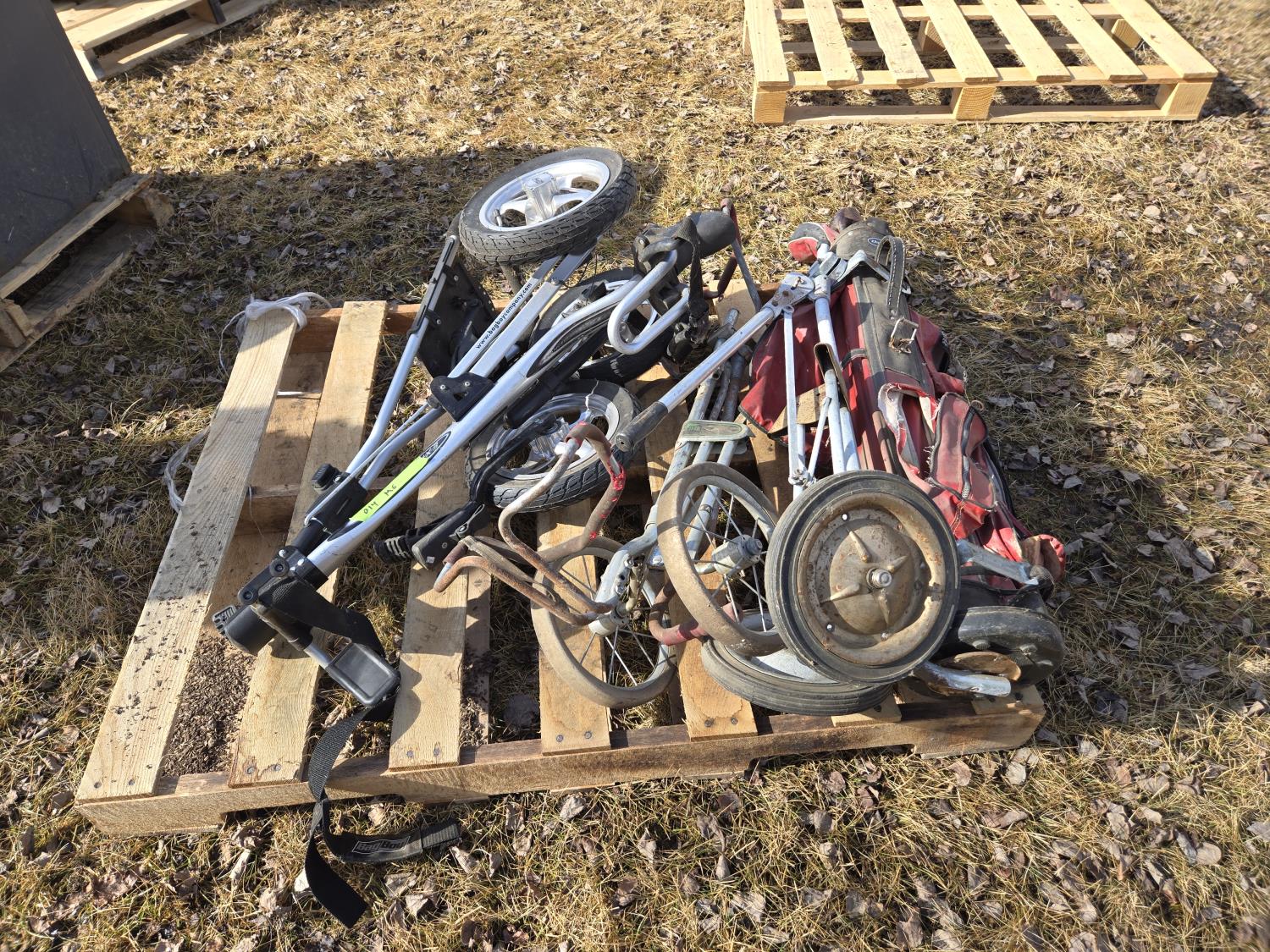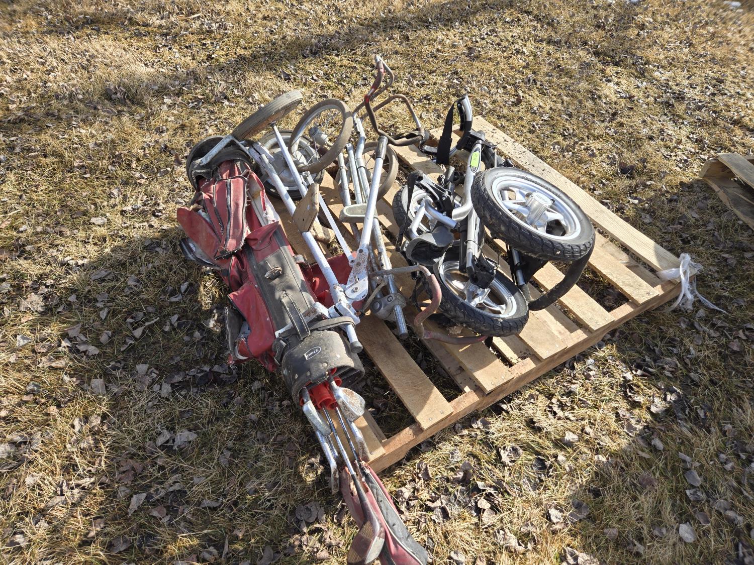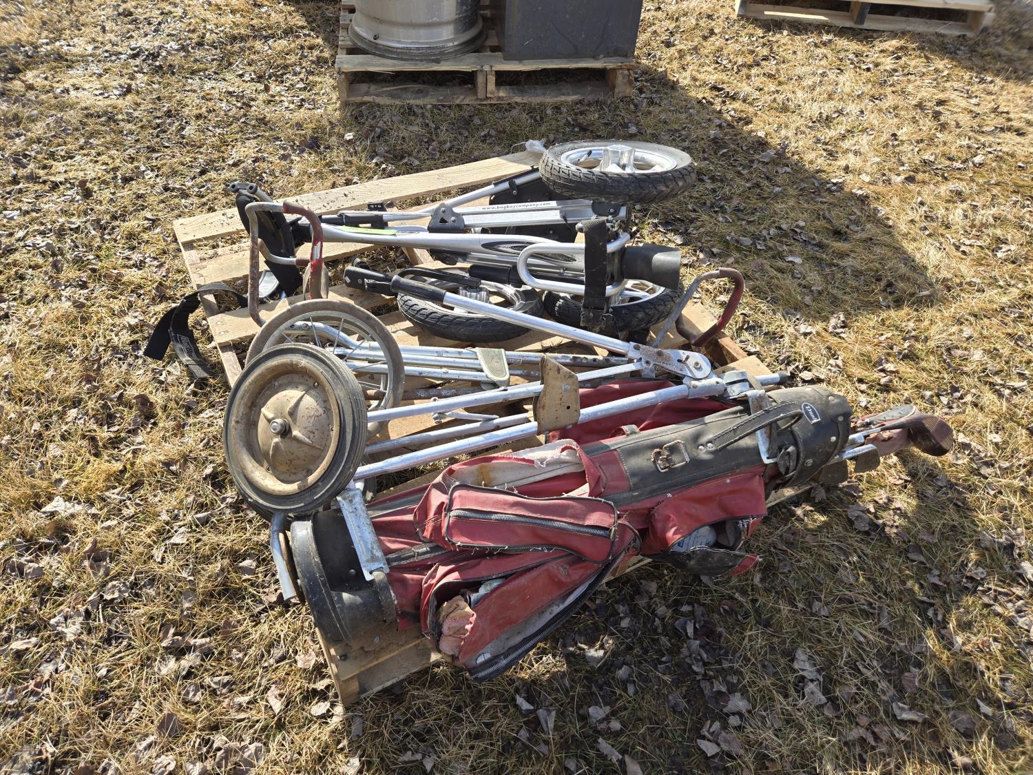 137 (3) Golf Bag Trolleys, (7) Golf Clubs with Bag, (1) Extra Wheel