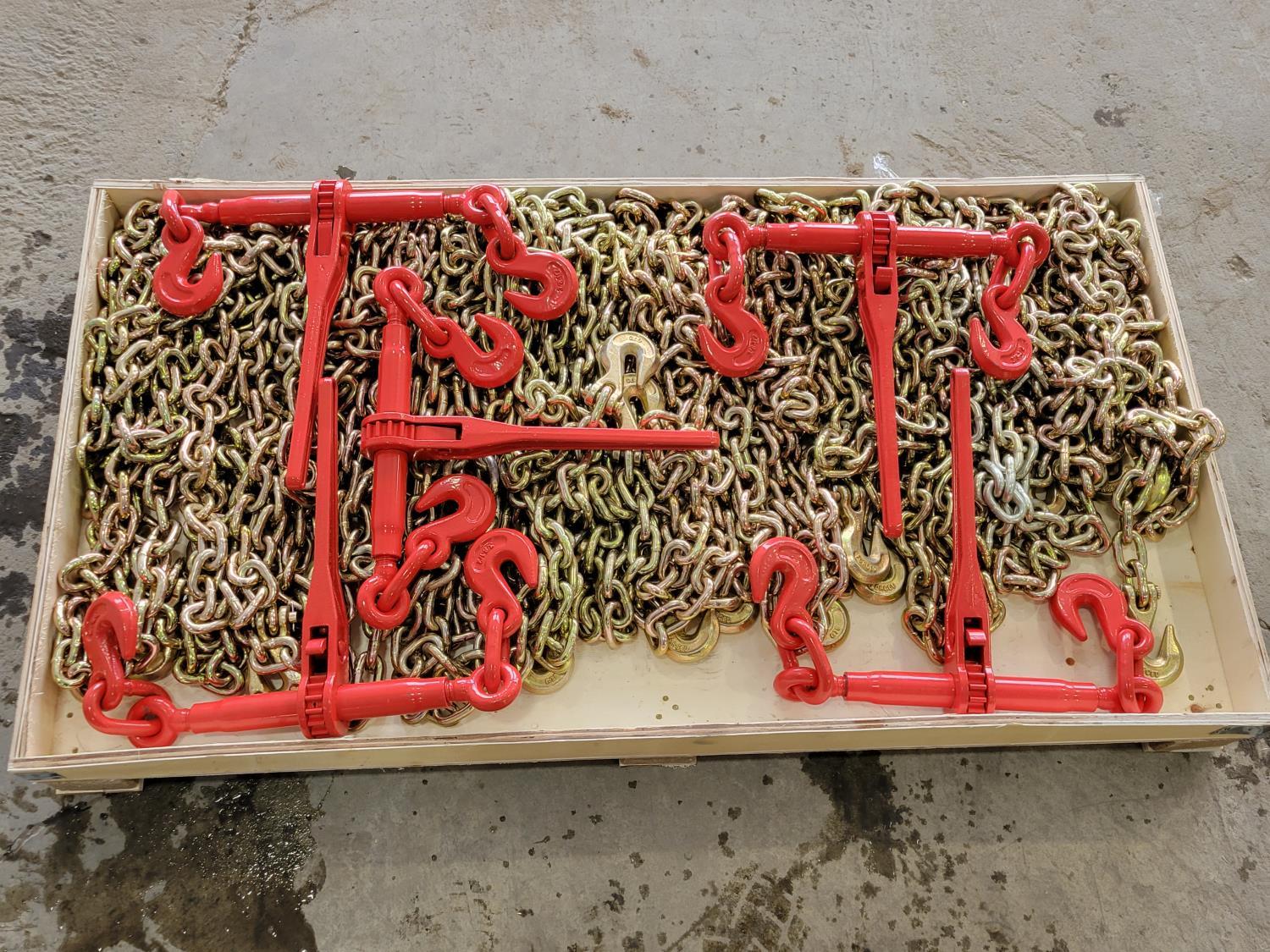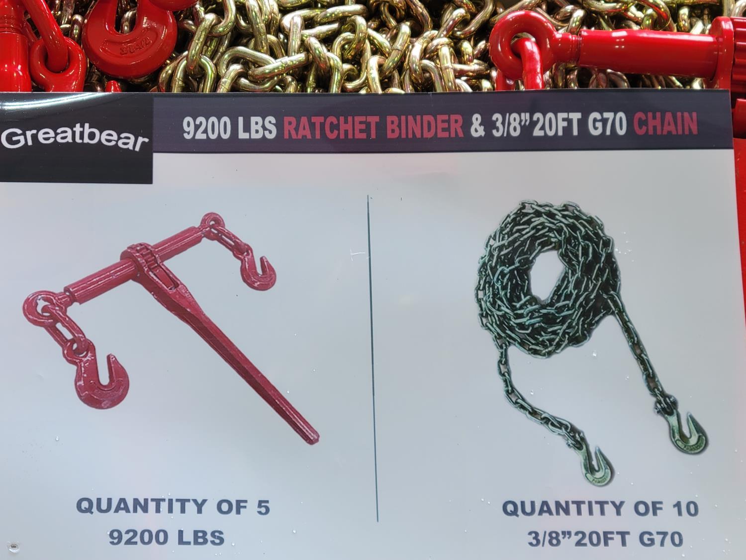 188 Greatbear (5) 9200 lb Ratchet Binders and (10) 3/8 Inch 20 Ft G70 Chain (Unused)