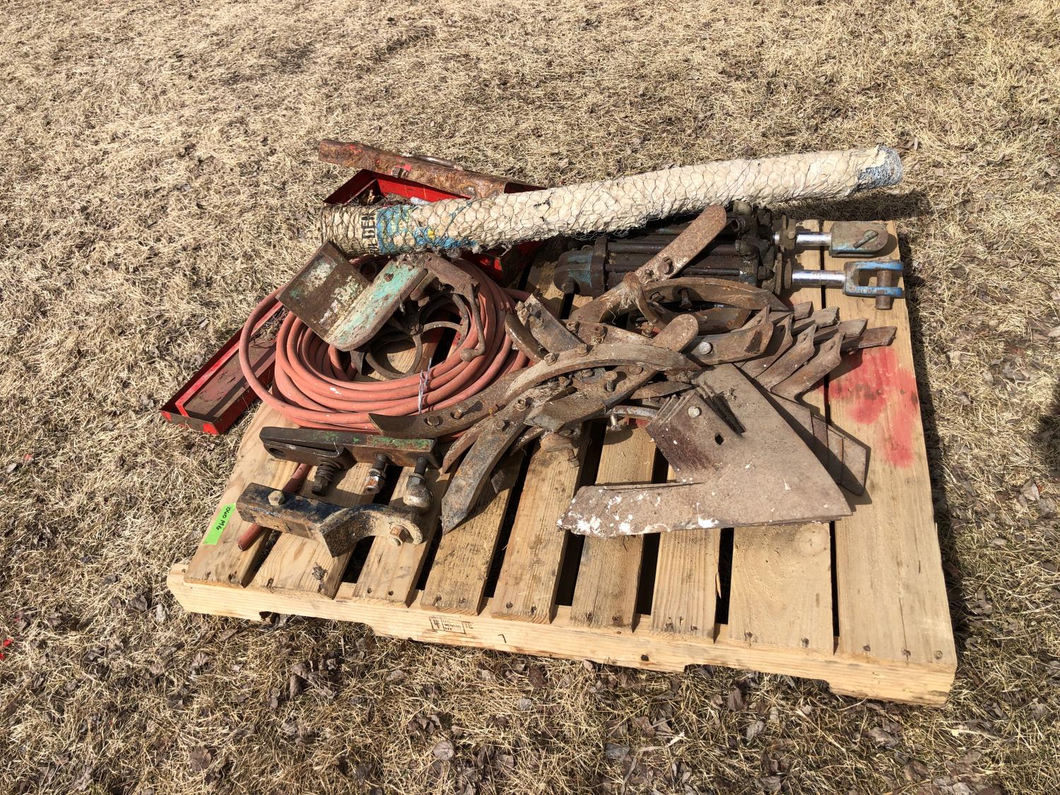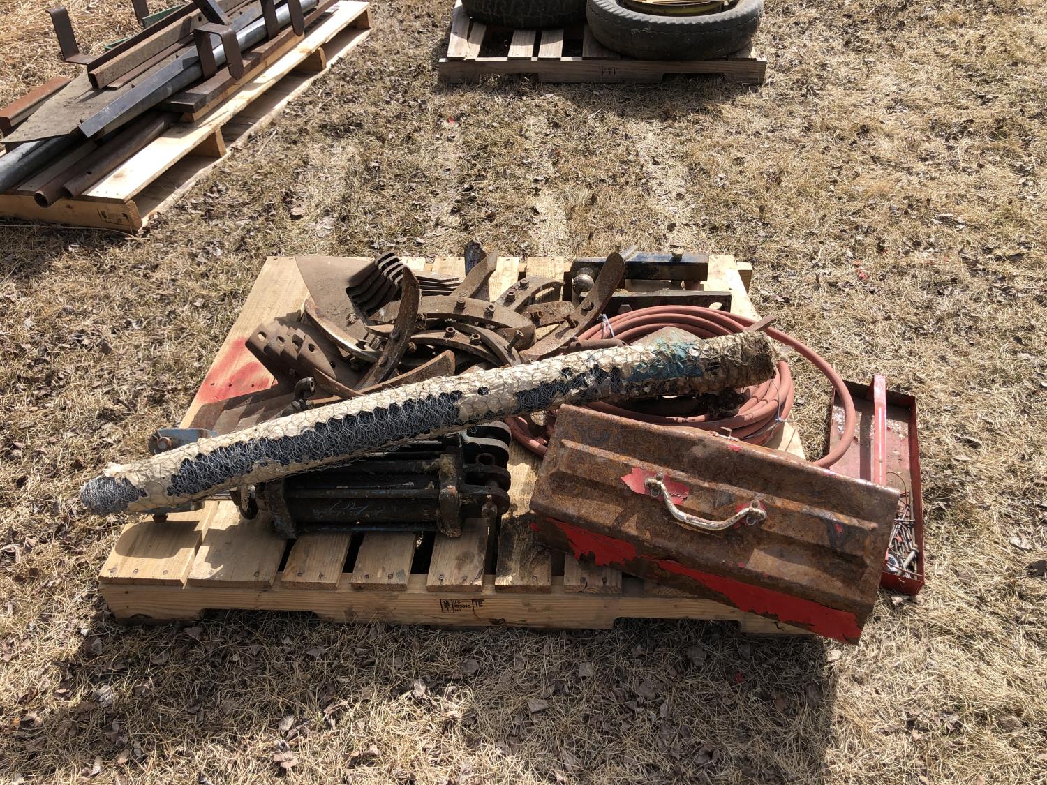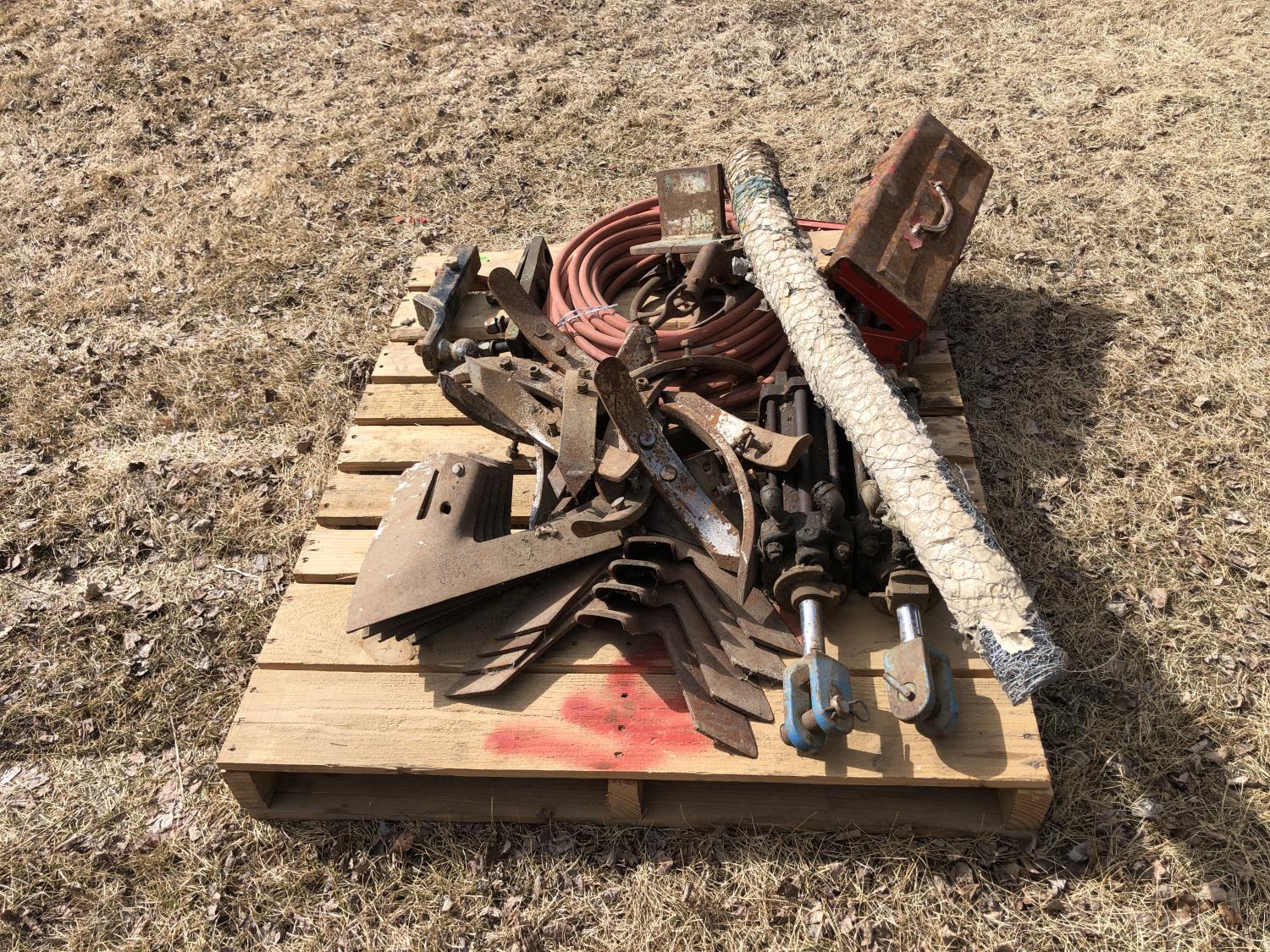 (2) Hydraulic cylinders, cultivator sweeps and spikes, tool box, rubber hose, (2) hitches