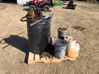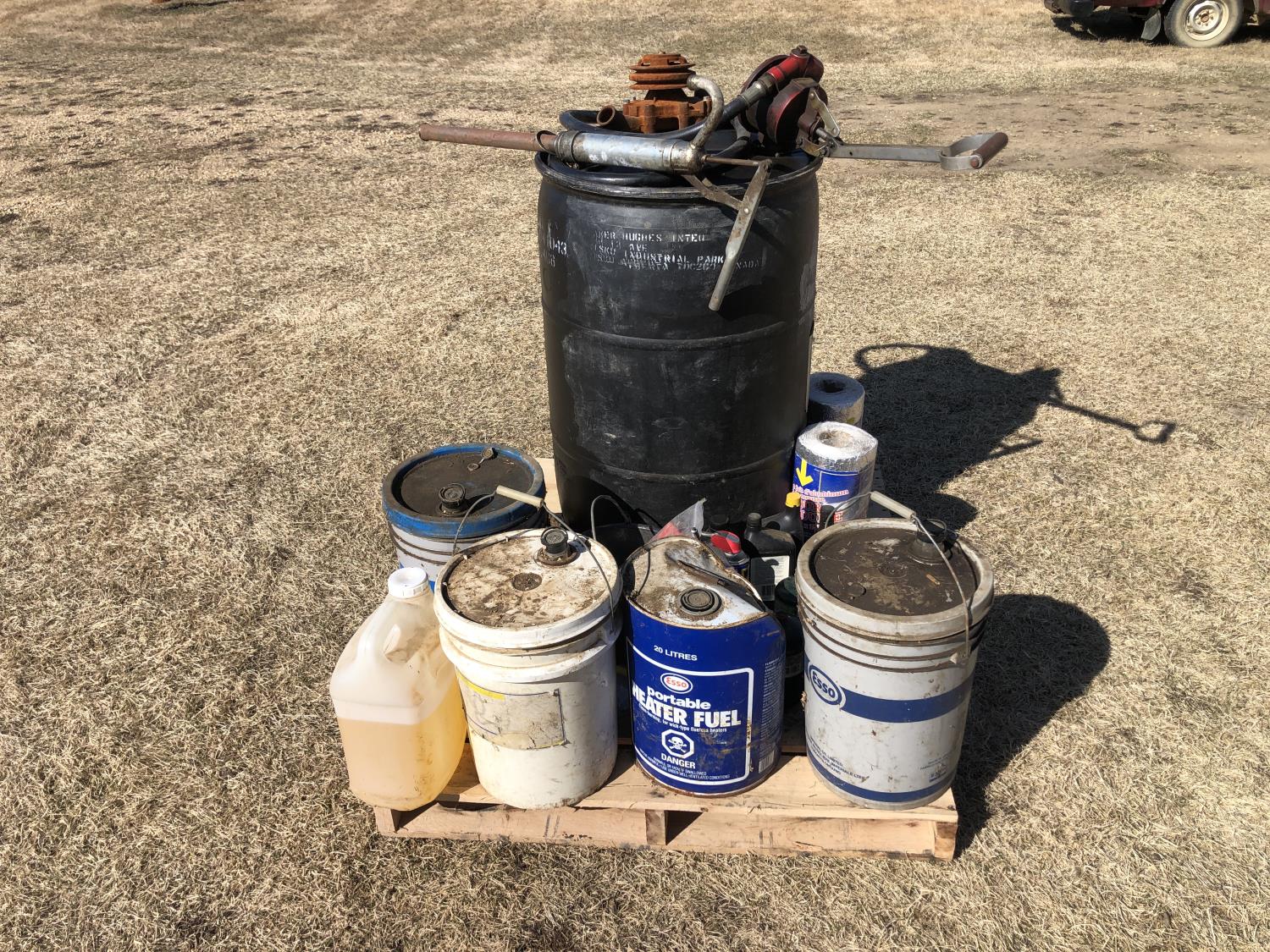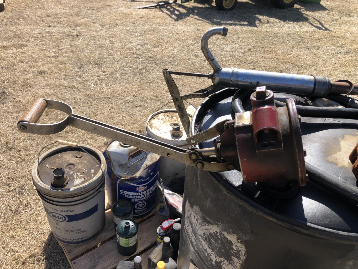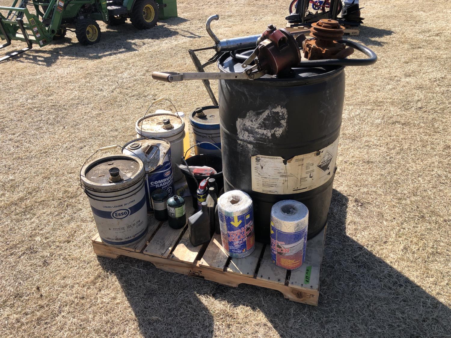 assorted oils, (2) hand pumps, (2) rolls of duct insulation, poly barrel, belt driven pump, poly fuel nozzle