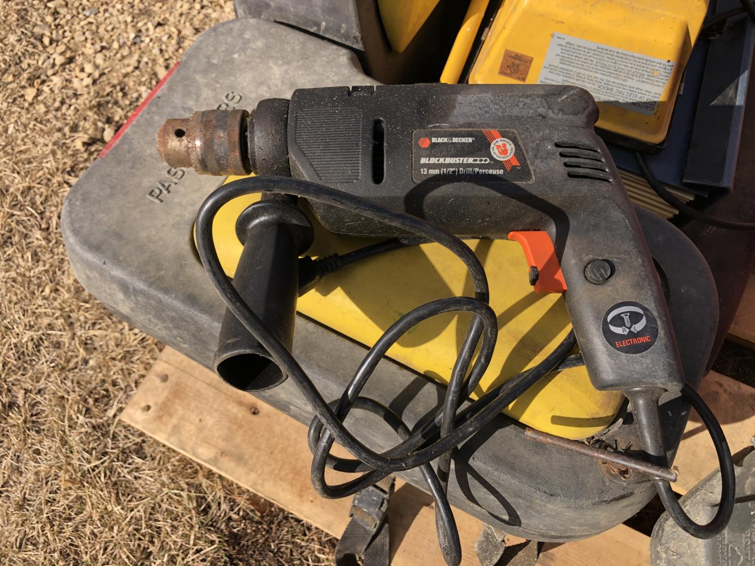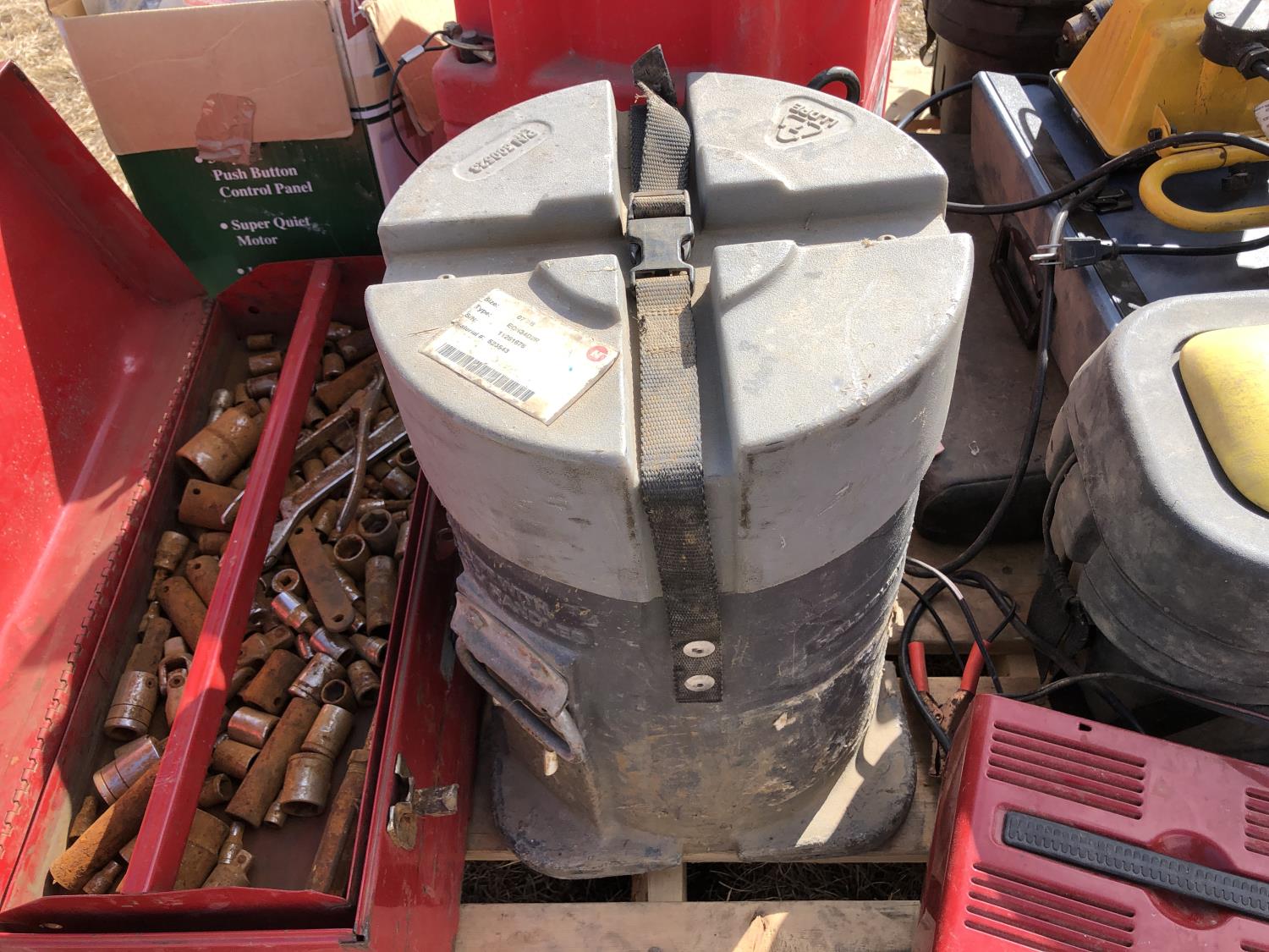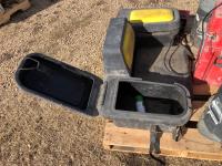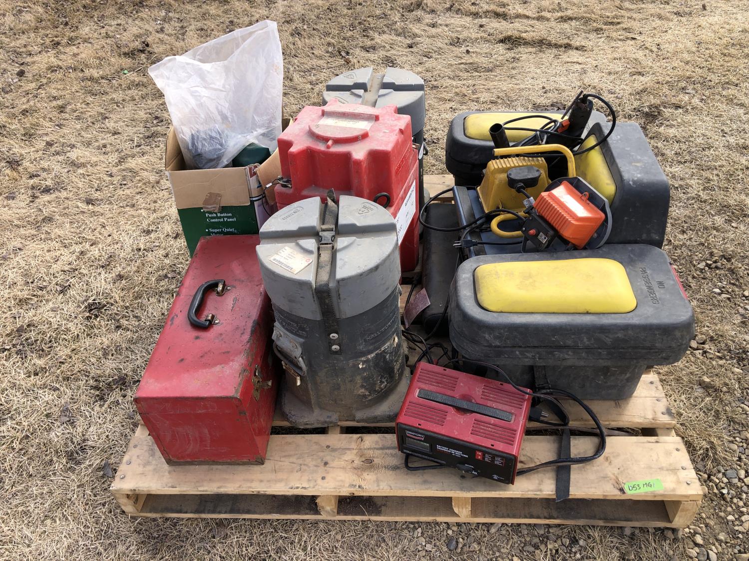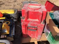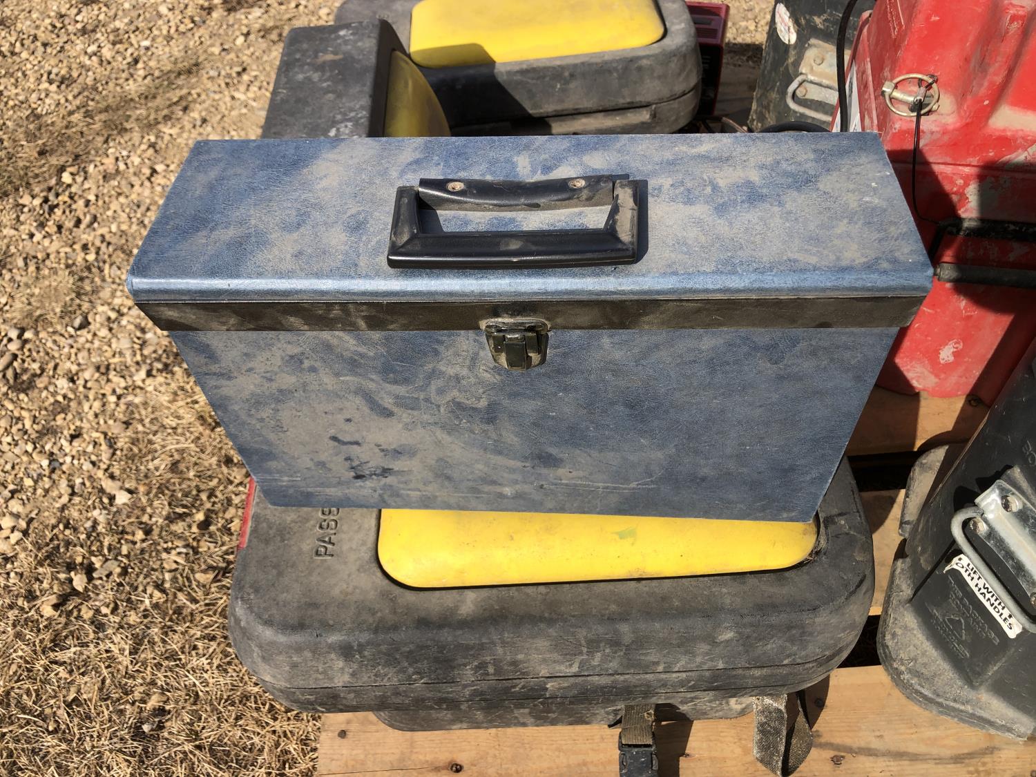 Tool box with contents, (3) drill bit boxes, 12 volt battery charger, quad seat, (2) lights, B&D drill, air mattress