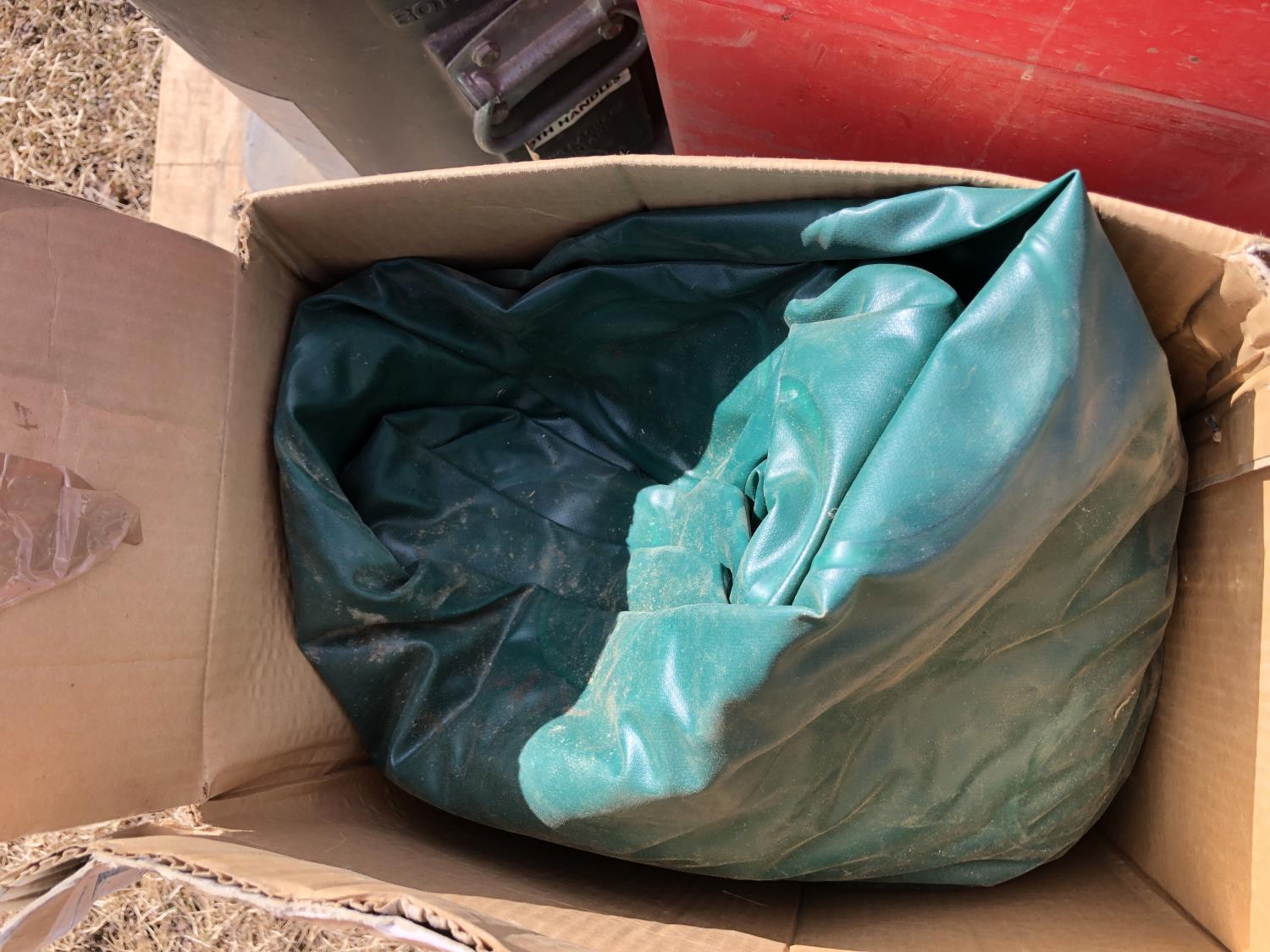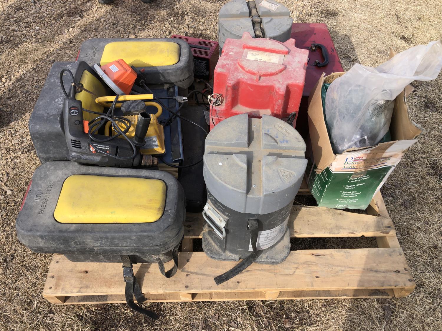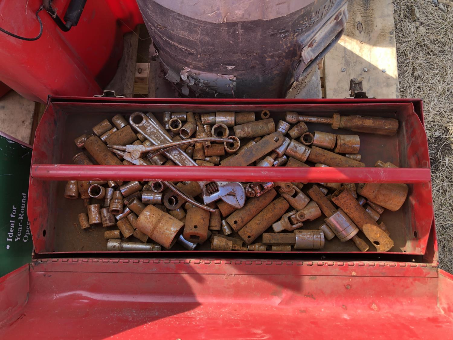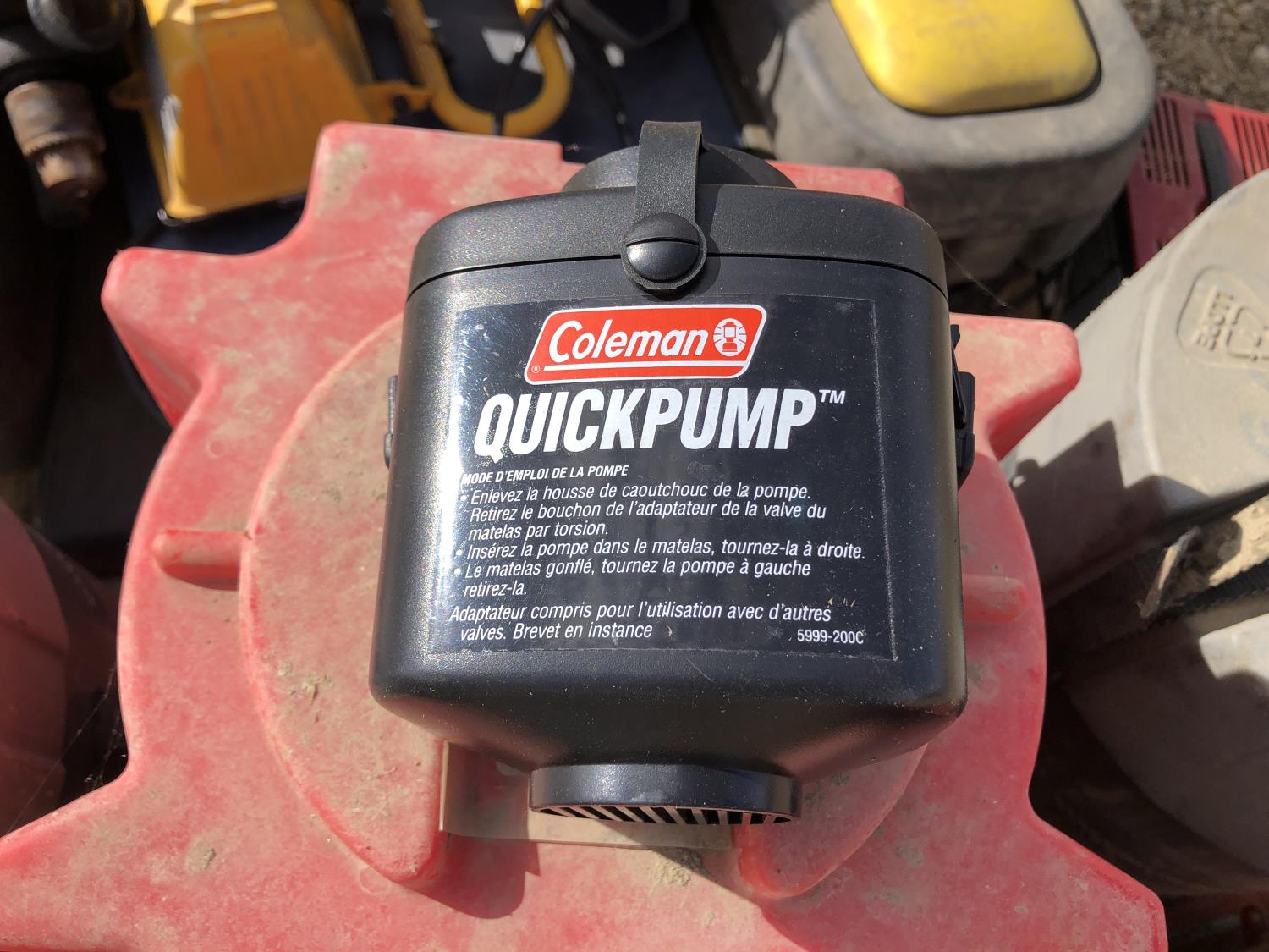 Tool box with contents, (3) drill bit boxes, 12 volt battery charger, quad seat, (2) lights, B&D drill, air mattress