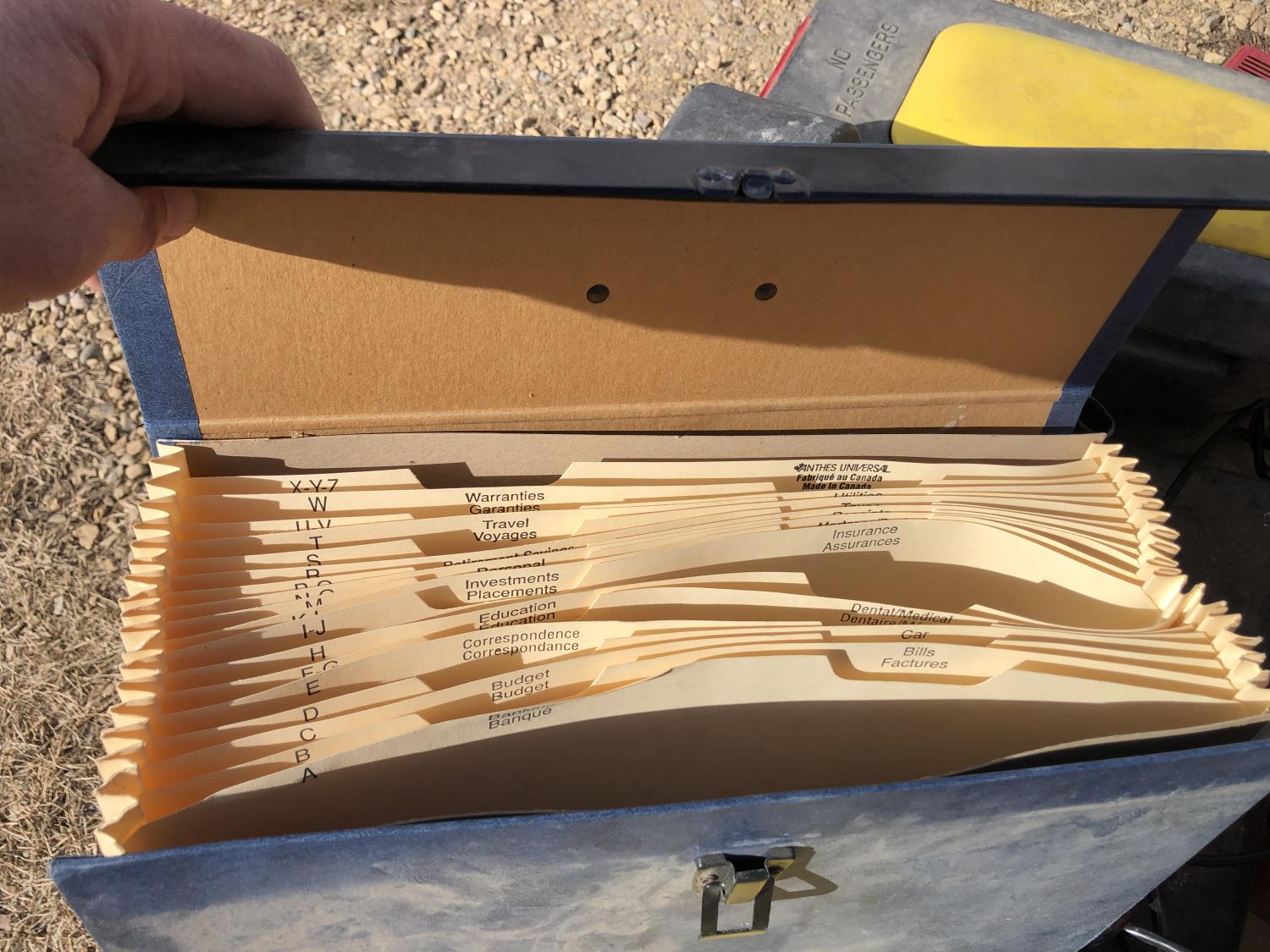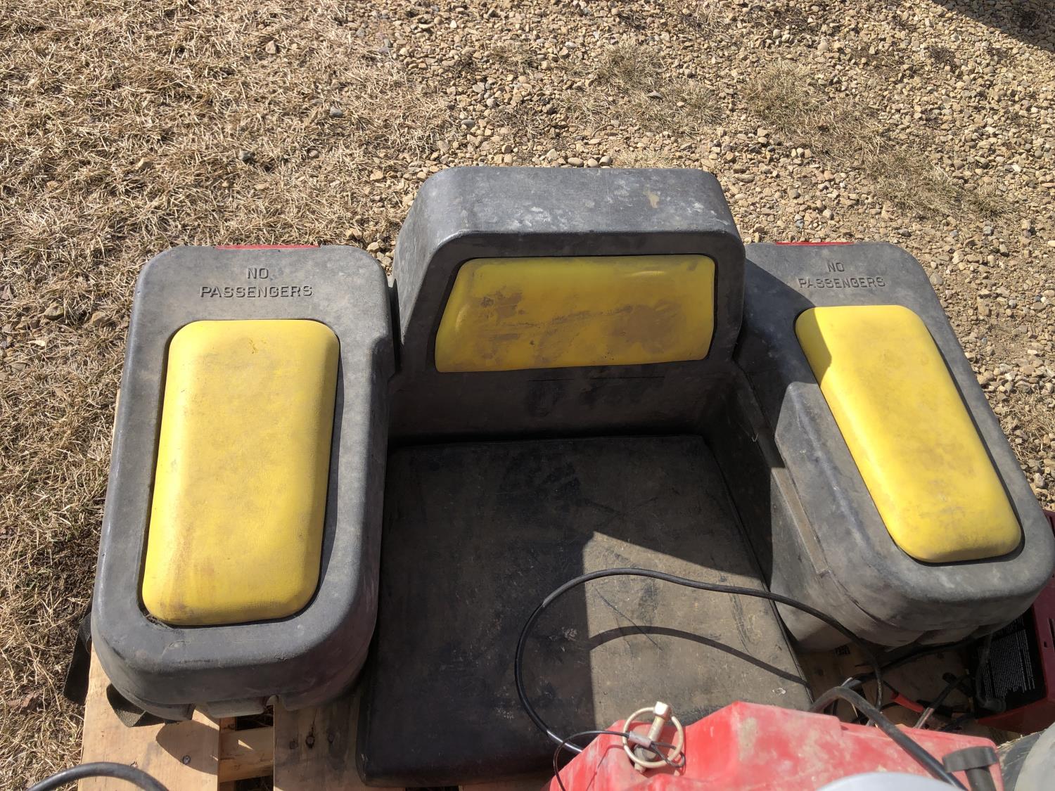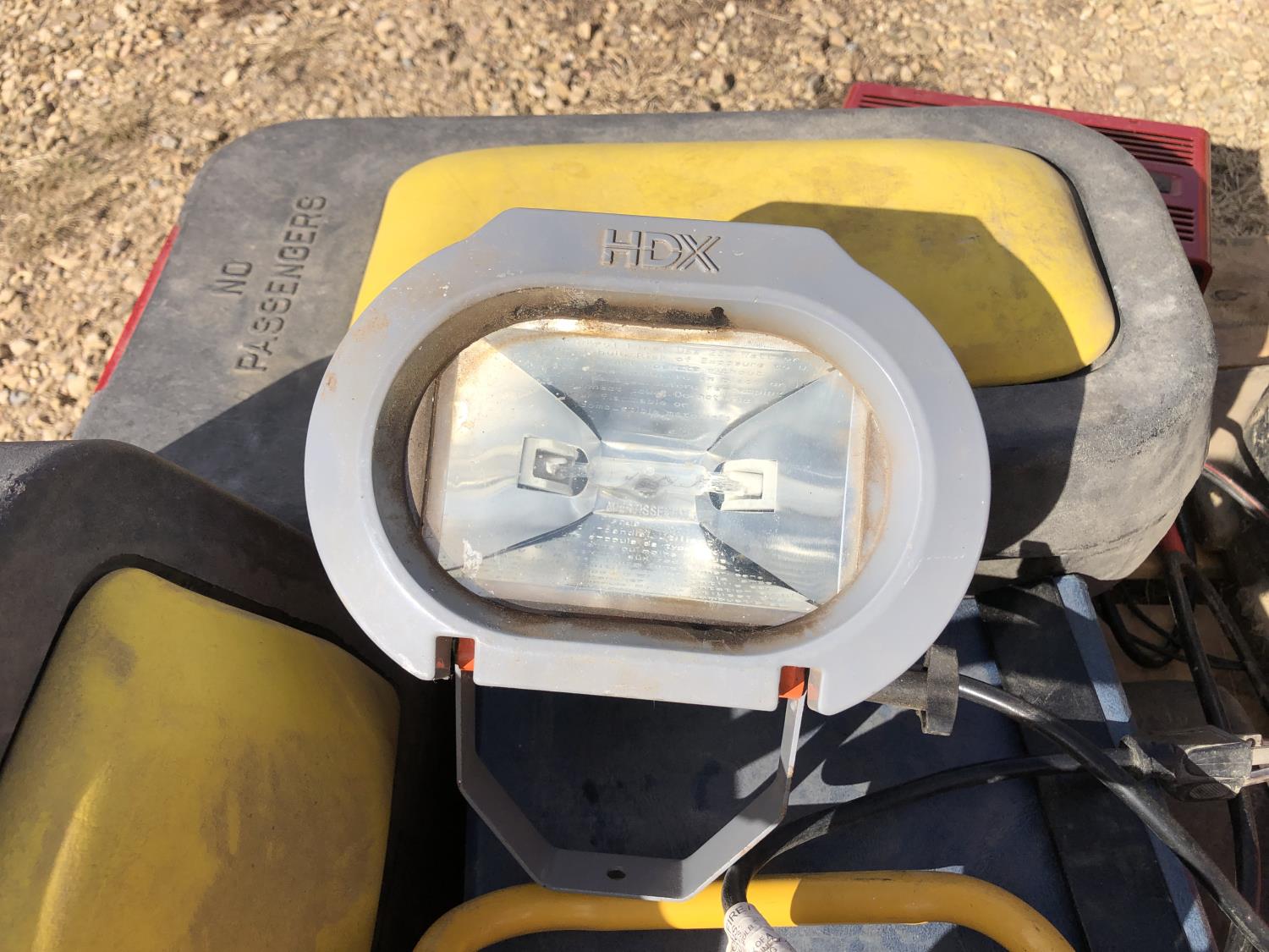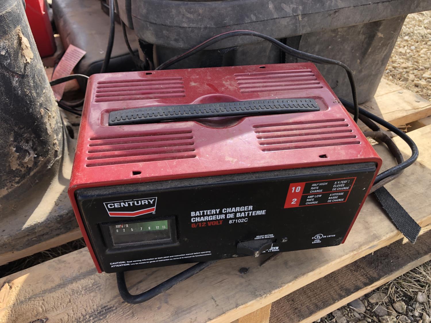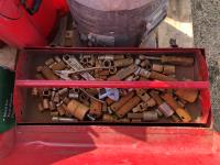 Tool box with contents, (3) drill bit boxes, 12 volt battery charger, quad seat, (2) lights, B&D drill, air mattress