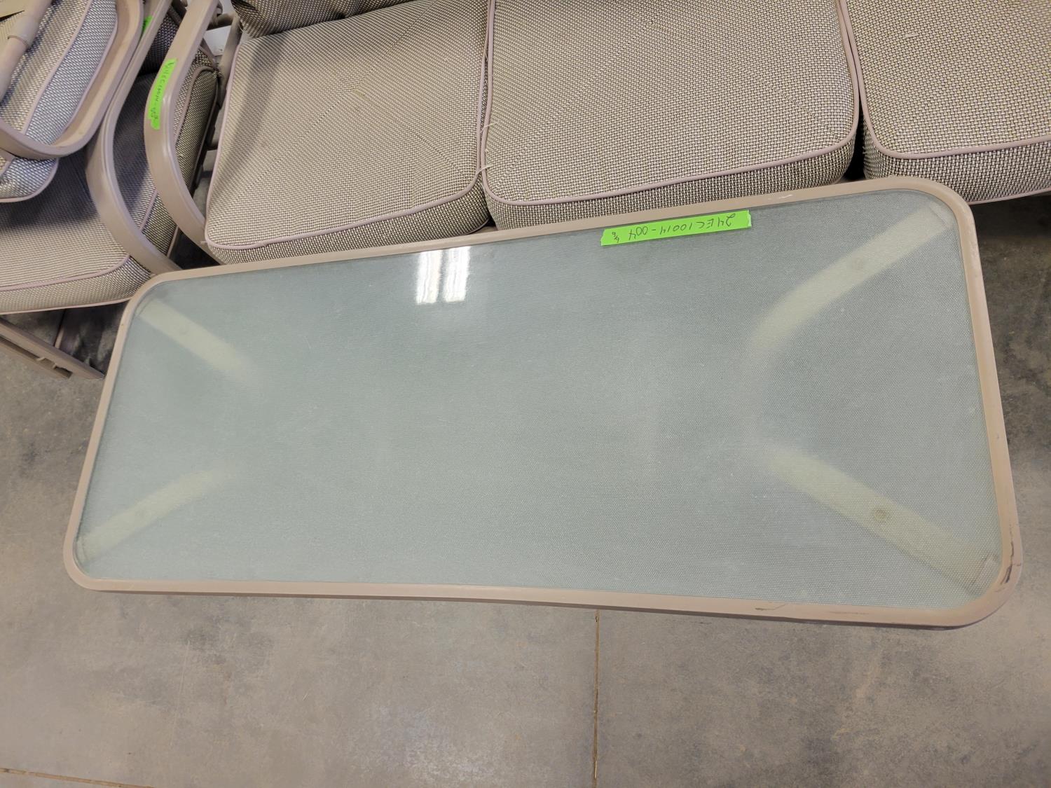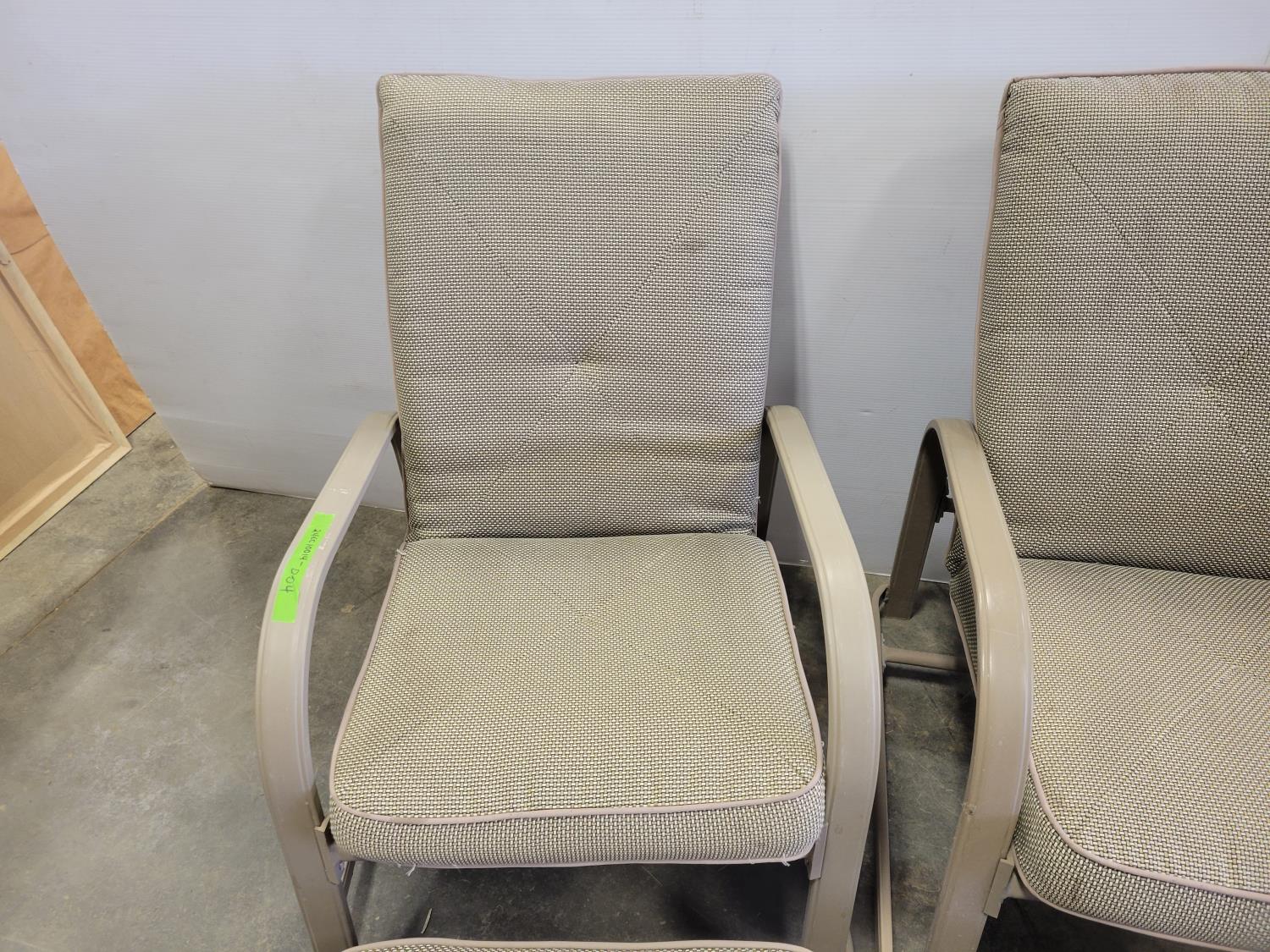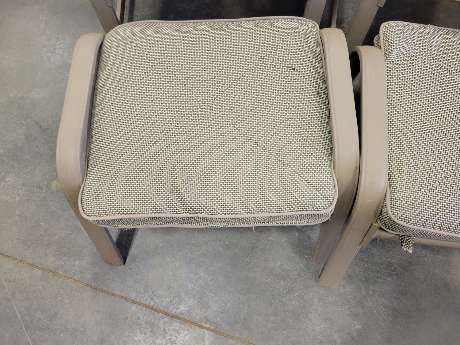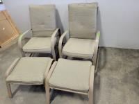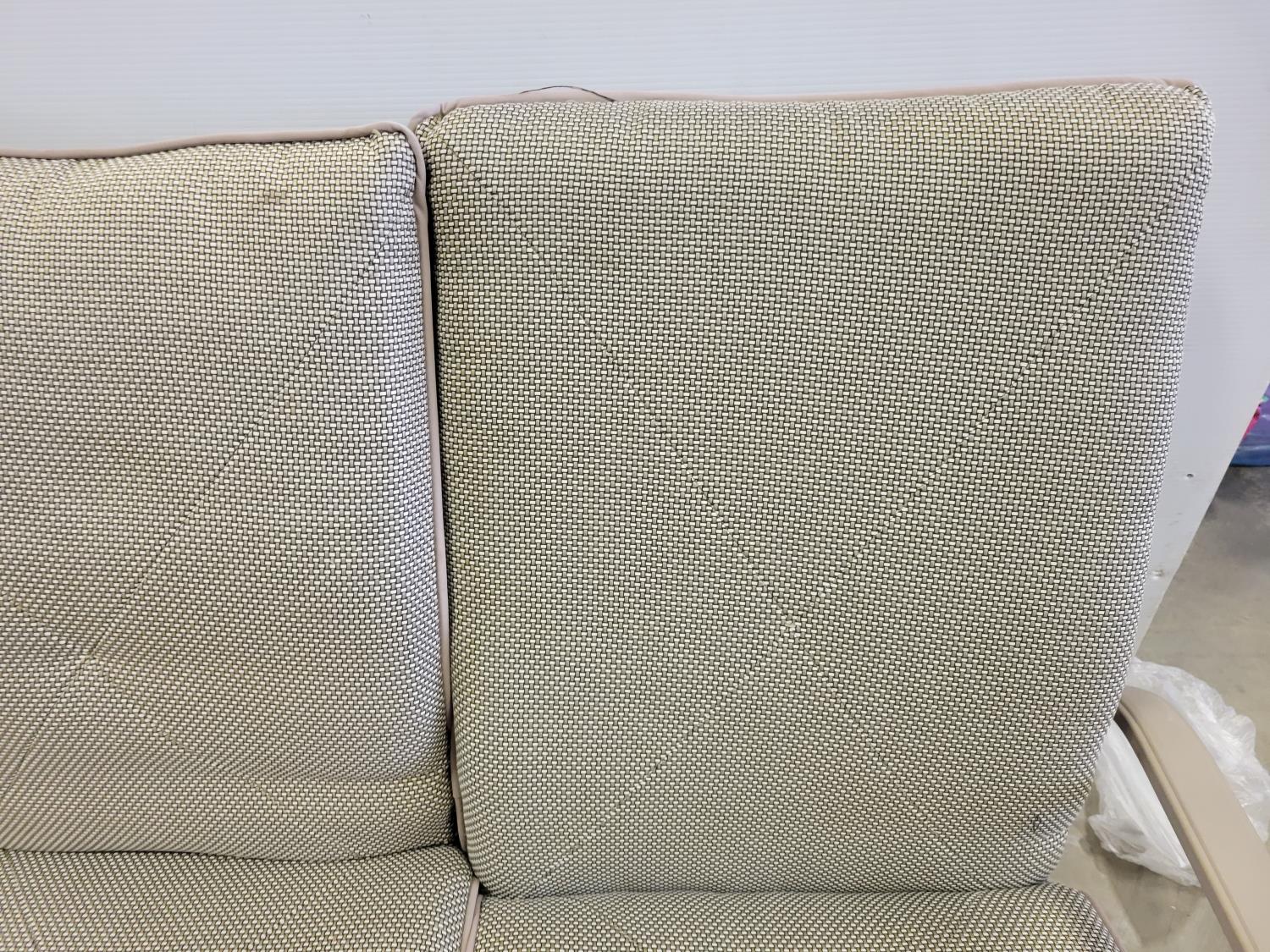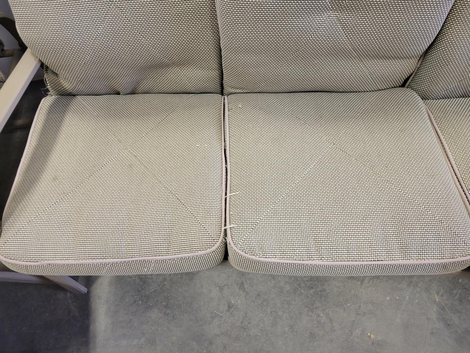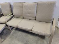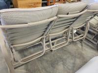 coffee table, 3 seater bench with cushions, (2) chairs with foot stools with cushions