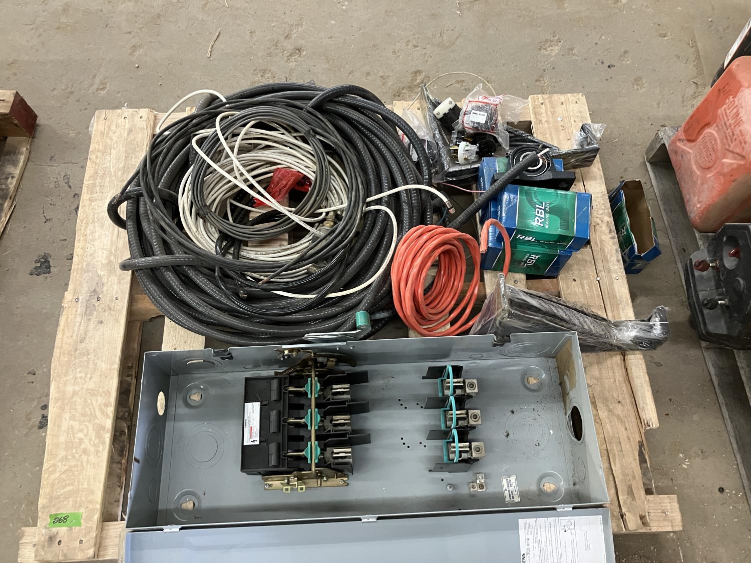 Siemens 200 Amp electrical panel, qty of TV cable, (50±) ft of heavy 2 wire cable, (4) 220 volt male plugs, (2) shelf brackets, (6) new bearings, (20±) 3 wire cable