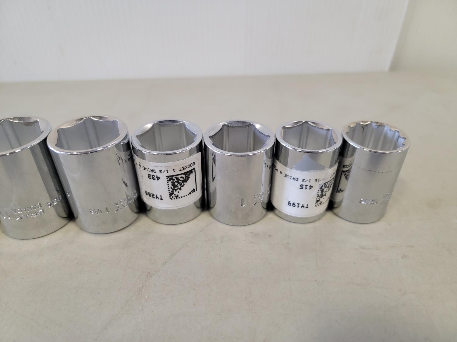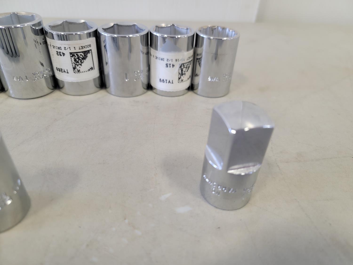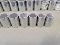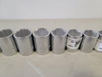 Assorted 1/2 inch drive sockets, 1/2 inch drive ratchet wrench, 1/2 inch - 3/4 inch adaptor