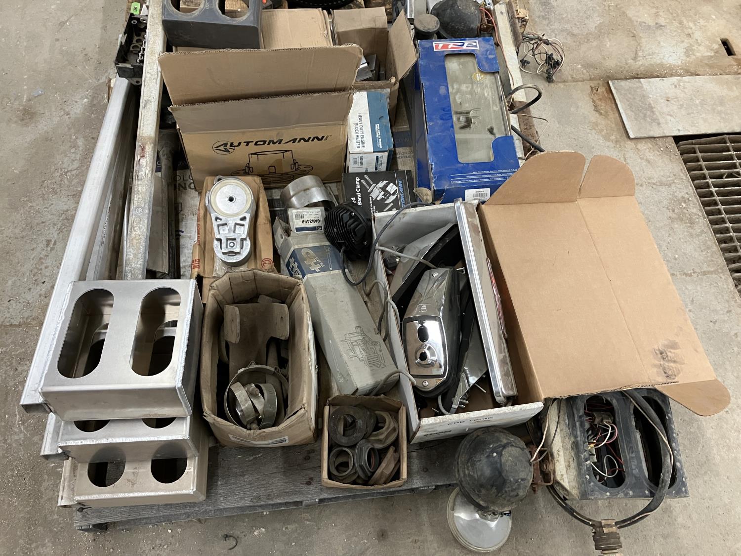(3) New aluminum light brackets, (2) used light brackets, (1) new trailer hub, (2) exhaust clamps, (4) new Paccar cab lights, Unused Detroit idler pulley, (3) aluminum mounting brackets, torque arm for differential, heavy duty block heater, scale pad mounting brackets,