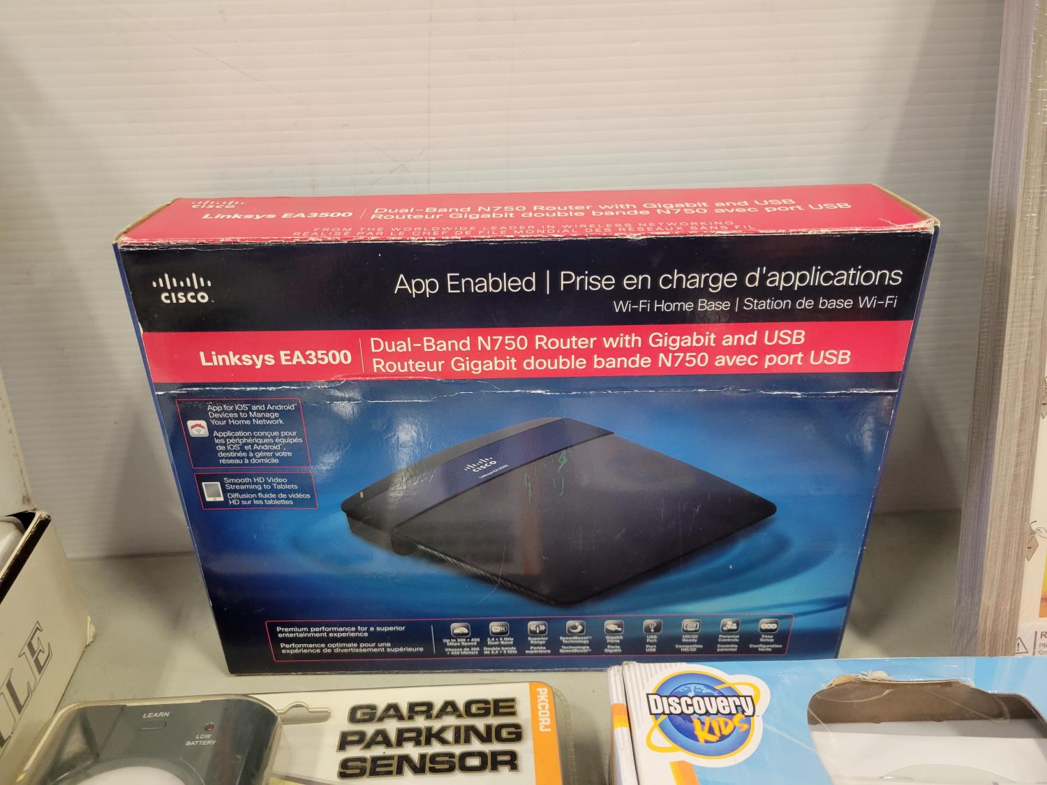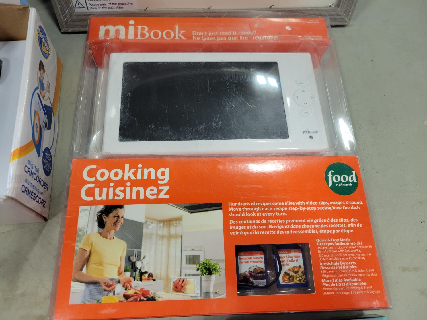 picture frame, router, garage parking sensor, digital camcorder, digital cook book, USB adapter, (2) wax seal stamps, 18V battery, ear cleaner with camera, bird feeder