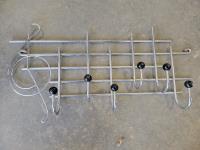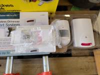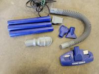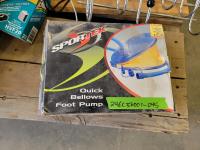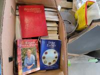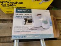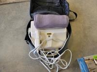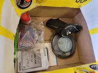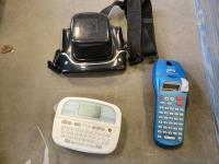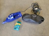 Black & Decker mini vacuum, bellows foot pump, (2) York dumbbells, wireless driveway alert system. (2) label makers, vintage camera, cast iron pot, wall mirror, therapeutic massager, qty of books