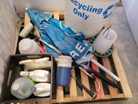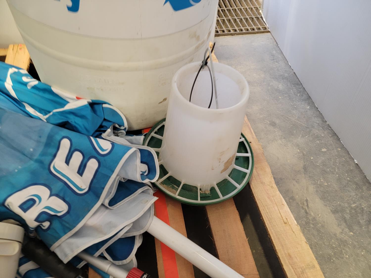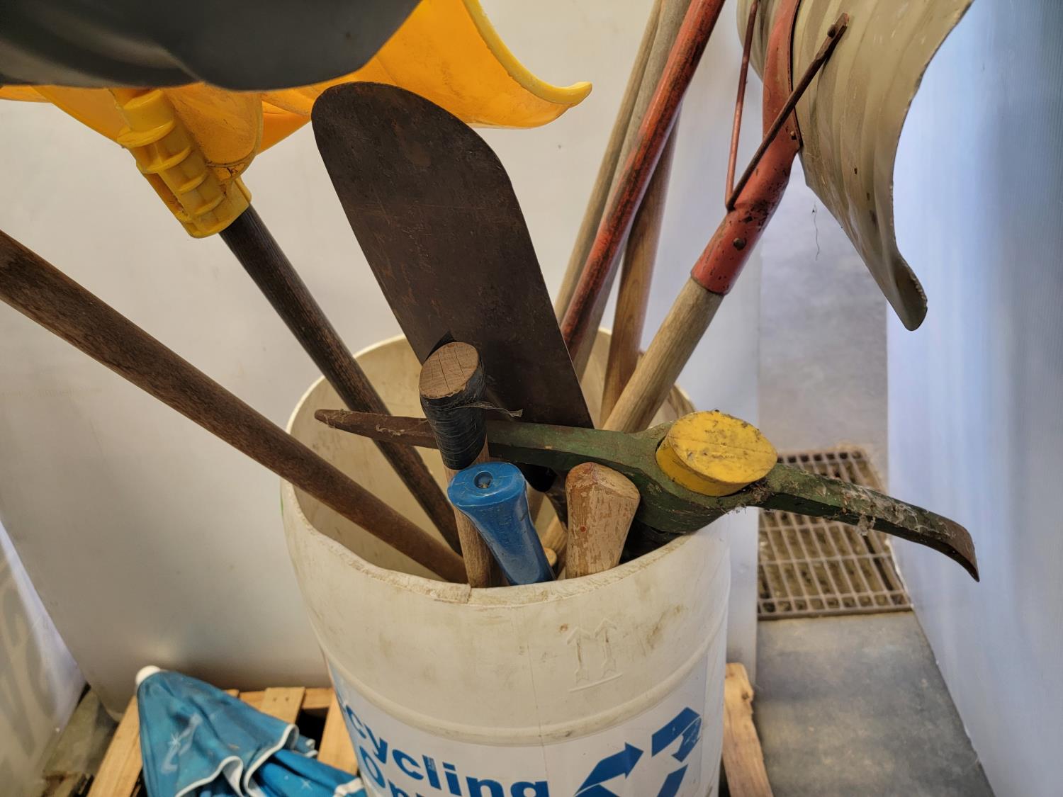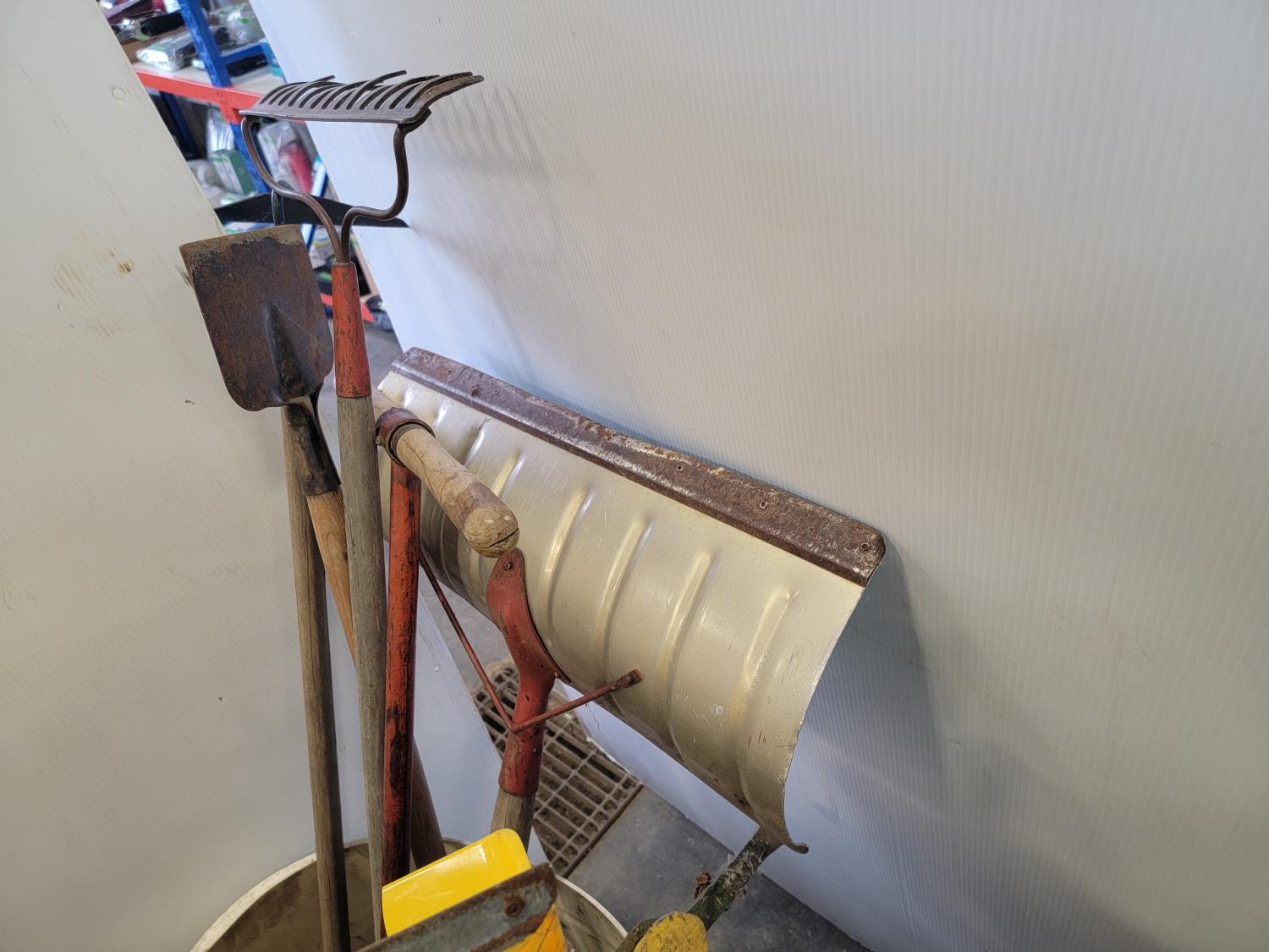 Snow shovels, hoe, rake, beach umbrella, (2) bird feeders, pick axe, wash brush