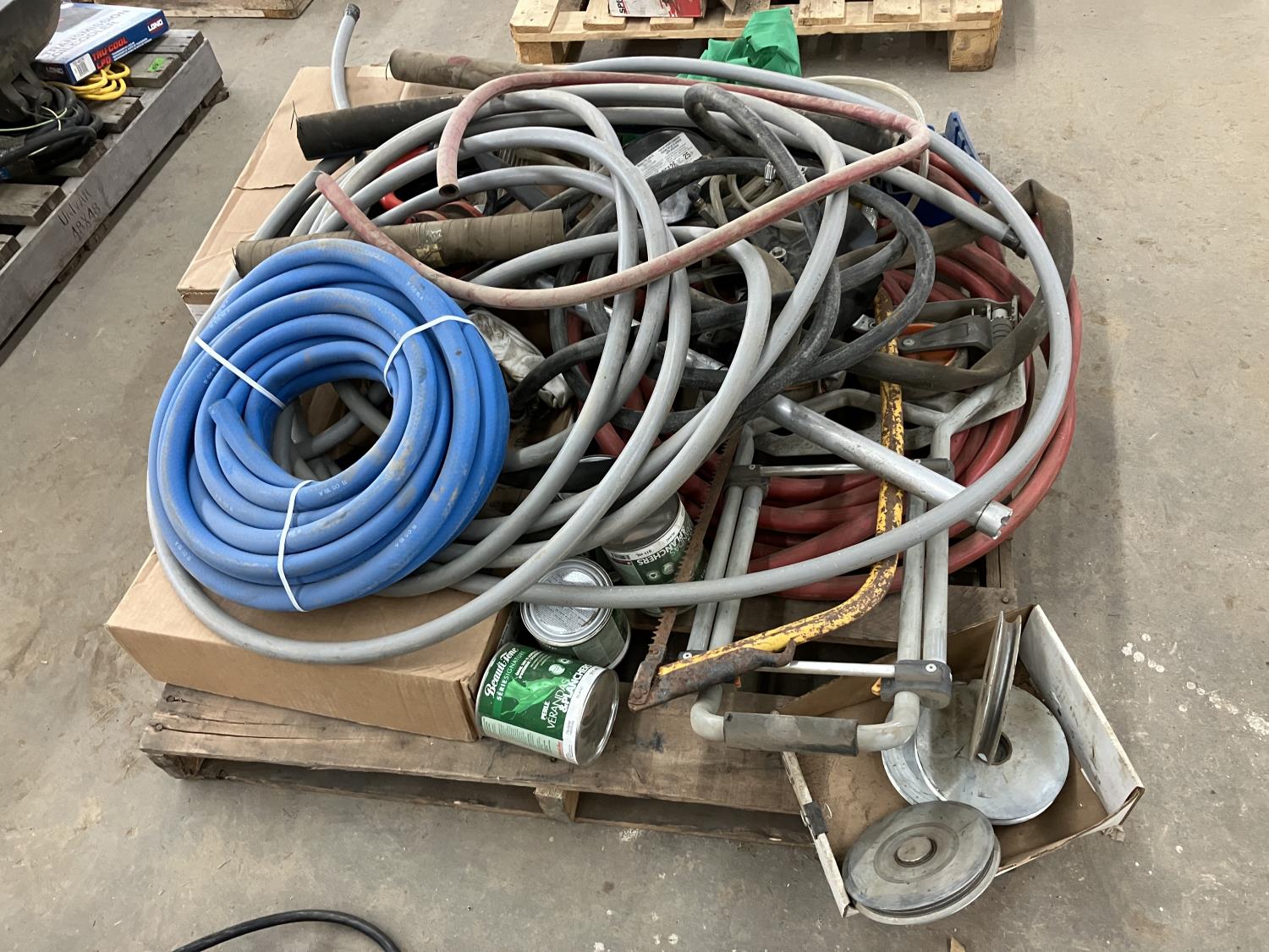Qty of Hose, hand barrel pump, (4) 911 ml white paint, (4) 6 inch pulleys, bow saw, folding dolly, miscellaneous fittings, (70±) ft of blue extreme heater hose