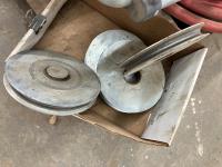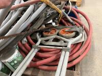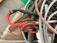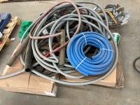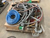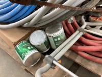 Qty of Hose, hand barrel pump, (4) 911 ml white paint, (4) 6 inch pulleys, bow saw, folding dolly, miscellaneous fittings, (70±) ft of blue extreme heater hose