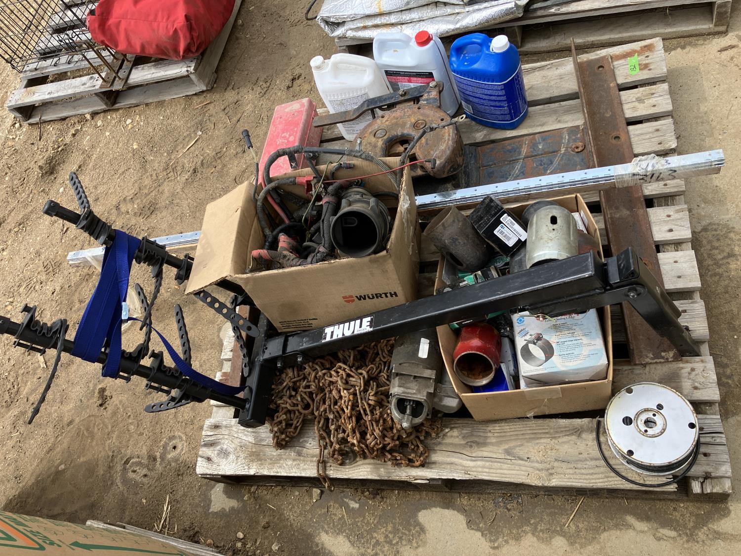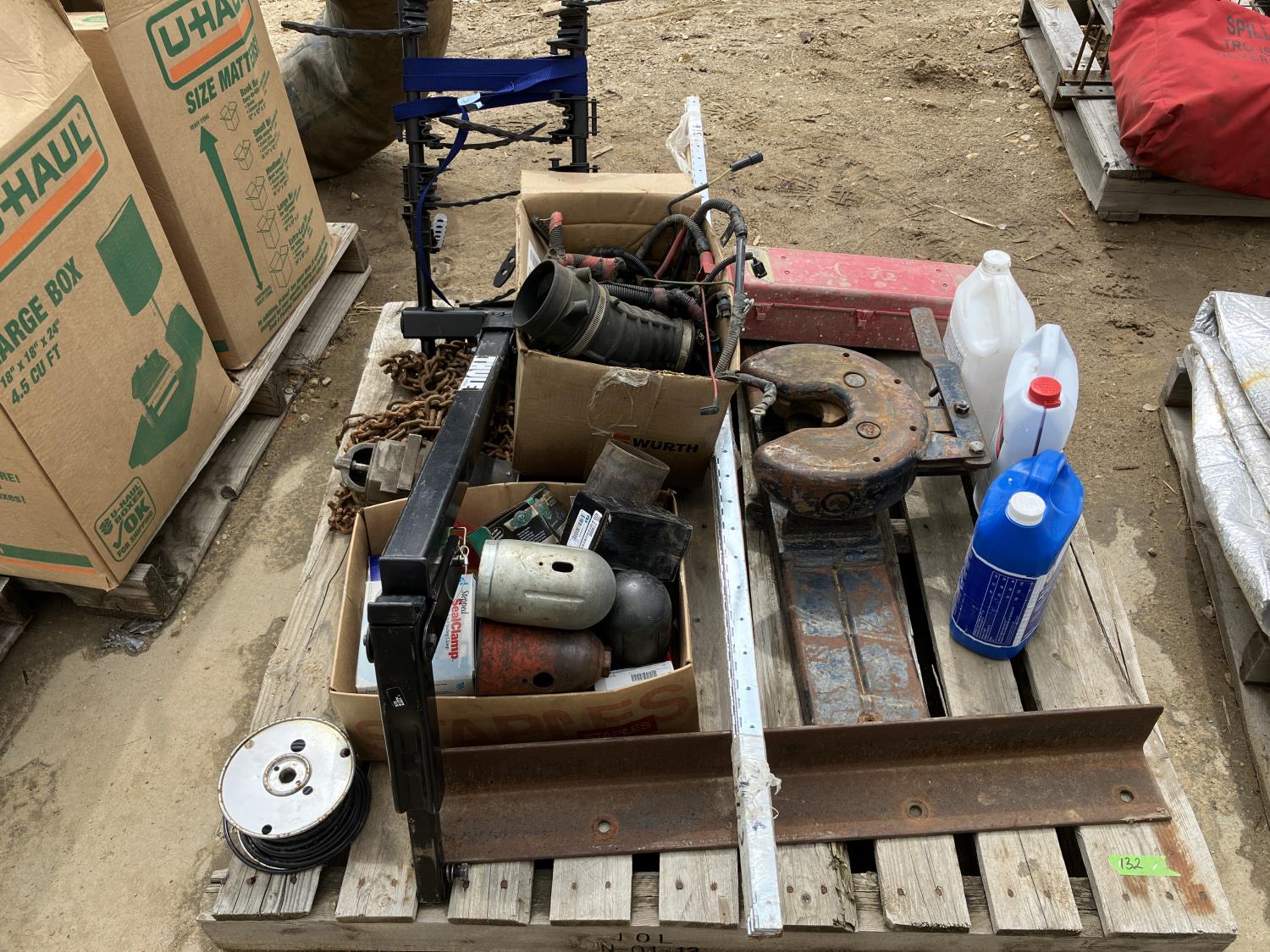 King Pin hitch, tire chains, bottle caps, seal clamps, electrical parts, flares, (2) jugs of antifreeze, miscellaneous