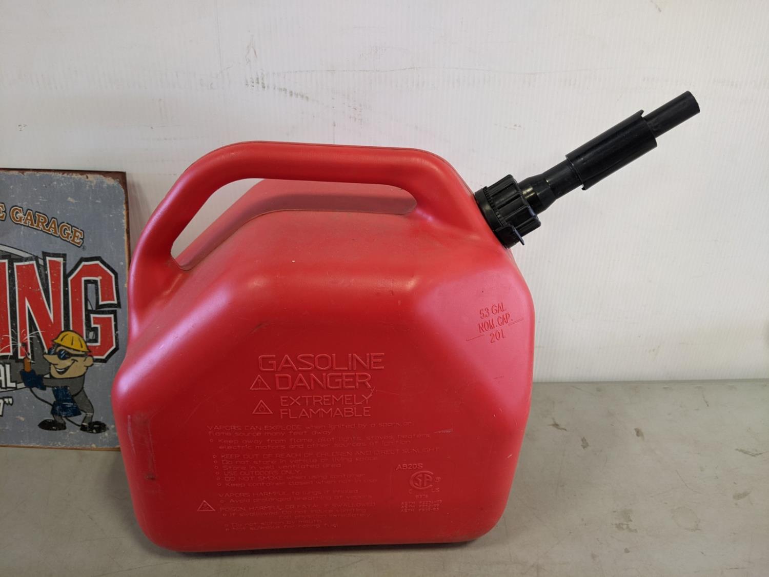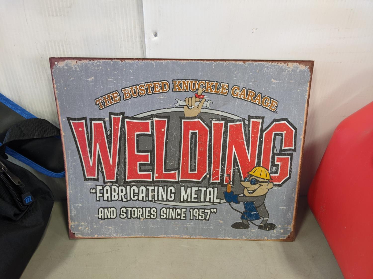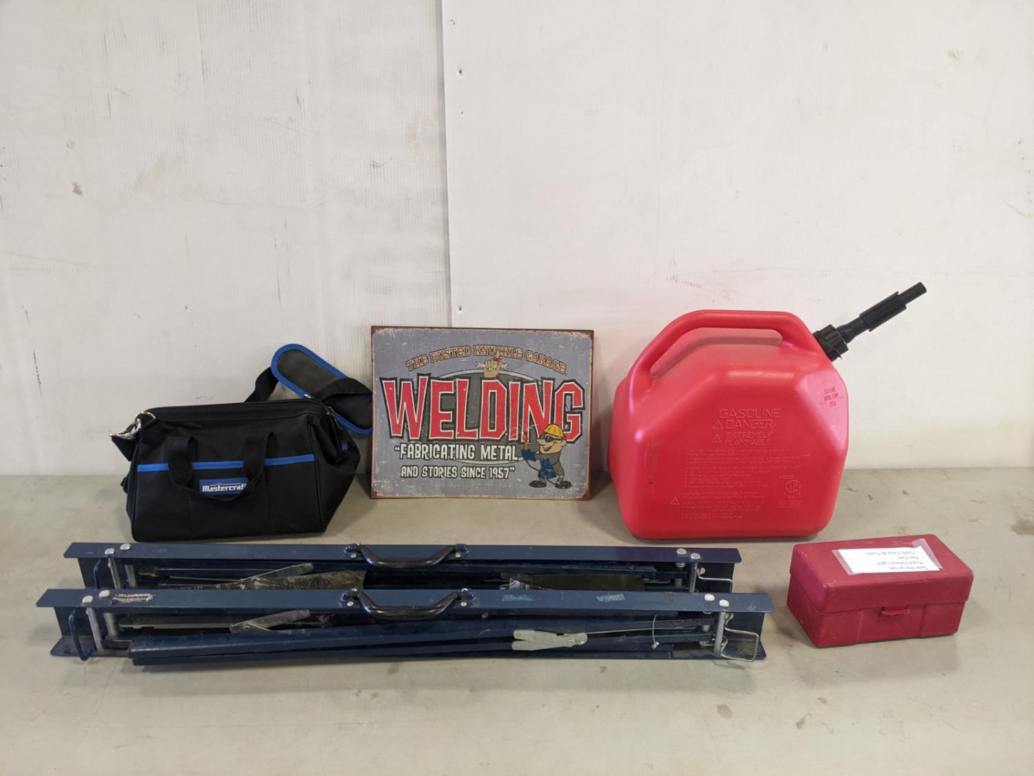 (2) folding sawhorses, road safety lights, jerry can, tin sign