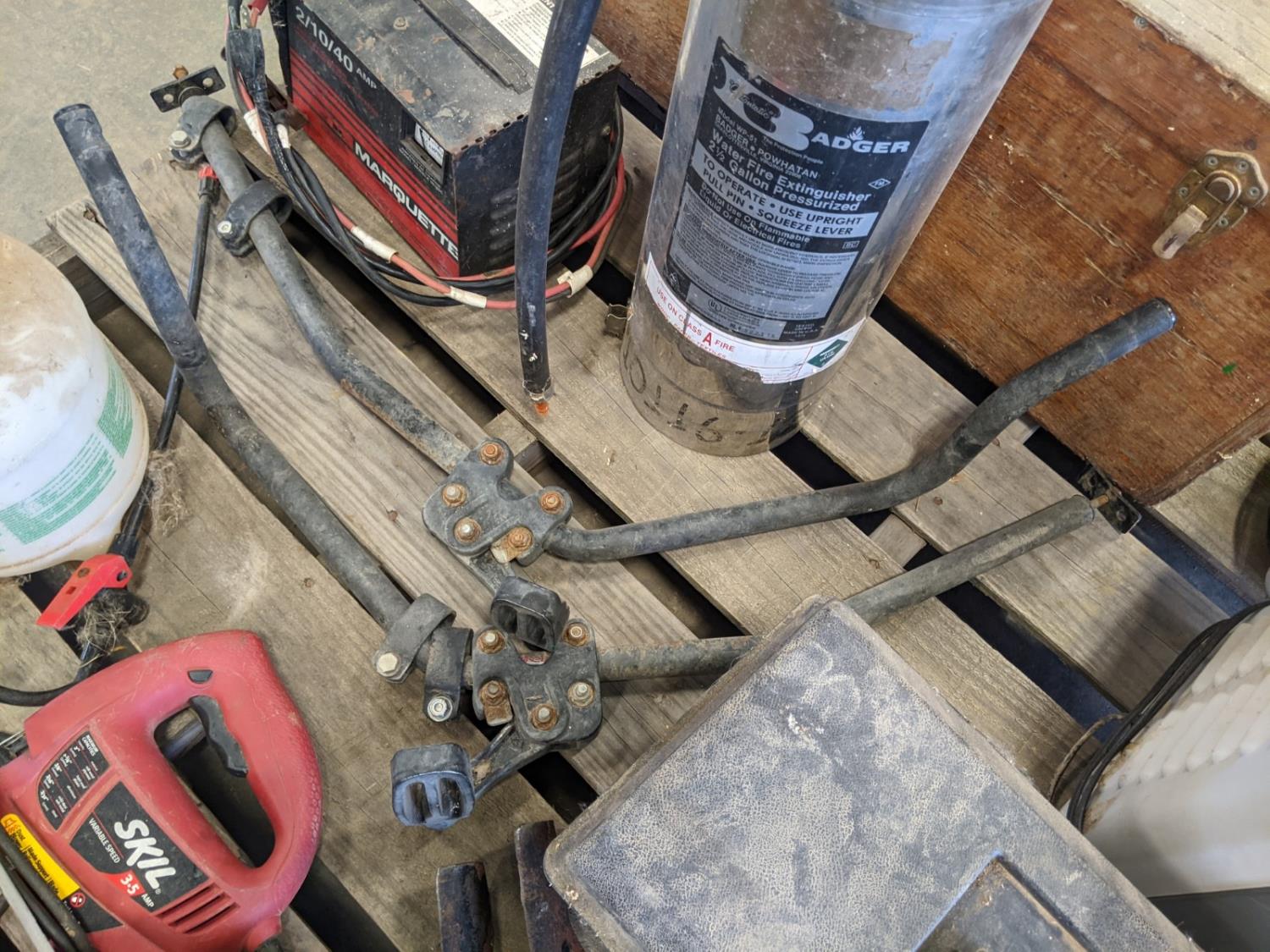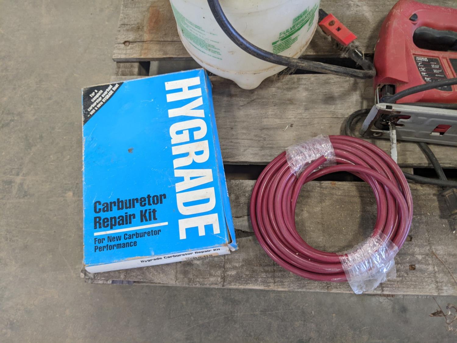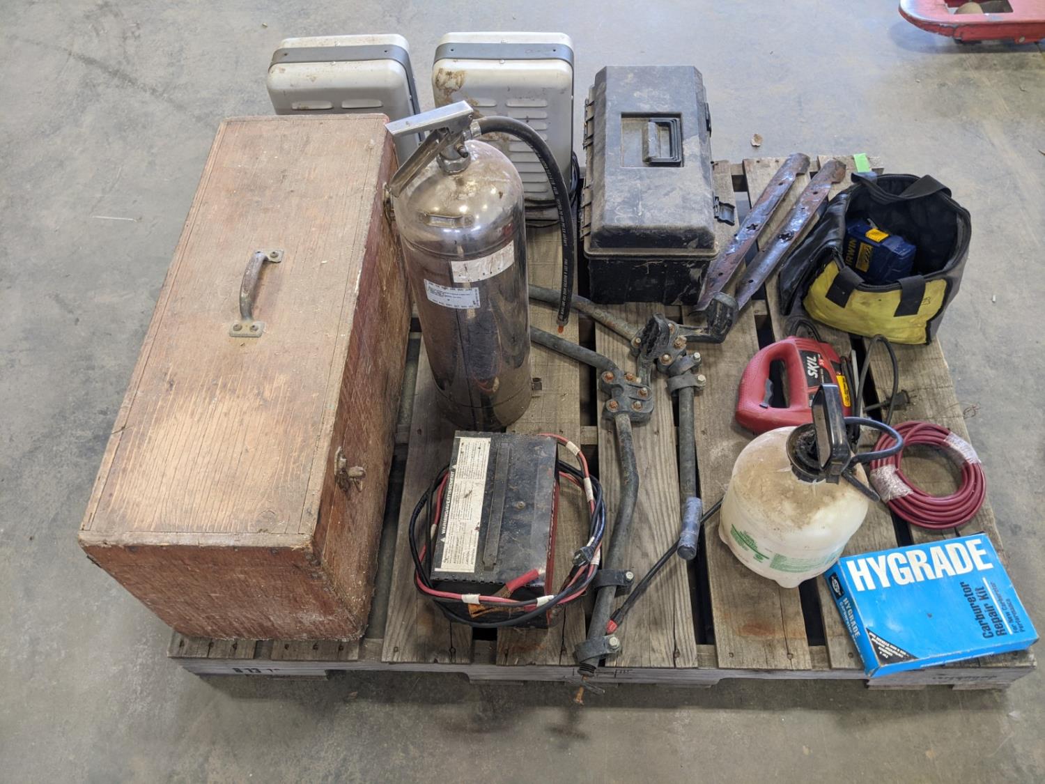 Skil jig saw, Hygrade carburetor repair kit, Marquette 12 volt battery charger, (2) lawnmower blades, toolbox with contents