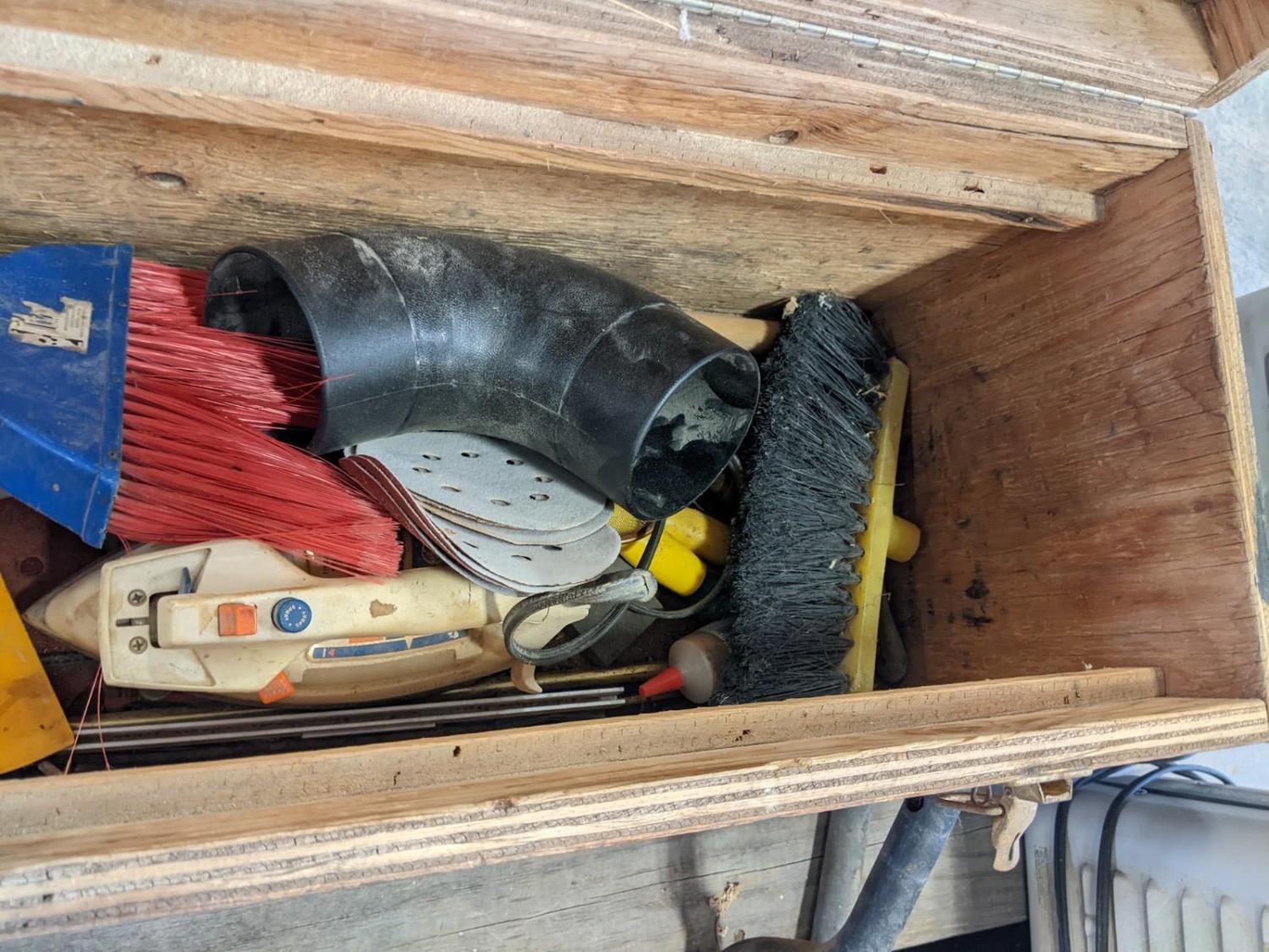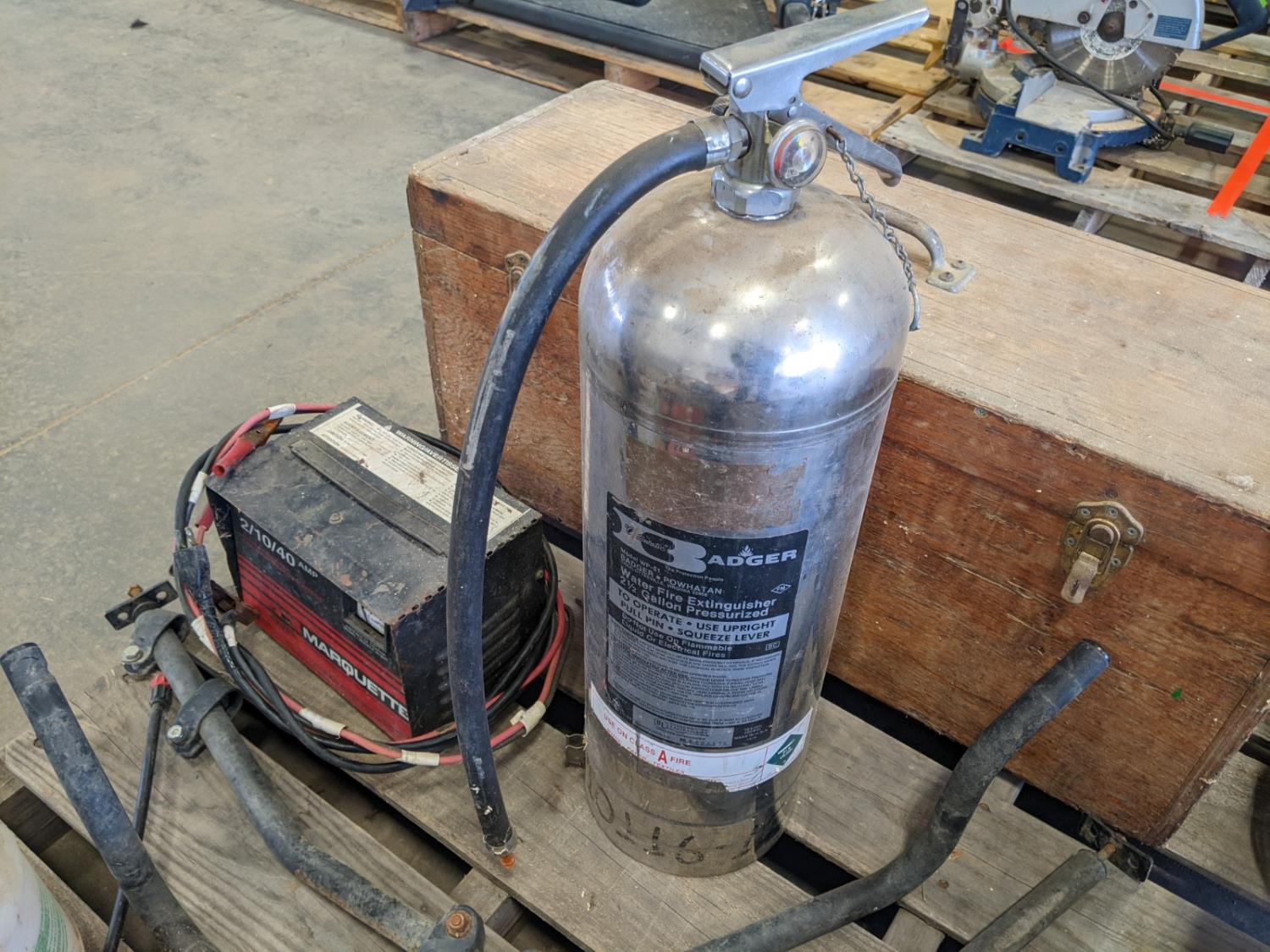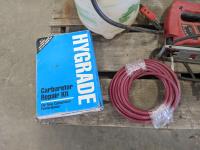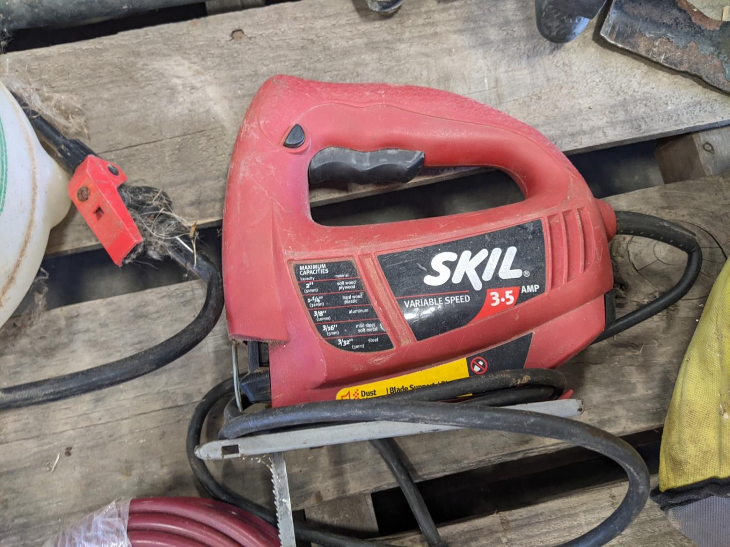 Skil jig saw, Hygrade carburetor repair kit, Marquette 12 volt battery charger, (2) lawnmower blades, toolbox with contents
