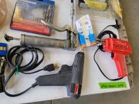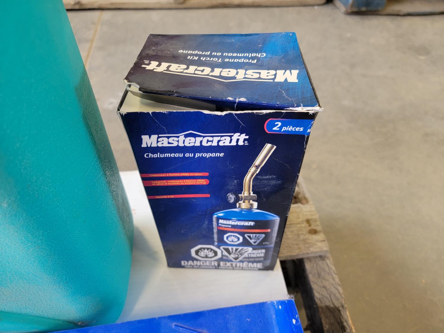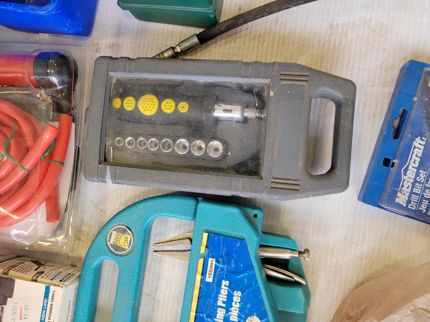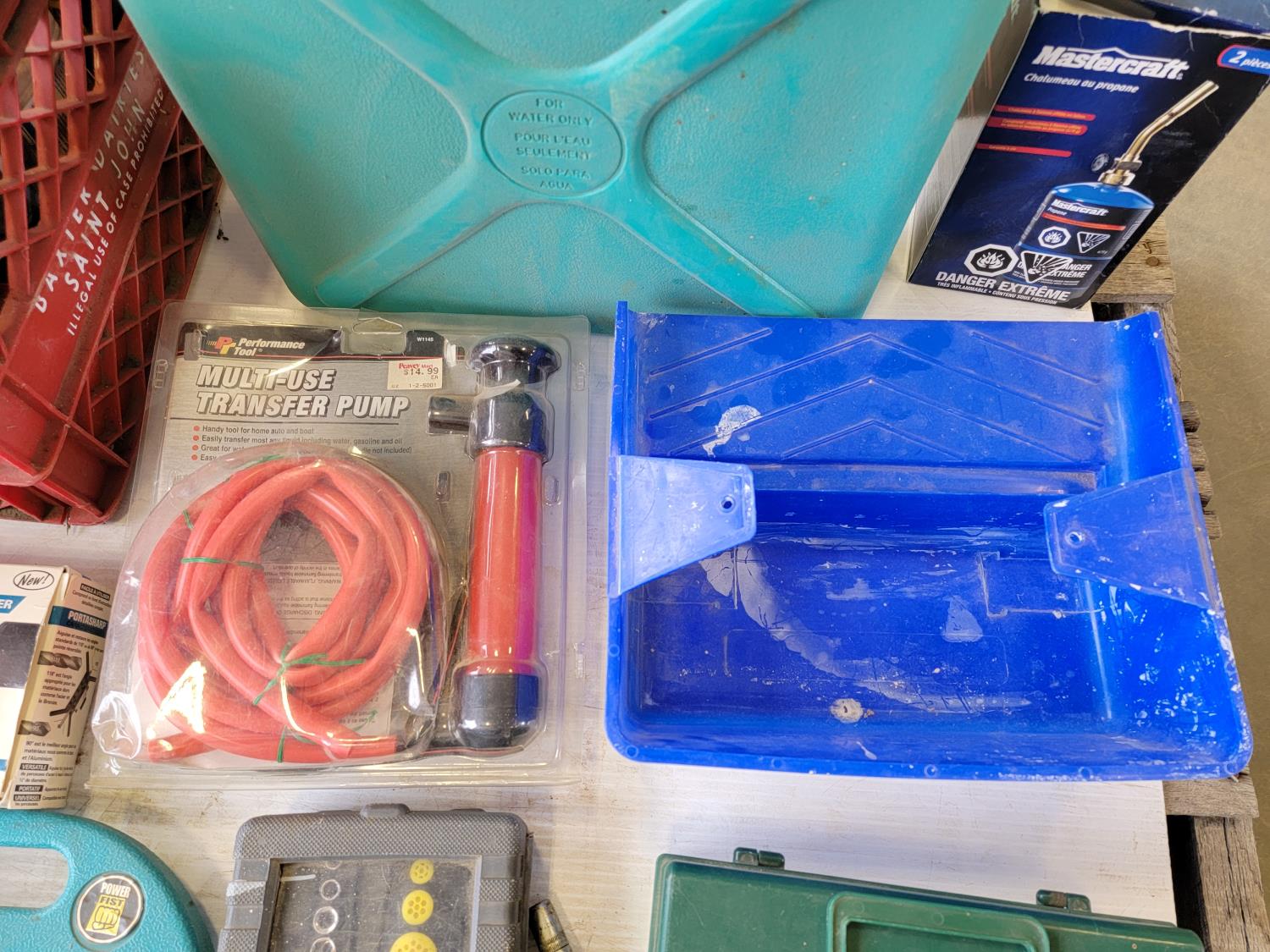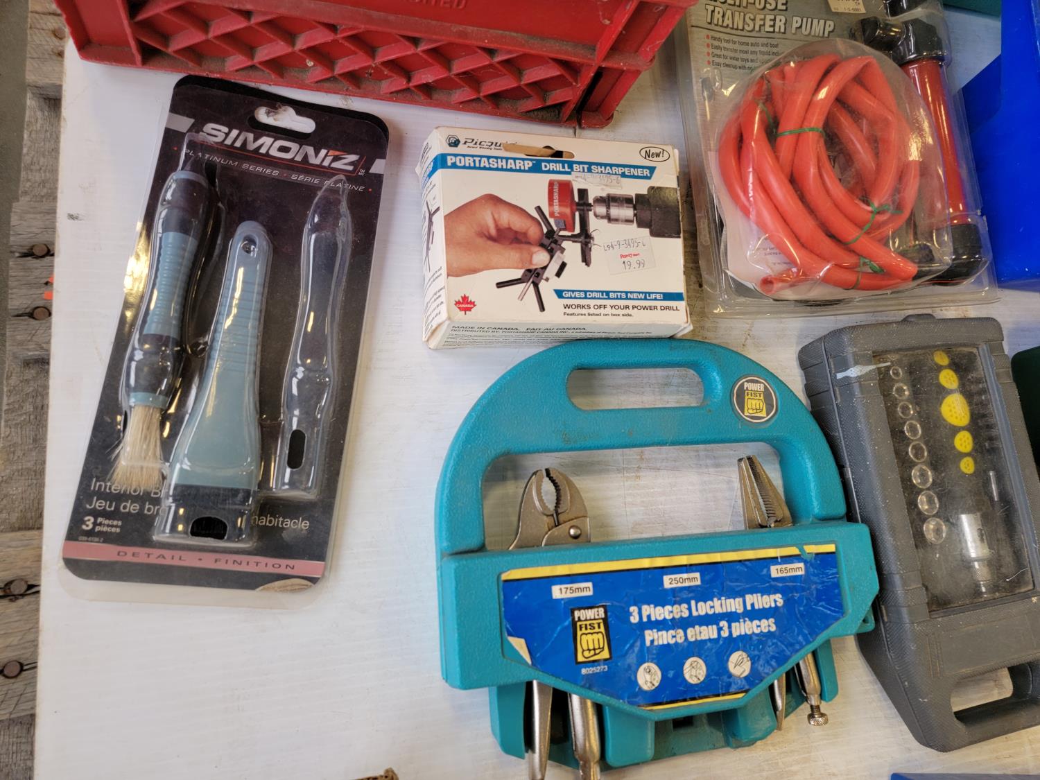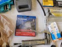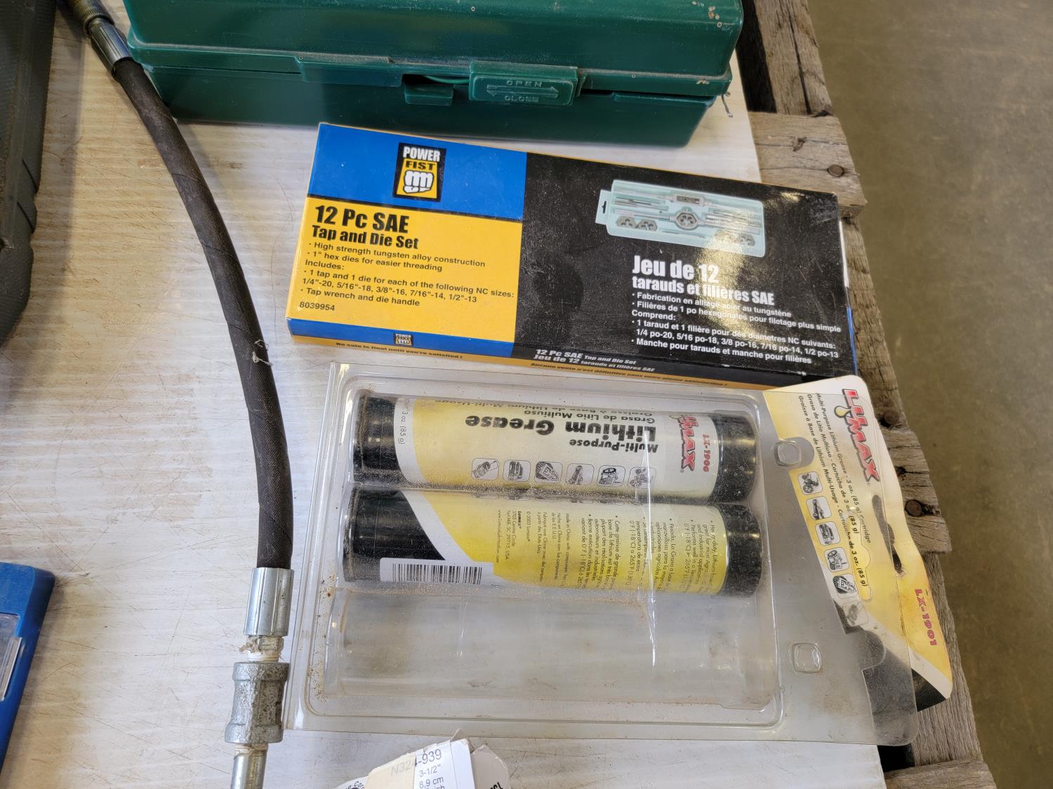 6 inch 2 jaw gear puller, Portasharp drill bit sharpener, drill bits, Powerfist tap & die set, multi-use transfer pump, Mastercraft propane torch
