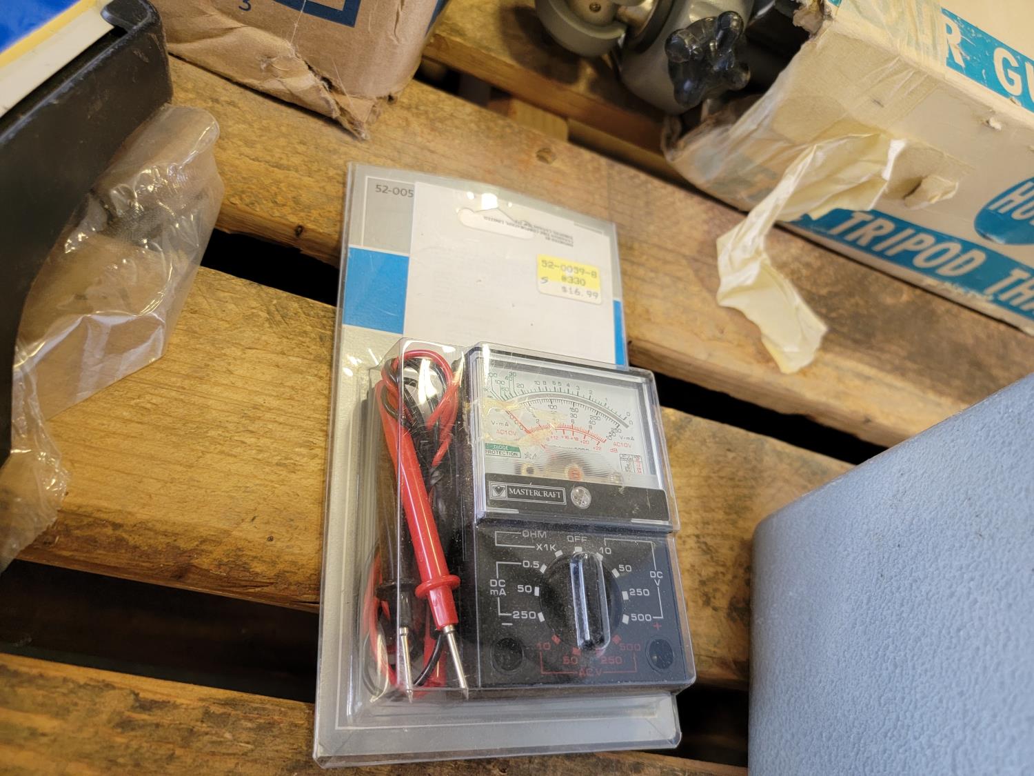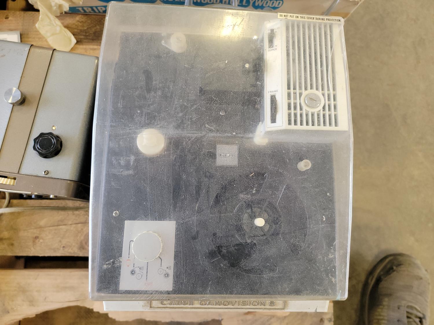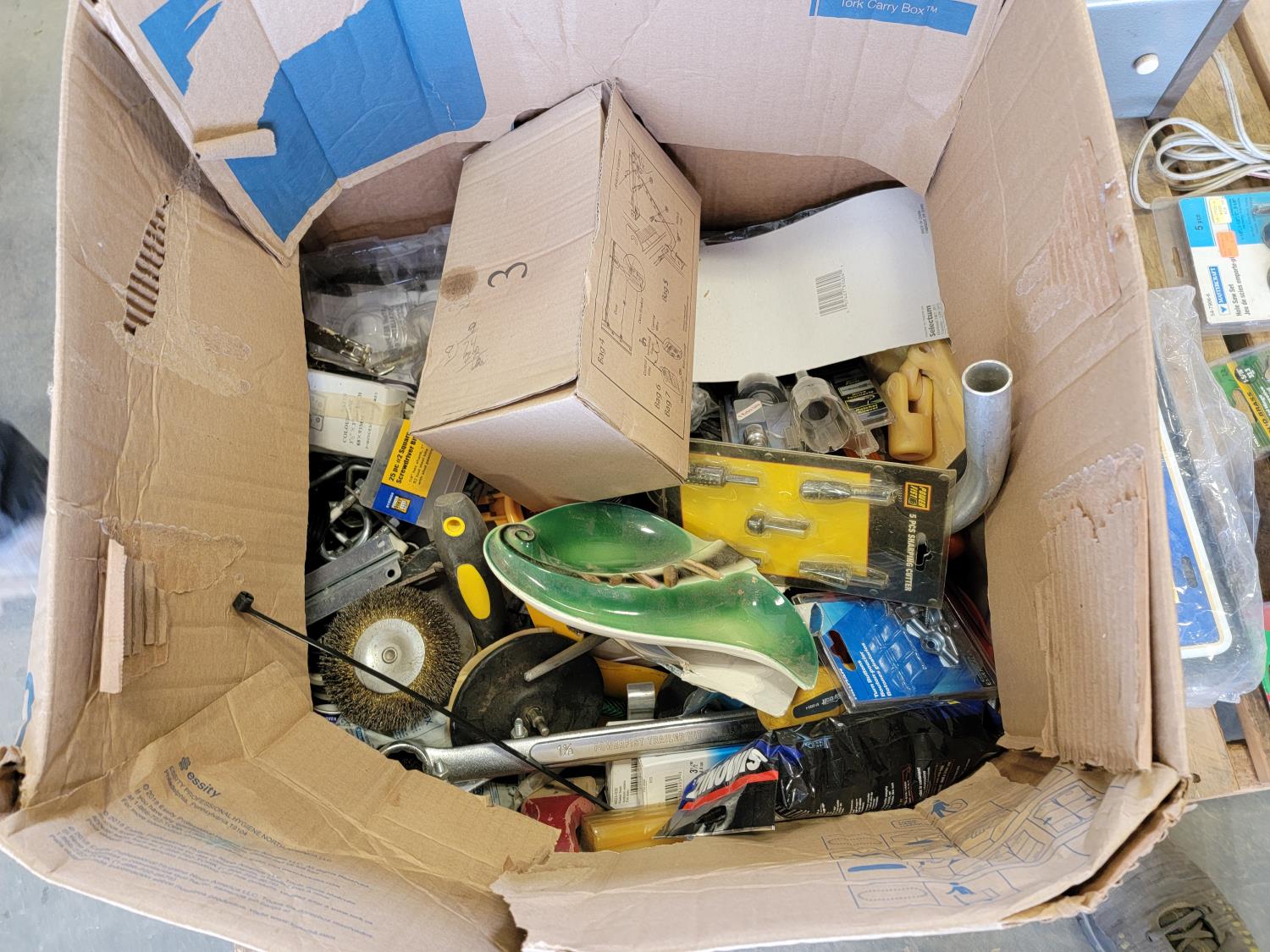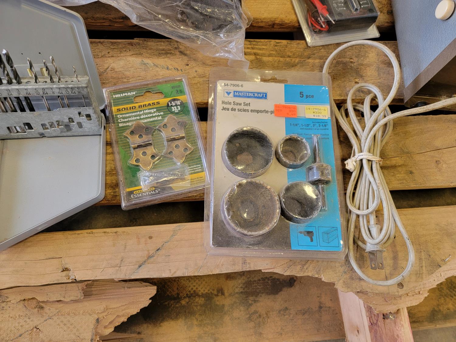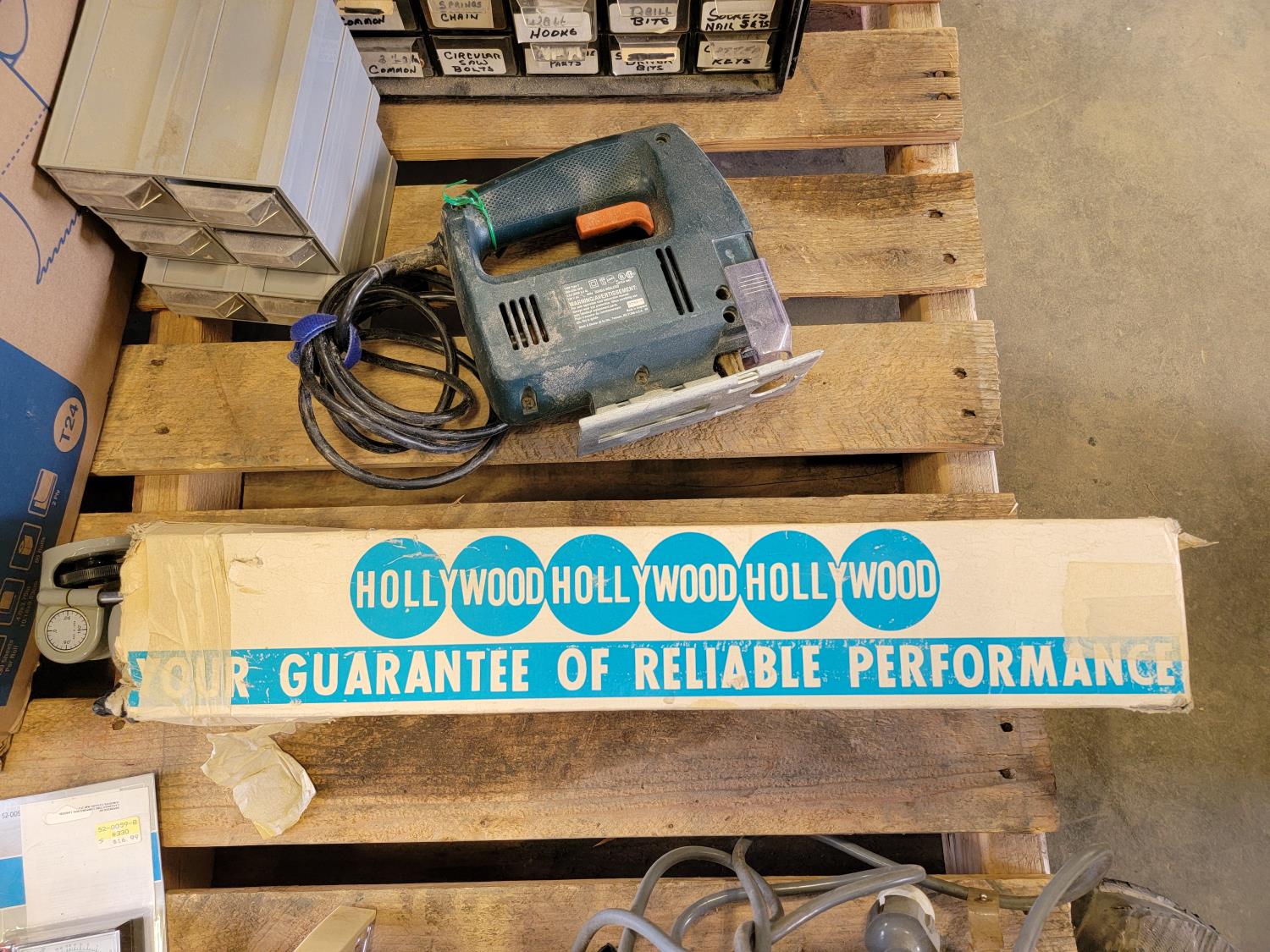 Hole saw set, Black & Decker jig saw, bolt bins, Canon Canovison 8, drill bits, various hardware