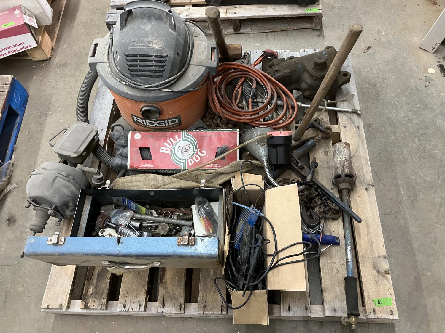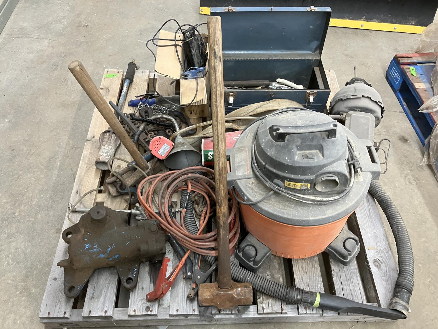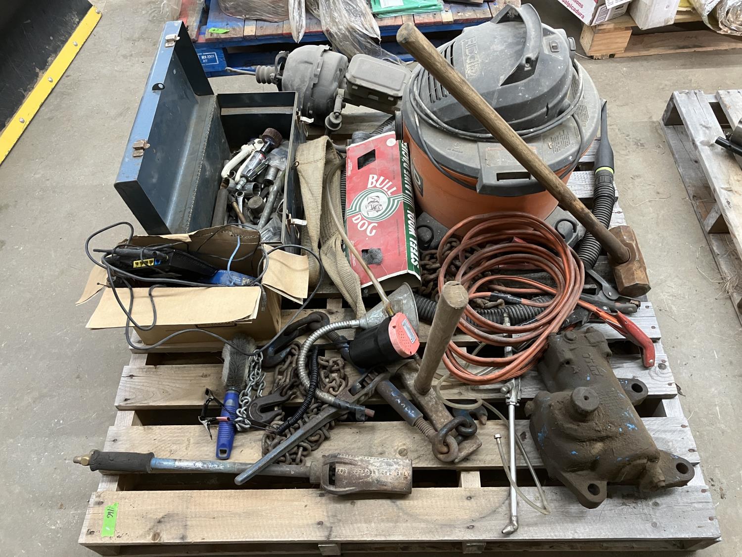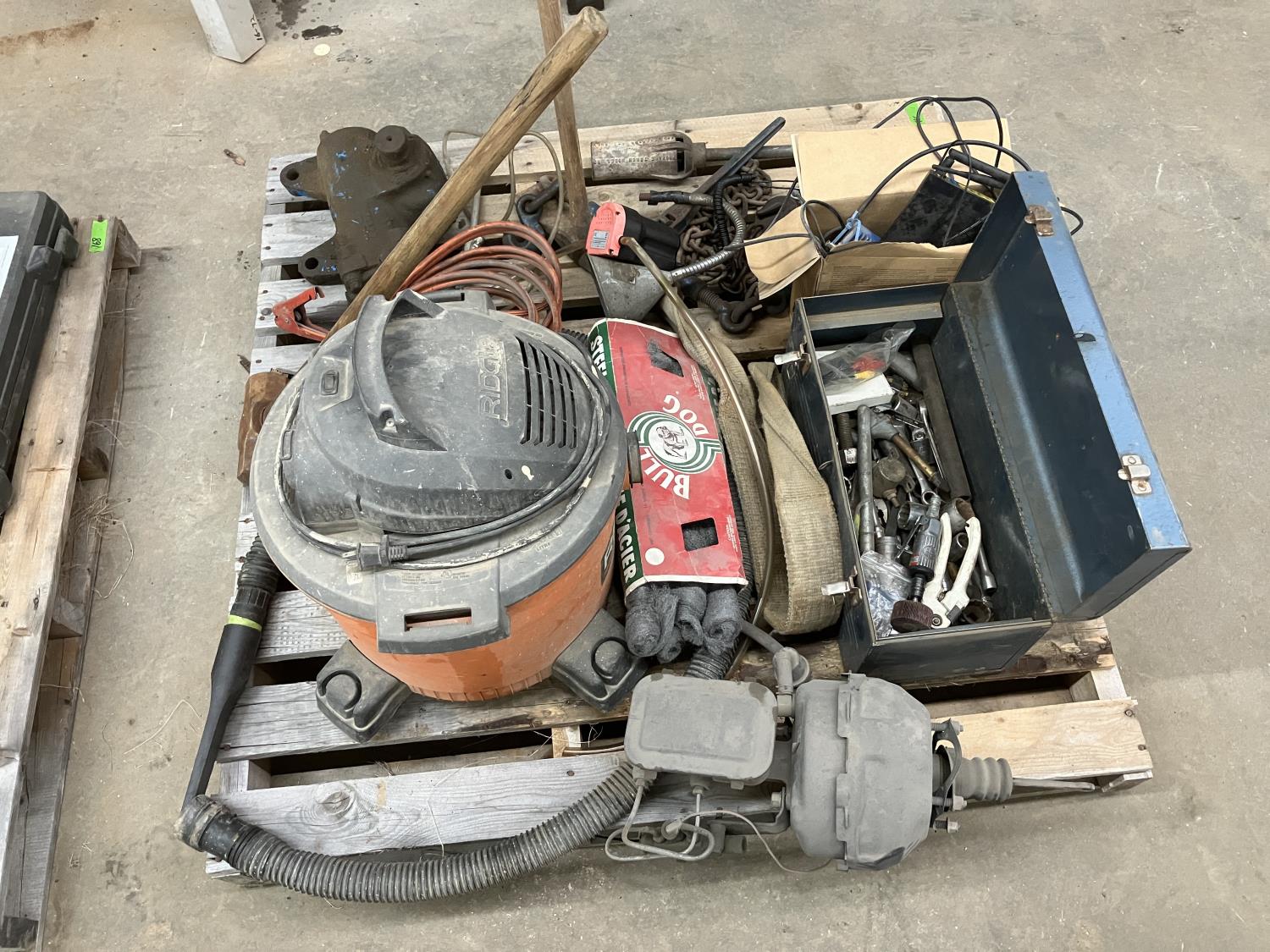tiger torch, chains, ratchet load binder, small tool box with contents, Ridgid shop vac, miscellaneous items