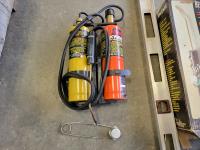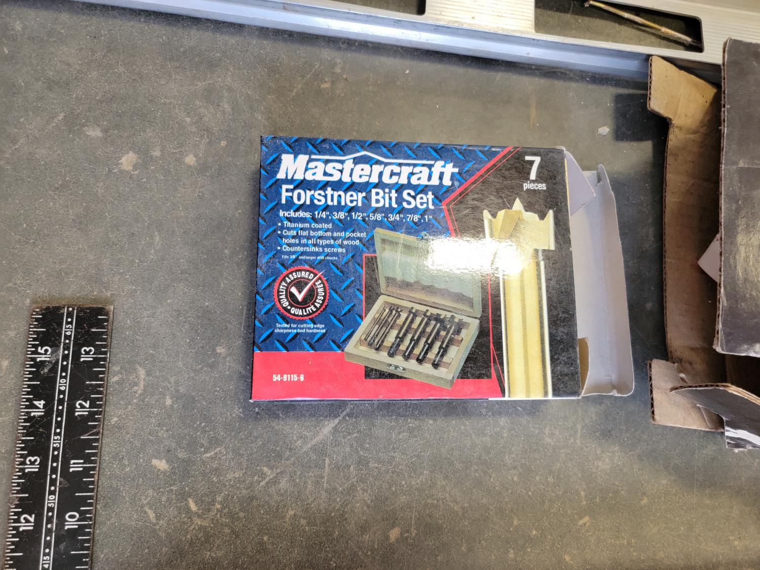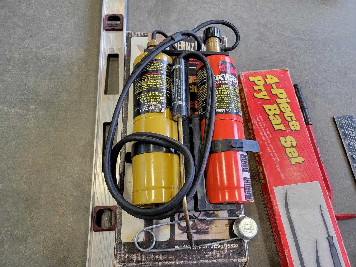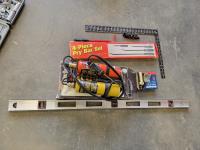 Carpenter square, 4 piece pry bar set, Mastercraft Forstner bit set, BernzOmatic torch, 4 ft level